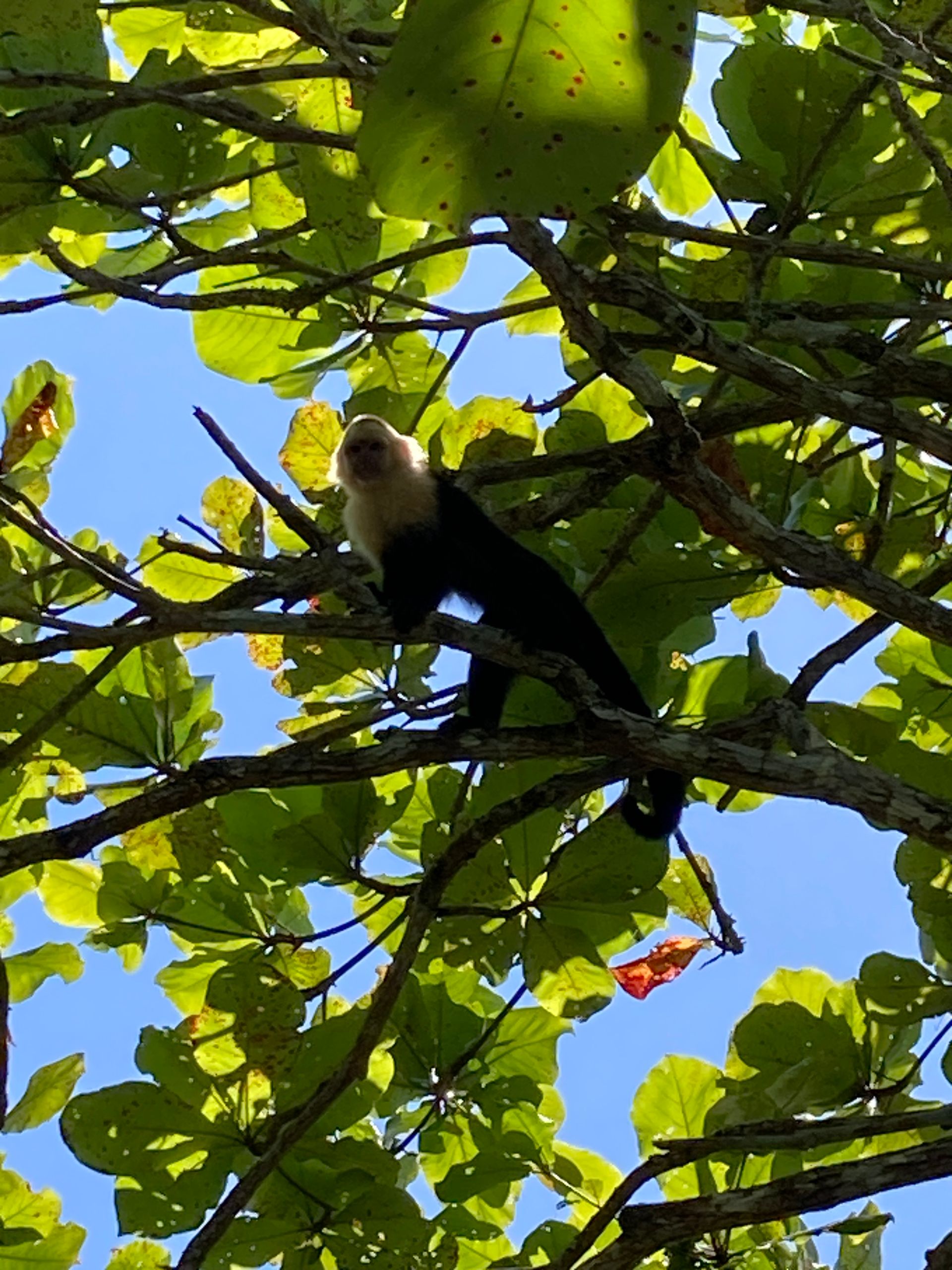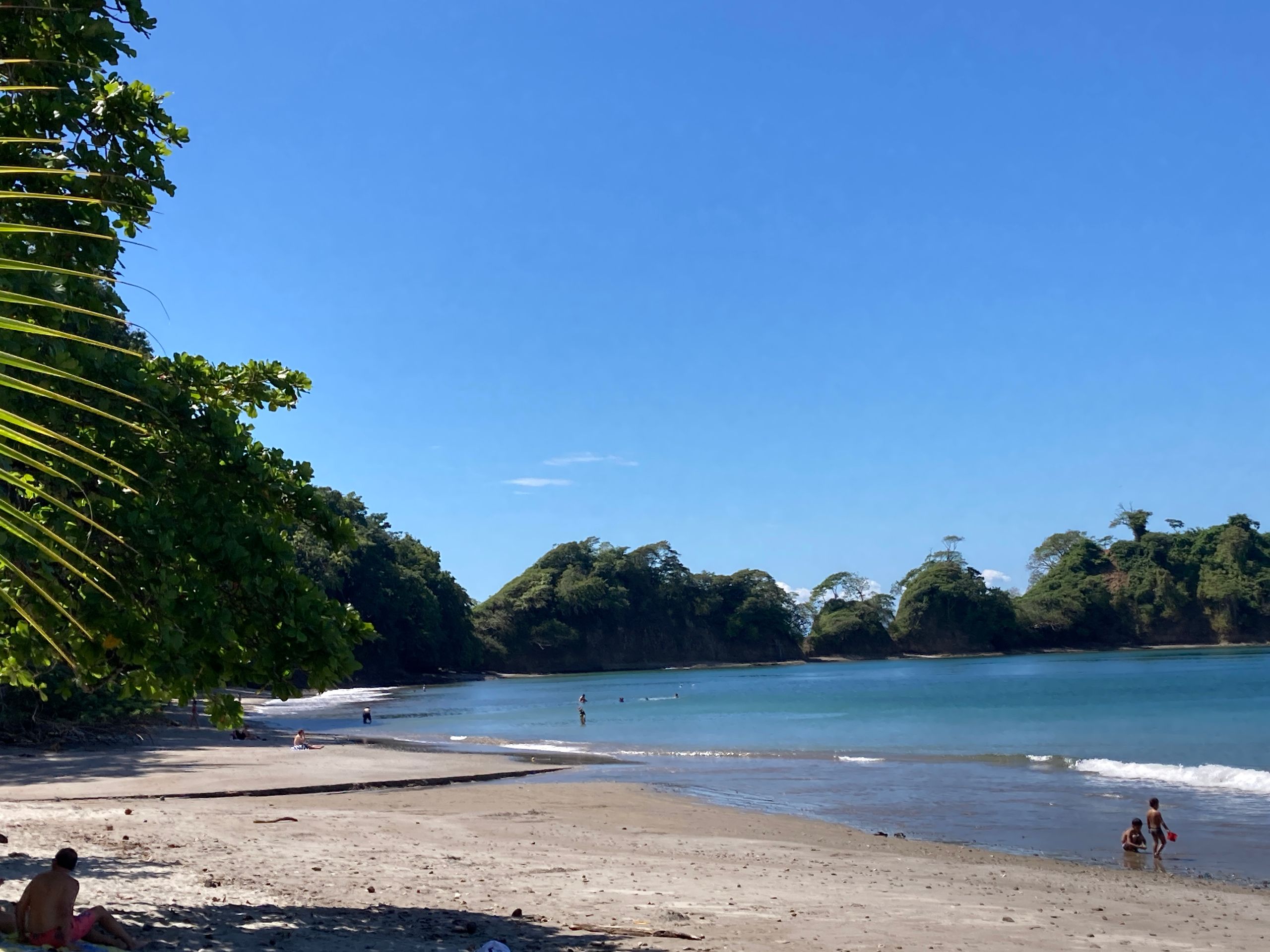 Am Mittwoch wollten wir zum 2. Mal an den Pazifik fahren, diesmal an einen anderen Strand. Was hier in Costa Rica mit Sicherheit nicht verlässlich ist, ist die Wetterapp und die voraussichtliche Fahrzeit zu einem Ziel. Wir hatten für die knapp 90 km mit zwei Stunden Fahrt gerechnet. Insgesamt waren wir hin und zurück 7 Stunden unterwegs. Hin ging es eine sehr kurvenreiche Strecke durch die Berge, eine wunderschöne Fahrt aber anstrengend. Zurück die Schnellstraße, die aber keine war, da es viele Staus gab. Aber der Strand Playa Mantas war ein Traum. Wir wurden gewarnt vor Affen. Aber Strand setzte ich nur kurz meine Tasche mit Getränk und Bananenchips ab – und wie aus dem Nichts klaute ein Affe mir die Chips und verschwand im Baum. Wir passten danach um so mehr auf unsre persönlichen Gegenstände auf, besonders auf Handy und Geld. Wir fanden einen Platz unter Palmen, einfach nur schön. Es war deutlich heißer als in San José. Auch das Baden war traumhaft; so warm haben wir den Pazifik noch nie erlebt. Wir blieben nur 2,5 Stunden, denn wir wollten nicht im Dunkeln fahren, und es wird hier schon um kurz nach 17:00 dunkel.