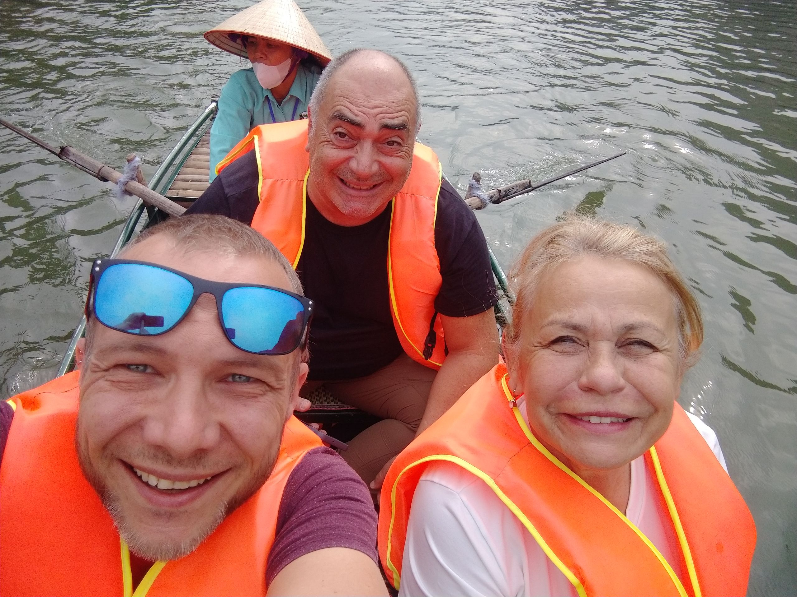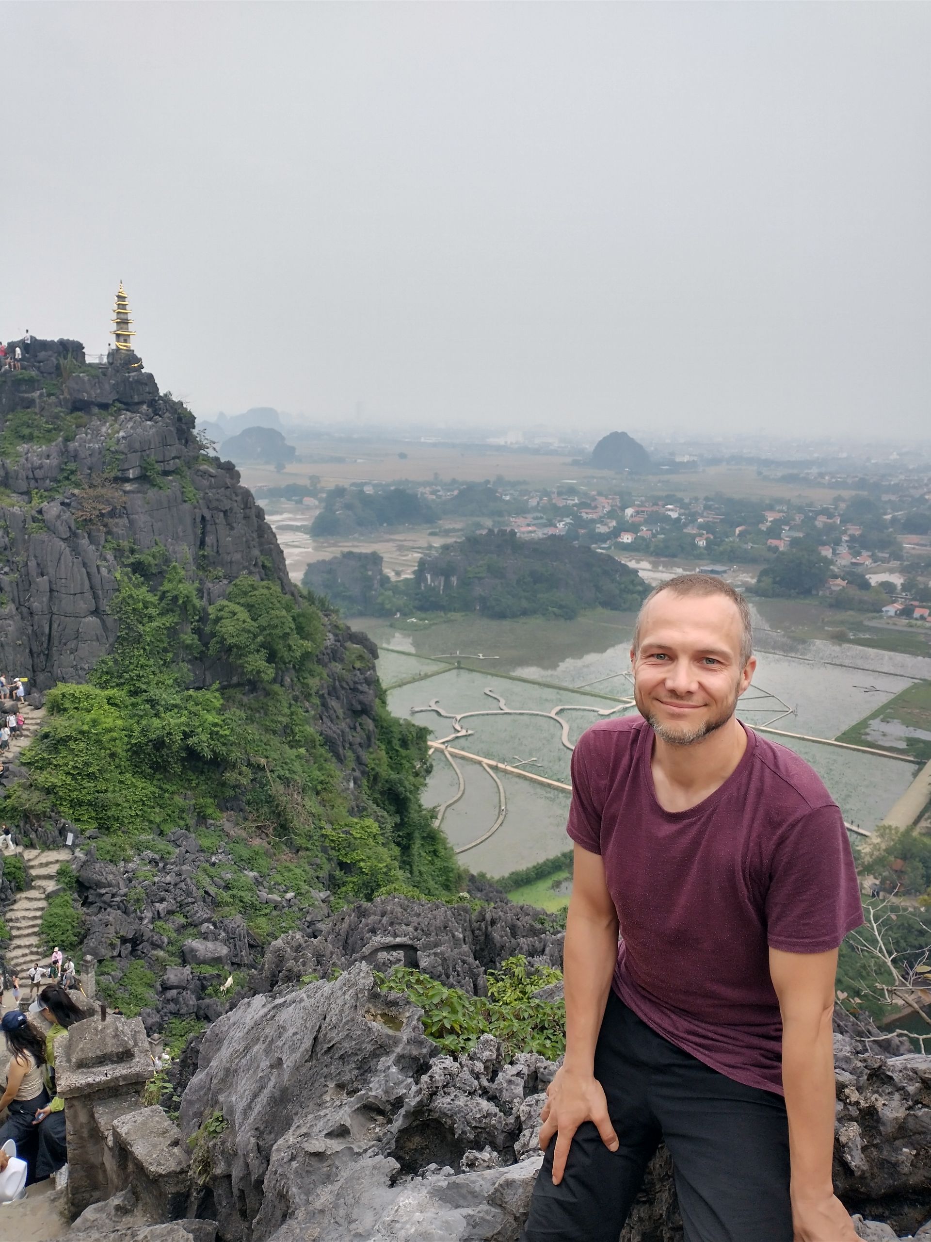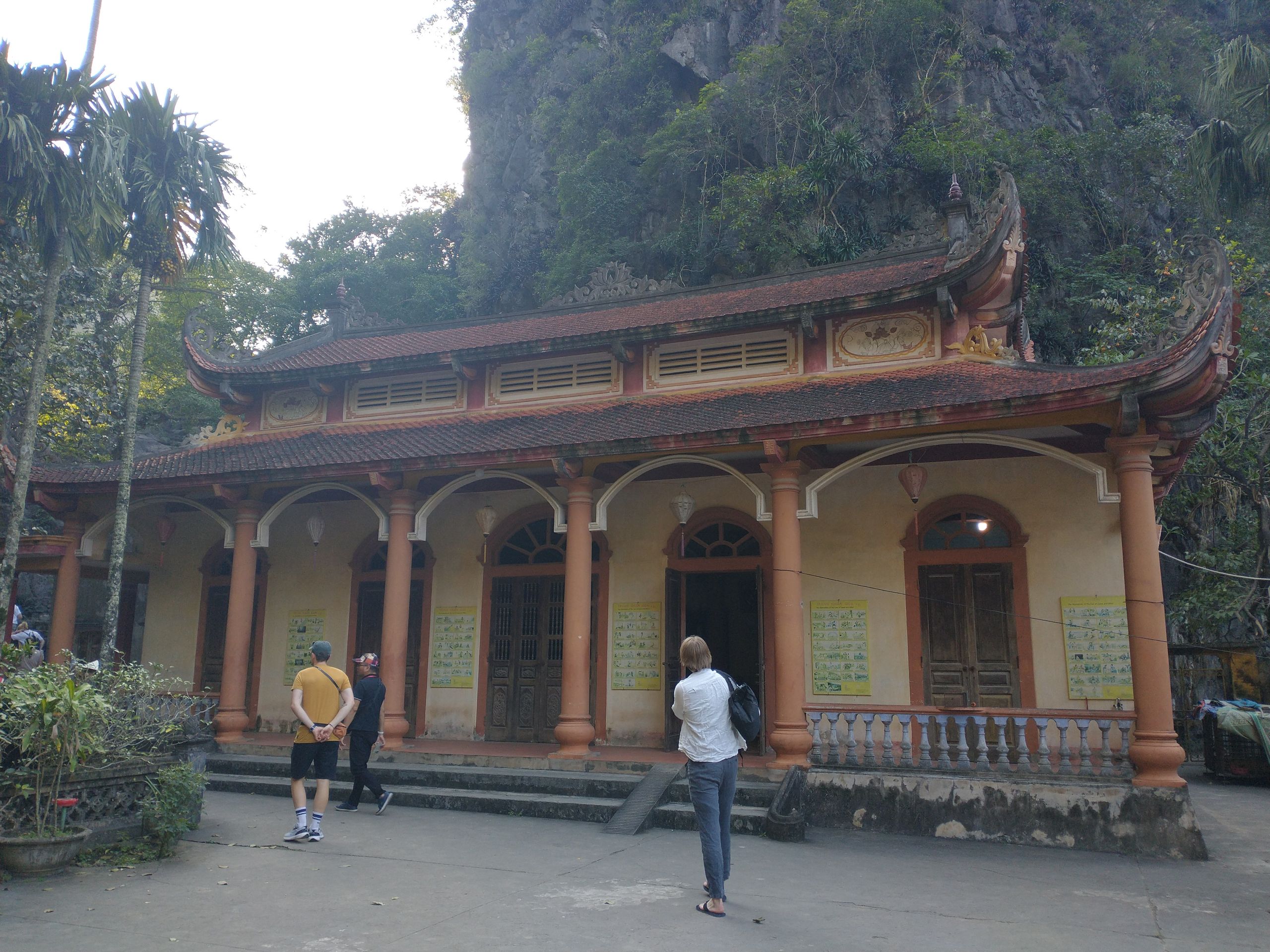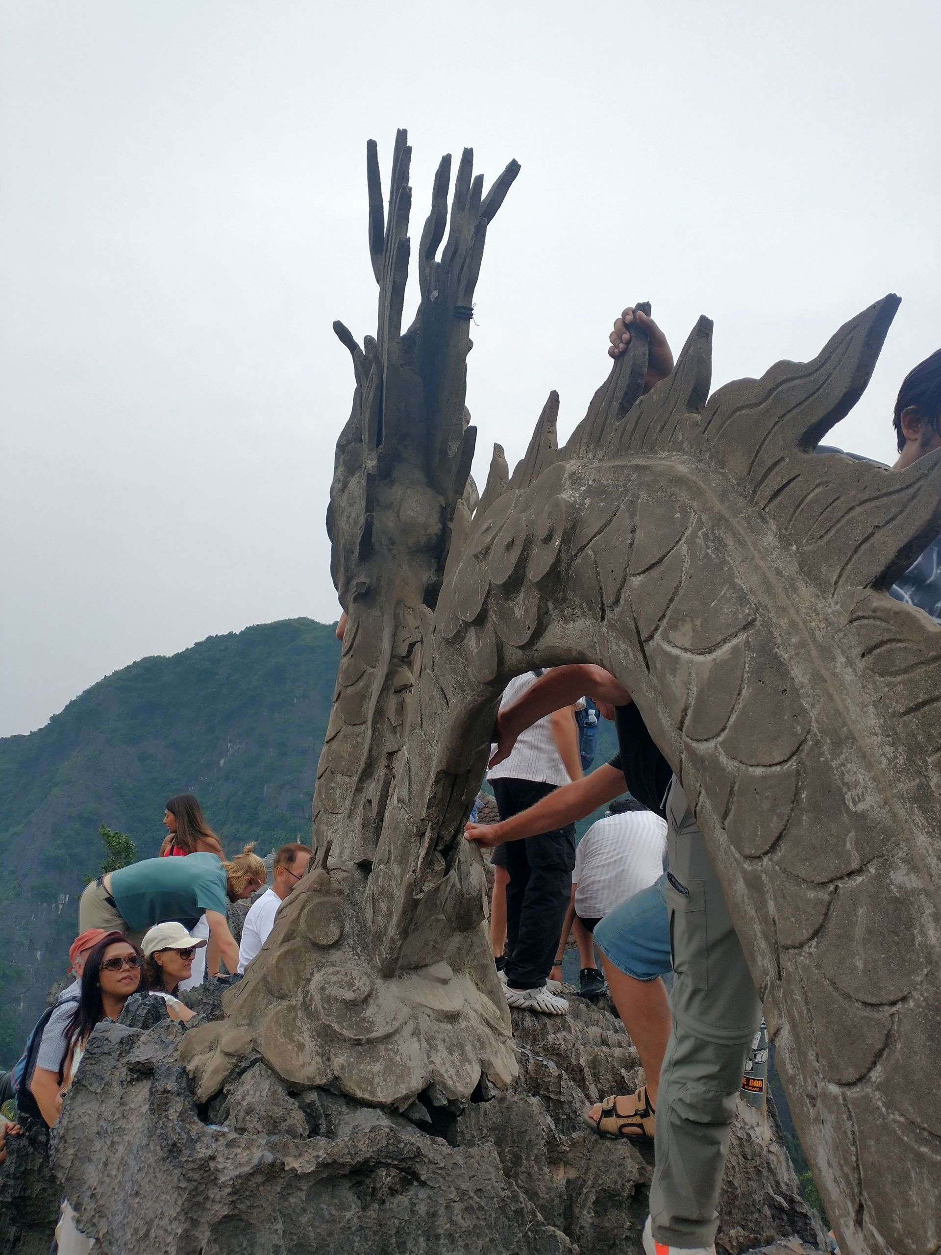 Sonntag, ich habe eine Tour gebucht, wir sammeln alle auf, viele Italiener. Okay, dann halt Sizilianer, wenn ihr drauf besteht. Zuerst geht es zu einem See, Trang An. Wir werden auf kleine Ruderboote aufgeteilt und es geht 2 Stunden über den See und durch lange Höhlen (Kopf einziehen). Mehrere hundert solcher Boote sieht man und zu 99 % sind es Frauen, die diese Arbeit machen. Diese Kaltsteinformationen sind sehr interessant und ganz anders als der Kalkstein in Jena. Hunderte Millionen Jahre musste sich der Muschelkalk ablagern, dann folgten Erdbewegungen und Erosion, was wieder 300 Millionen Jahre gedauert hat. Faszinierend. Zum Mittagessen gibt es Ziege, das ist hier eine lokale Spezialität. Bisschen zäh. Danach geht es zur Bai-Dinh-Pagode, relativ neu und voll mit Superlativen. 10.000 kleine Buddhastatuen und 500 lebensgroße Statuen aus der ganzen buddhistischen Welt, die wichtige Gelehrte zeigen. Komisch sind die kommunistischen Symbole überall. Ein riesiger Turm steht da, aber kleiner als das Ho-Chi-Minh-Mausoleum. Religion hat sich unterzuordnen. Zwei riesige Tempel mit riesigen Buddha-Statuen, eine eher vietnamesisch, eine eher indisch mit vielen Armen und Köpfen. Nächste Station ist die Mua-Höhle. Stellt sich heraus, das ist keine Höhle, sondern ein Berg, wieder etliche Stufen hoch, viel zu viele Menschen. Letzte Station, obwohl nicht gebucht: noch einmal Huo Lo, die erste Hauptstadt. Es ist spät und wir werden schnell durchgeführt. Das erste Mal, dass ich nach Trinkgeld gefragt werde. Sonst nicht üblich hier, man bekommt immer passend Wechselgeld. Ich habe noch das Hostel gewechselt, war aber unnötig, auch gähnende Leere dort. Auf Empfehlung von Lyly habe ich noch was Traditionelles gegessen. Eigentlich wollten wir uns treffen, hat aber nicht geklappt. Insgesamt ist Ninh Binh überbewertet.