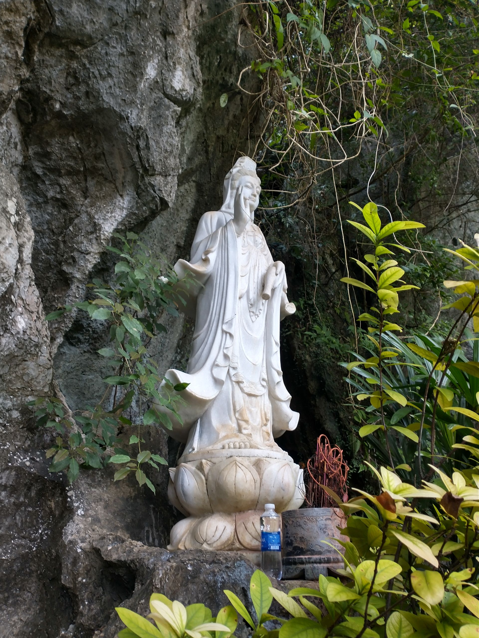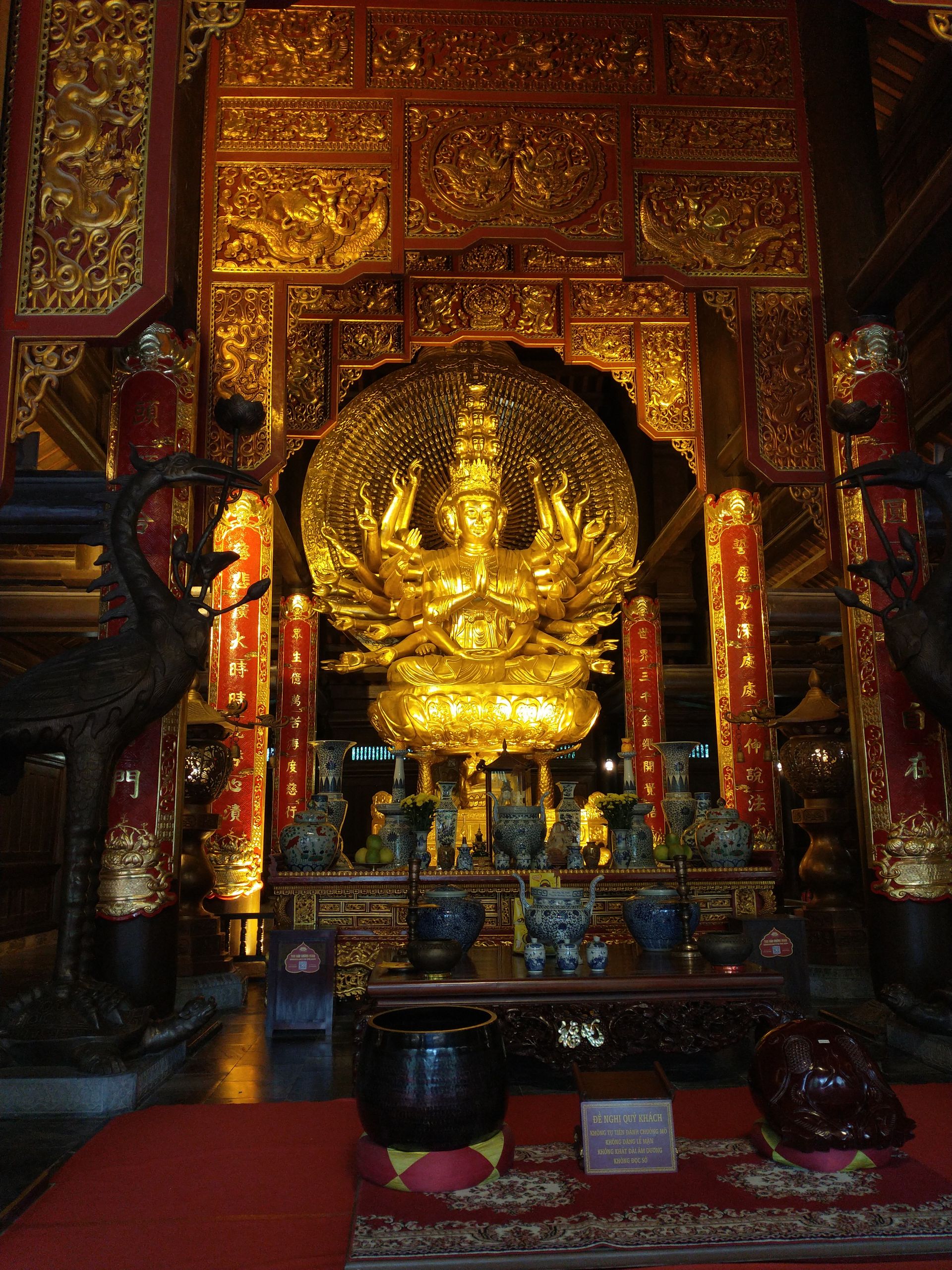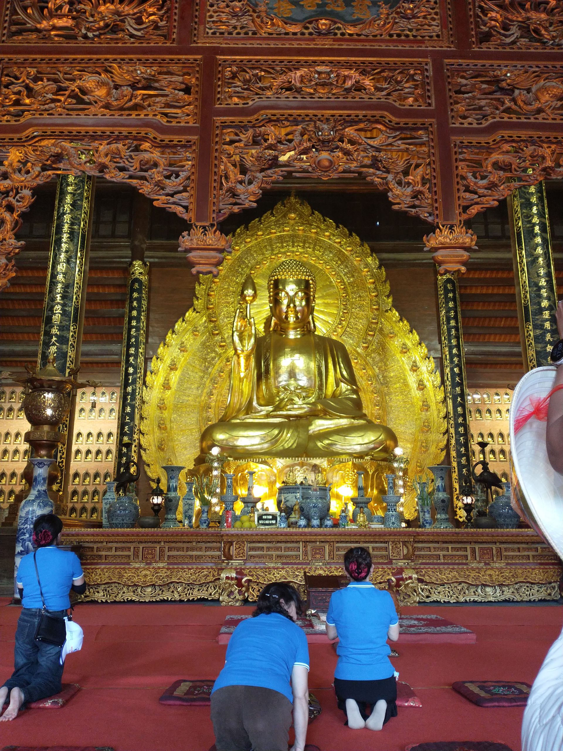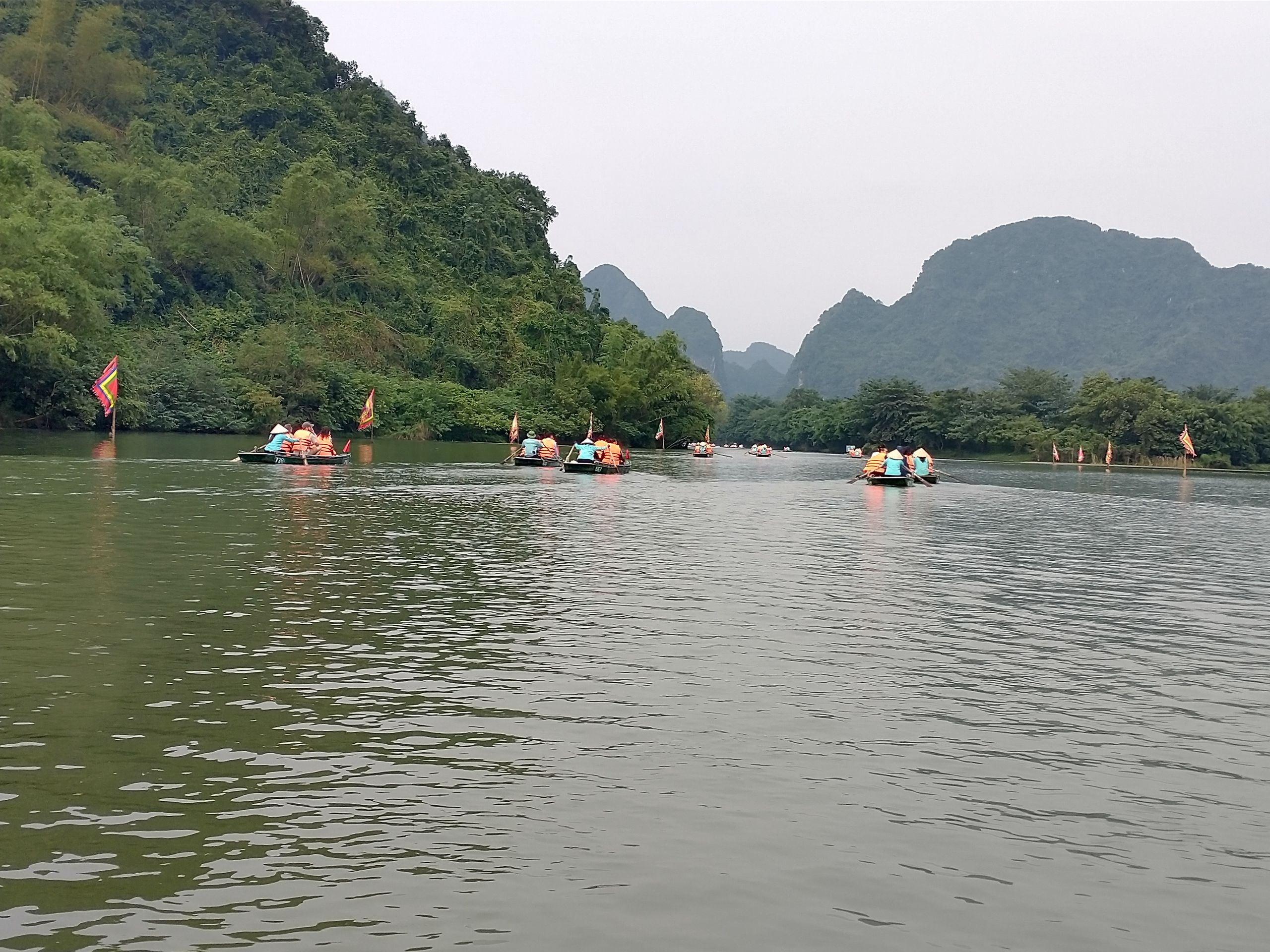 Sonntag, ich habe eine Tour gebucht, wir sammeln alle auf, viele Italiener. Okay, dann halt Sizilianer, wenn ihr drauf besteht. Zuerst geht es zu einem See, Trang An. Wir werden auf kleine Ruderboote aufgeteilt und es geht 2 Stunden über den See und durch lange Höhlen (Kopf einziehen). Mehrere hundert solcher Boote sieht man und zu 99 % sind es Frauen, die diese Arbeit machen. Diese Kaltsteinformationen sind sehr interessant und ganz anders als der Kalkstein in Jena. Hunderte Millionen Jahre musste sich der Muschelkalk ablagern, dann folgten Erdbewegungen und Erosion, was wieder 300 Millionen Jahre gedauert hat. Faszinierend. Zum Mittagessen gibt es Ziege, das ist hier eine lokale Spezialität. Bisschen zäh. Danach geht es zur Bai-Dinh-Pagode, relativ neu und voll mit Superlativen. 10.000 kleine Buddhastatuen und 500 lebensgroße Statuen aus der ganzen buddhistischen Welt, die wichtige Gelehrte zeigen. Komisch sind die kommunistischen Symbole überall. Ein riesiger Turm steht da, aber kleiner als das Ho-Chi-Minh-Mausoleum. Religion hat sich unterzuordnen. Zwei riesige Tempel mit riesigen Buddha-Statuen, eine eher vietnamesisch, eine eher indisch mit vielen Armen und Köpfen. Nächste Station ist die Mua-Höhle. Stellt sich heraus, das ist keine Höhle, sondern ein Berg, wieder etliche Stufen hoch, viel zu viele Menschen. Letzte Station, obwohl nicht gebucht: noch einmal Huo Lo, die erste Hauptstadt. Es ist spät und wir werden schnell durchgeführt. Das erste Mal, dass ich nach Trinkgeld gefragt werde. Sonst nicht üblich hier, man bekommt immer passend Wechselgeld. Ich habe noch das Hostel gewechselt, war aber unnötig, auch gähnende Leere dort. Auf Empfehlung von Lyly habe ich noch was Traditionelles gegessen. Eigentlich wollten wir uns treffen, hat aber nicht geklappt. Insgesamt ist Ninh Binh überbewertet.