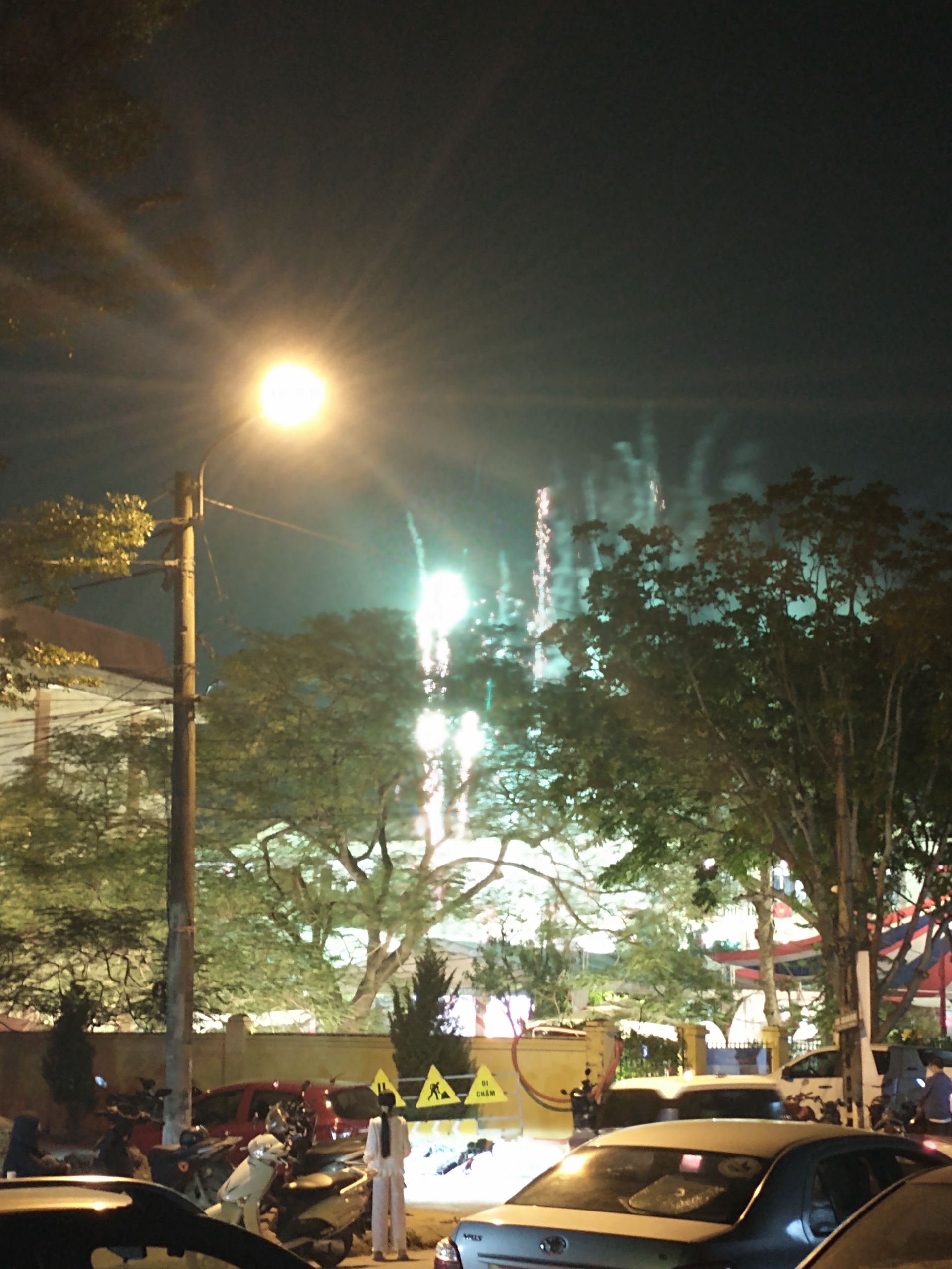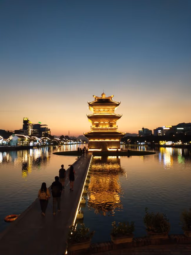 Freitag (Tag 15). Mit dem Minivan nach Ninh Binh klappt gut. Die Sonne zeigt sich auch. Im Homestay ist nicht viel los, aber es gibt einen Pool. Auf den Buchungsseiten wird man aber auch manipuliert. Heute haben schon X Personen diese Unterkunft gebucht, Müll. Und man sollte nicht die Unterkünfte nehmen, die den größten Rabatt anbieten, dort ist garantiert keiner. Der Besitzer bietet mir Tee und Tabak Bong an, ist schon starkes Zeug. Wir unterhalten uns via Übersetzungsapp, er hat einen Bruder in Berlin. Nebenan ist den ganzen Tag Party, eine Schule feiert 50. Geburtstag mit Musik, Tanz und Feuerwerk. Die Innenstadt von Ninh Binh ist überschaubar und man ist schnell durch. Wohl erst seit 5 Jahren sind hier Touristen erlaubt. Ich laufe ein bisschen herum. Die kleine Promenade ist nett gemacht, es gibt einen schön beleuchteten Tempel auf dem See.
