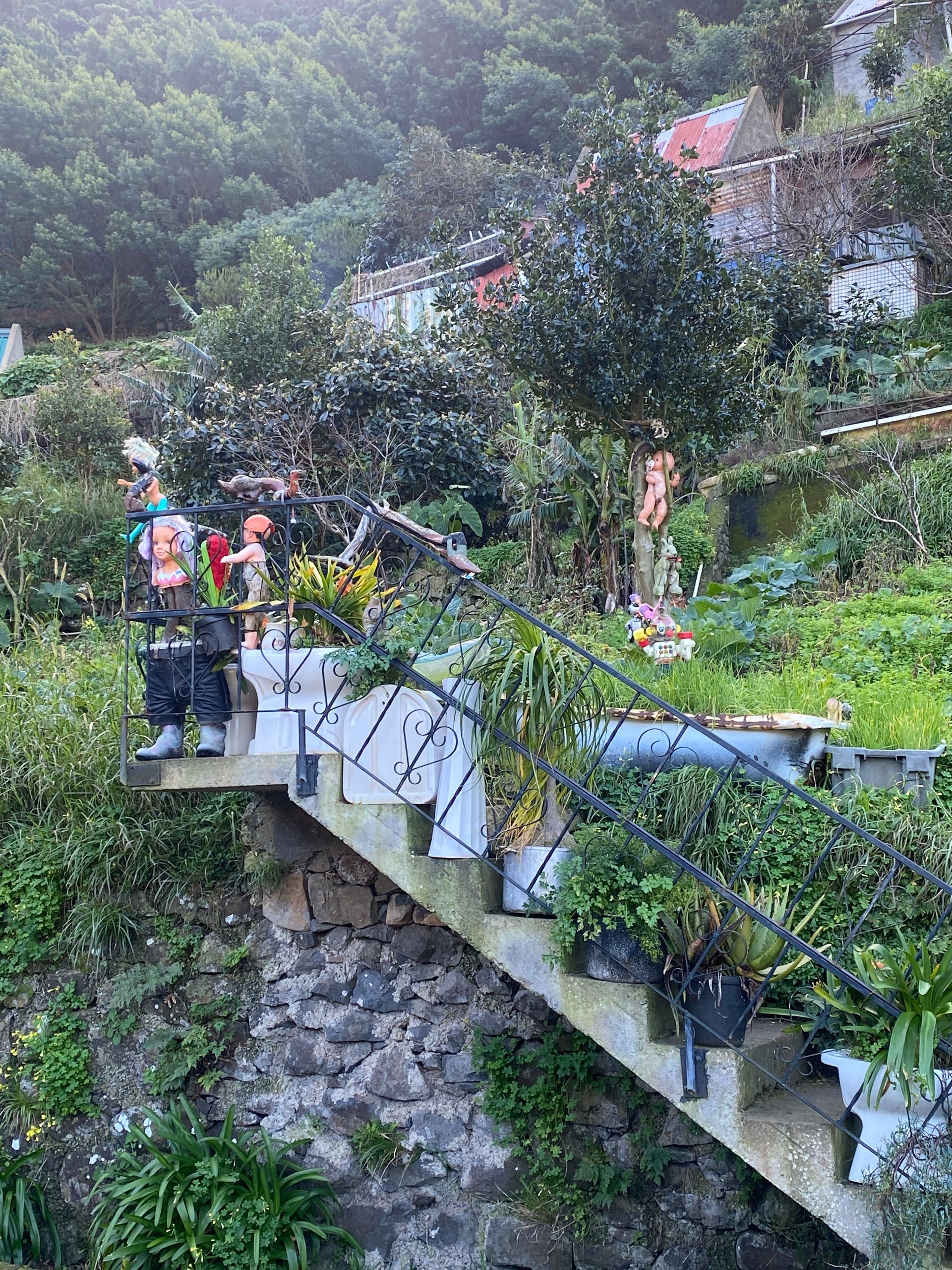 Vieh gab es nicht zu sehen. Nur vier Ziegen ruhten sich im hohen Farn aus, eine kleine Katze saß in ihrer Nähe, Hähne waren – wie auch Hunde – immer wieder zu hören.