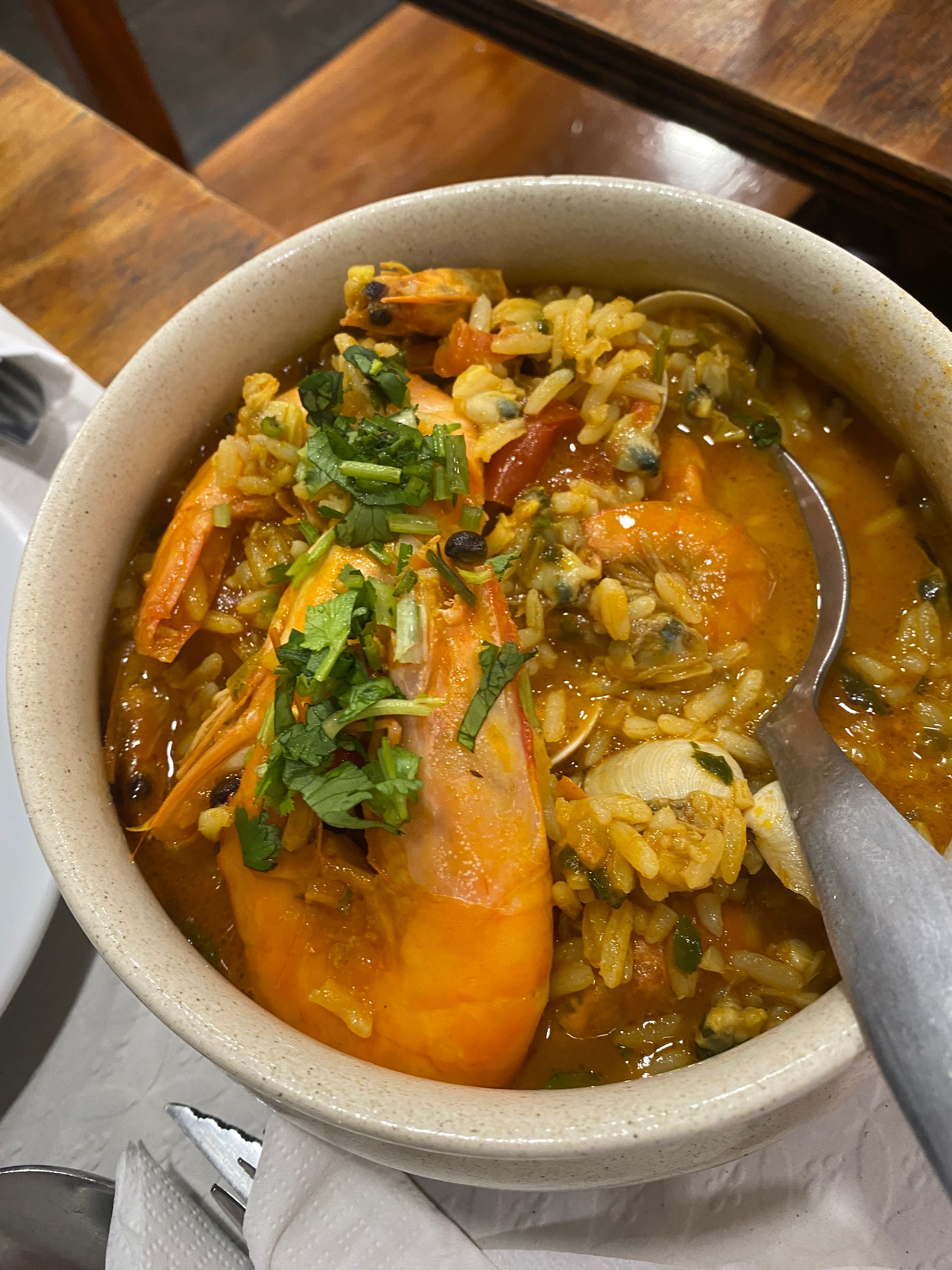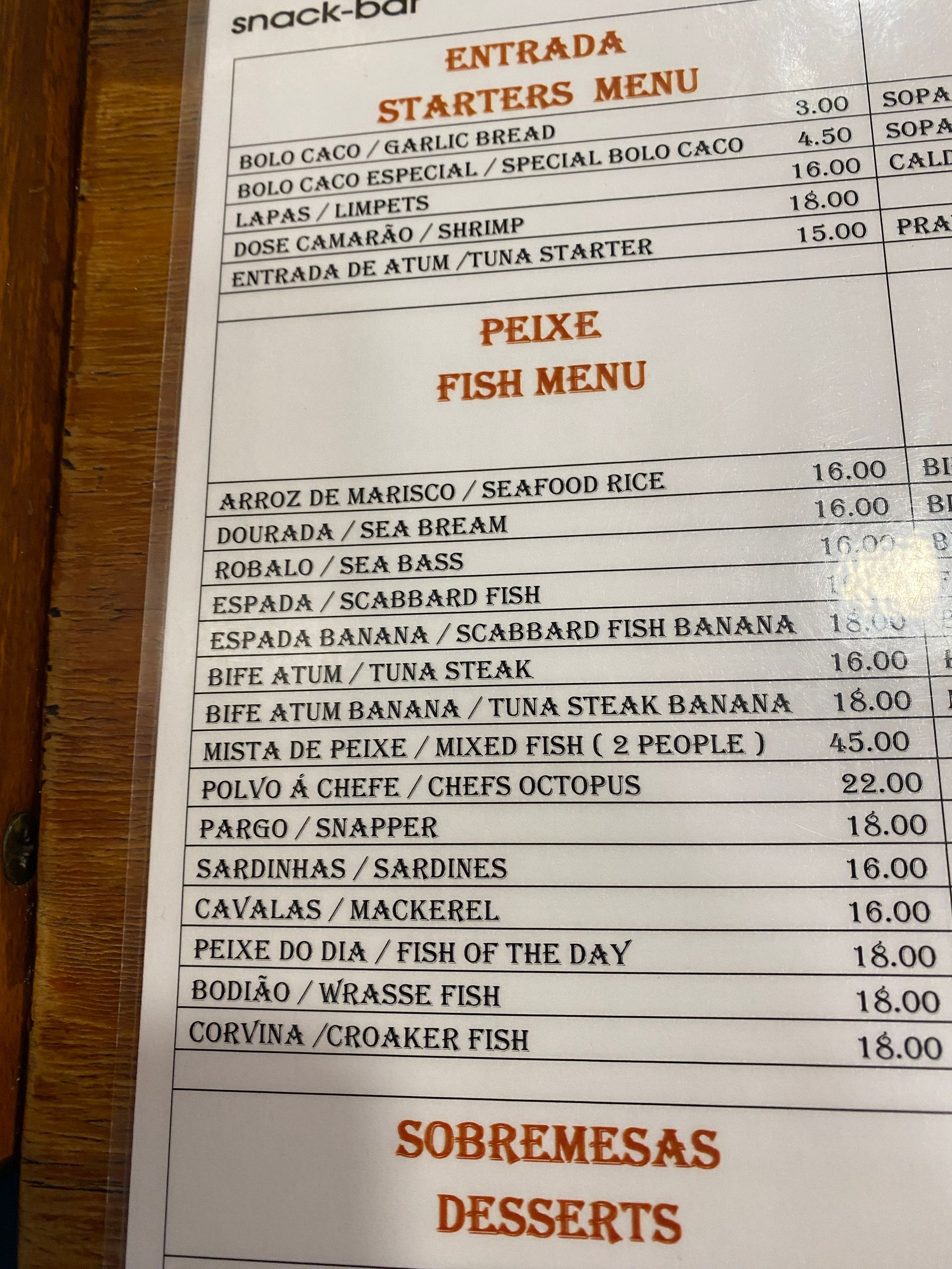 Kurz ausruhen und dann auf die Suche nach einem Bus nach S. Cruz gemacht, leider vergeblich. Also ein Spaziergang zum Supermarkt, um einen Zimtapfel zu kaufen. Bin gespannt, wie dieser schmeckt. Nach einem Aperitivo standen wir pünktlich zur Öffnungszeit vor der Bar Nr. 5. Nach wenigen Minuten waren alle Stühle besetzt. Ich entschied mich für Reis mit Meeresfrüchten. Vorher ein Bolo d0 Caco, ein Fladenbrot, das mit Knoblauchbutter bestrichen wird. War wirklich super und auch erstaunlich viel. Und draußen warteten schon die nächsten Gäste.