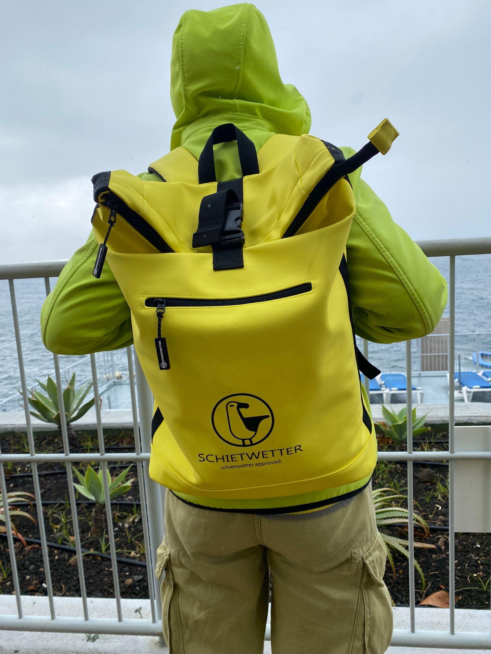 Uns zog es gleich zum Wasser, obwohl der Himmel Regen versprach. Der folgte dann auch wenige Augenblicke später. Sehr sanft zwar, aber nass ist nass. Zum Glück gab es beim Meeresschwimmbecken nicht nur Souvenirs, sondern auch eine überdachte Bar. Bica geht immer und Pommes auch. Dort konnten wir eine Weile im Trockenen sitzen. Das Meer war zwar nebenan, aber durch die Wetterschutzplanen kaum zu sehen.