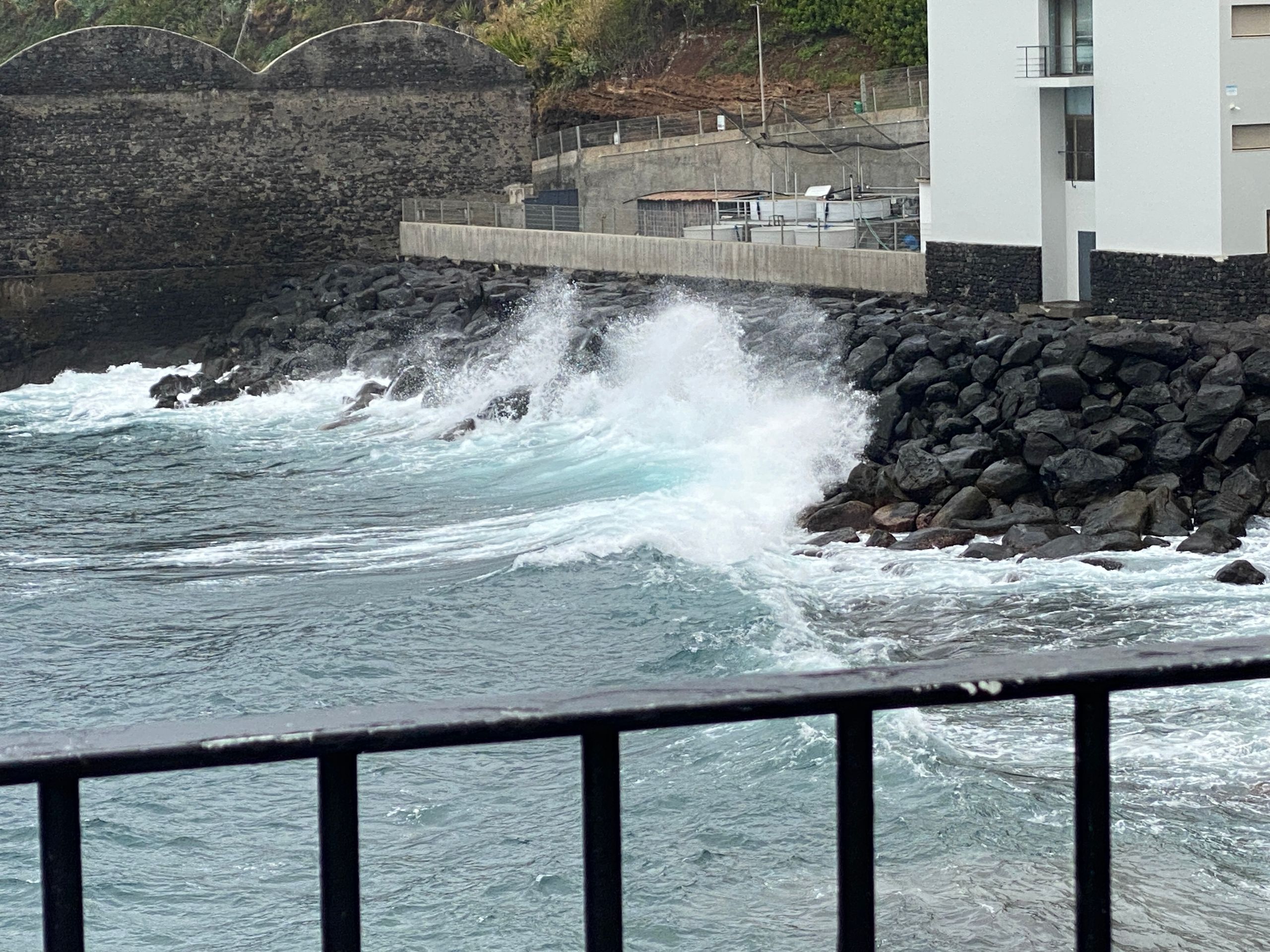 Eine kurze trockene Phase nutzten wir, um doch noch ein Stück auf der Promenade zu spazieren und die Brandung zu bewundern. Beeindruckend, mit welcher Wucht das Wasser auf die Steine und gegen die Ufermauern geschleudert wurde.