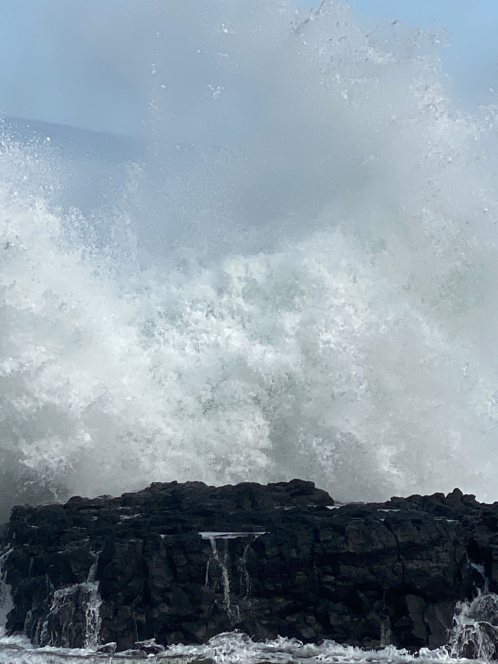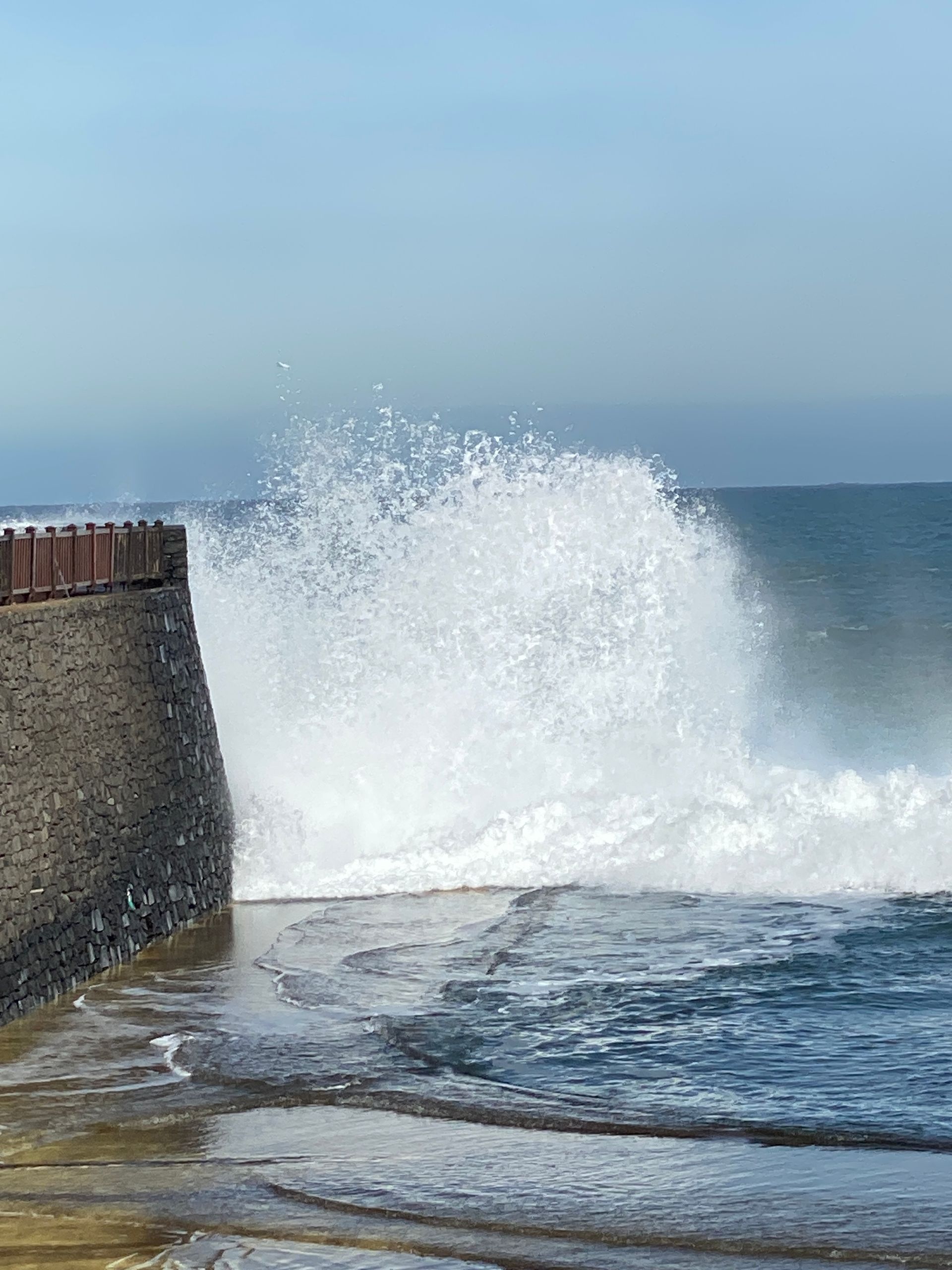 Der Bus brachte uns zum nächsten Stopp nach Porto da Cruz zu einer Zuckerrohr verarbeitende Destillerie – Rum wird noch immer daraus gemacht. Vorher allerdings wollten wir gerne über die Strandpromenade des Ortes spazieren, vorbei an Meerwasser-Schwimmbecken. Leider war nur der vordere Bereich zugänglich. Der Wind peitsche die Wellen so hoch, dass der restliche Weg gesperrt wurde. Die Gischt war wirklich beeindruckend und wir wären klatschnass geworden.