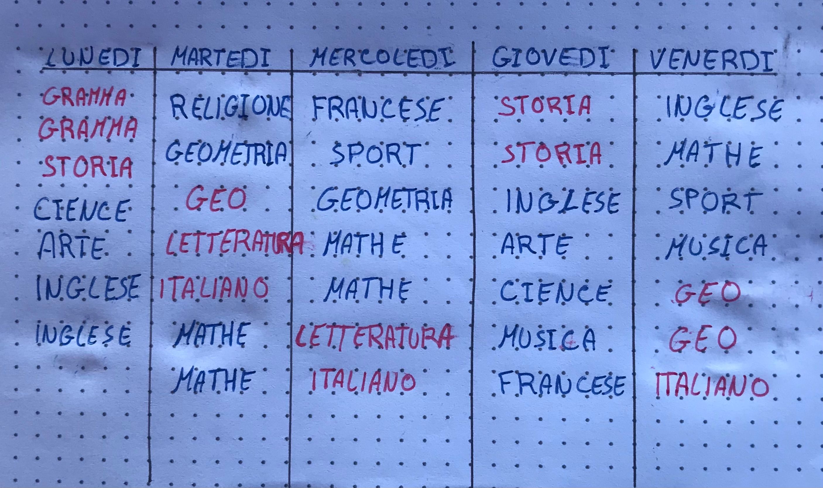 In der Woche hatte ich 36 Stunden Unterricht. Als Fächer hatte ich Grammatik, Geographie, Literatur, Italienisch, Geschichte, Wissenschaft, Kunst, Religion, Geometrie, Mathe, Englisch, Französisch, Sport (physische Erziehung), Musik und Theater.