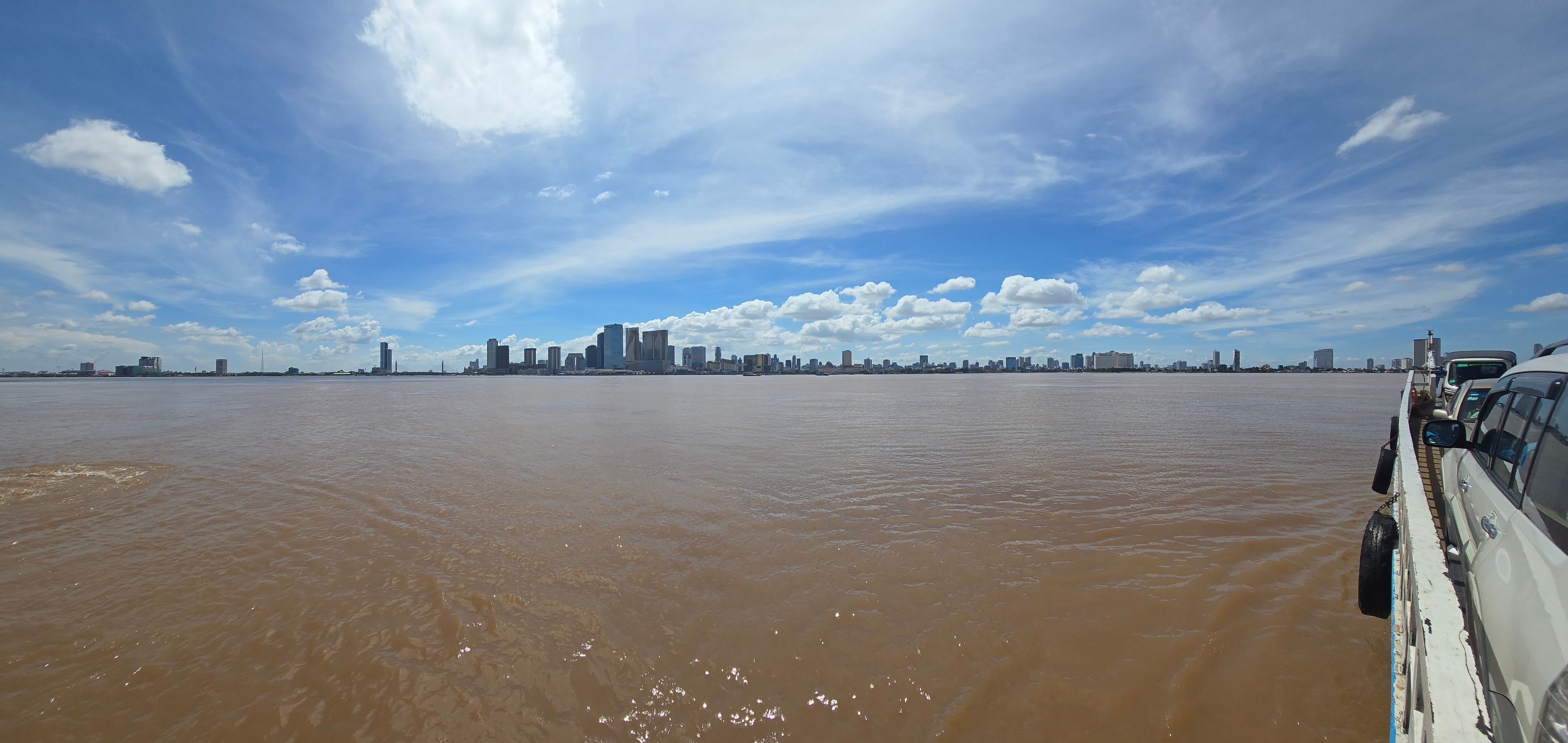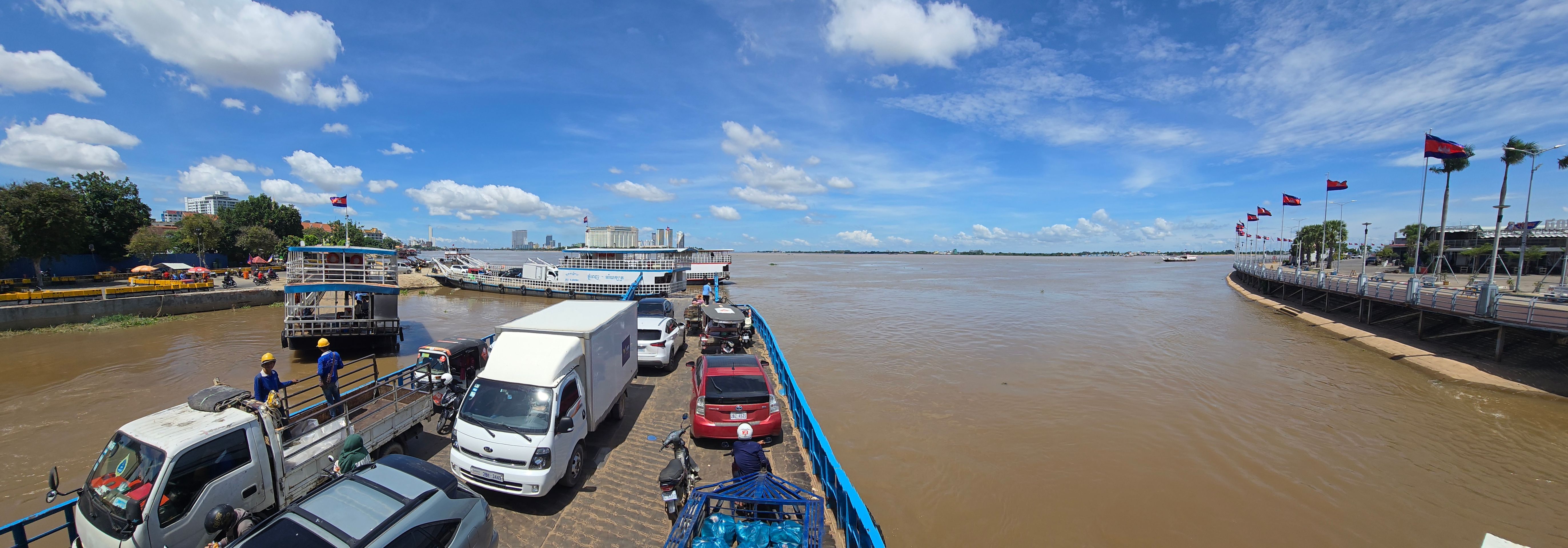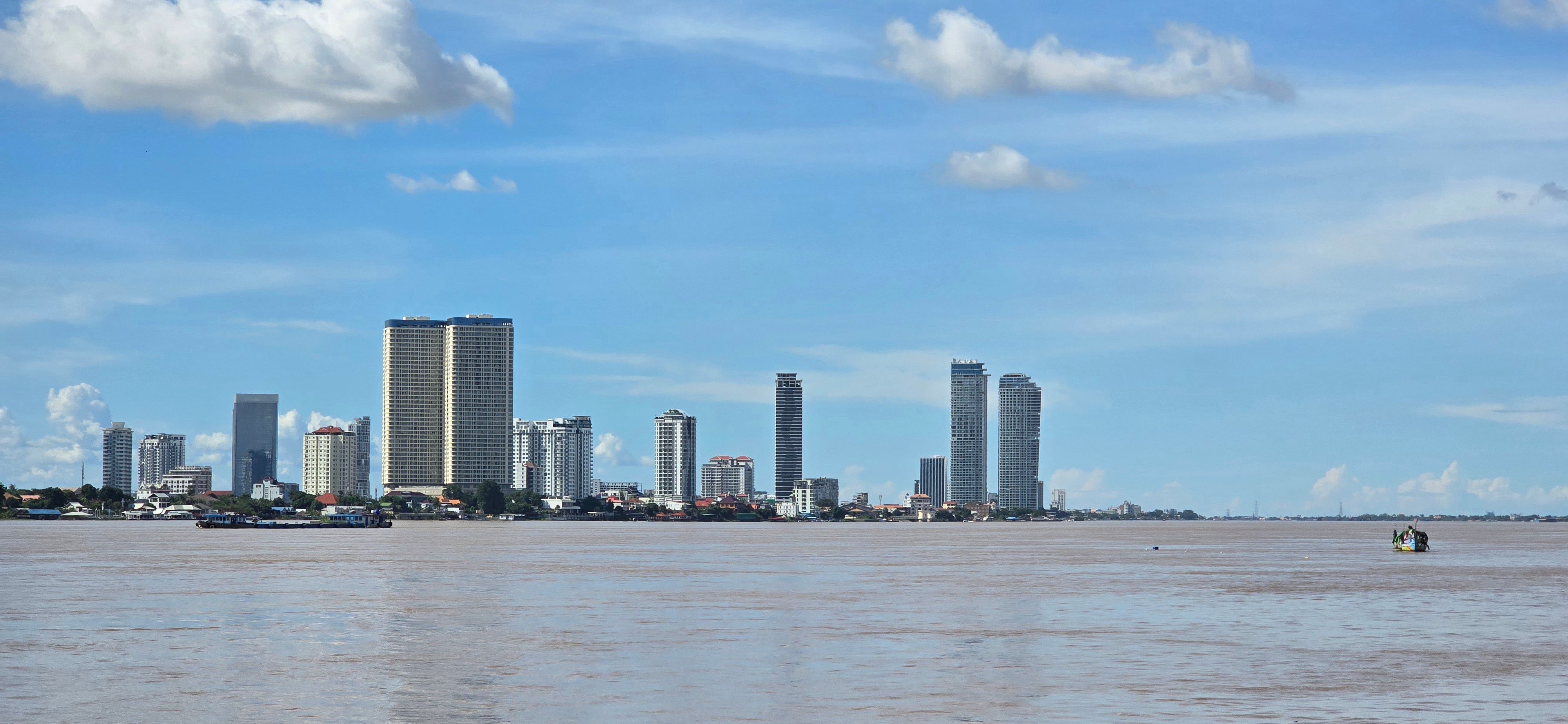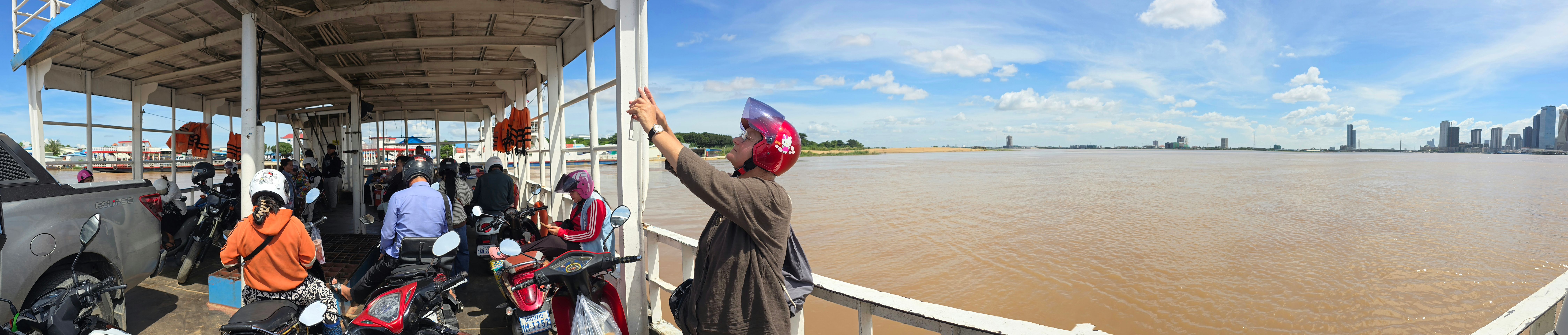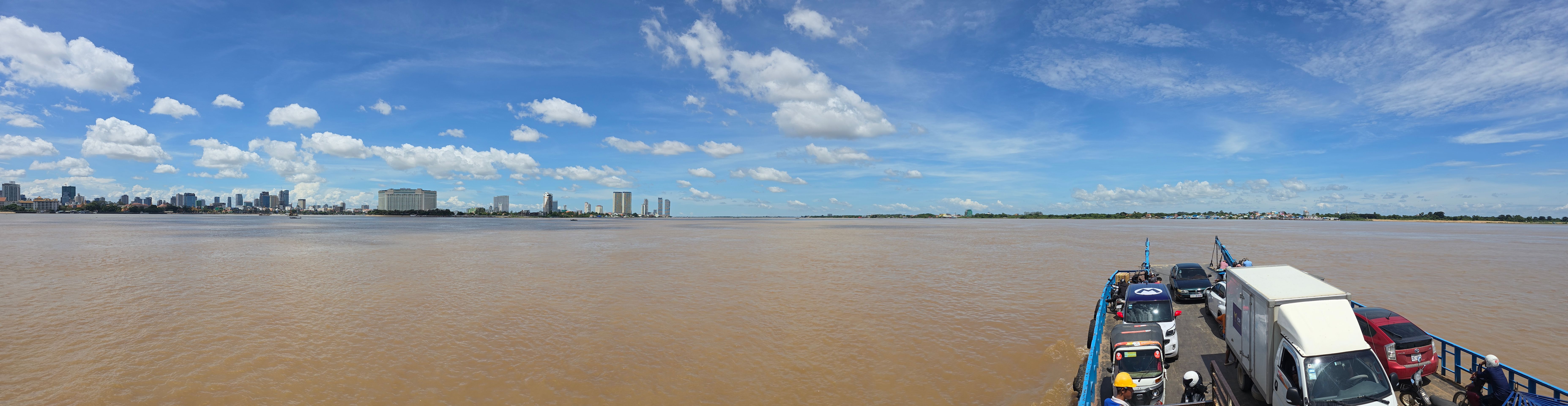 Phnom Penh wächst zur Westseite des Mekong; am der Stadt gegenüber liegenden Ostufer geht es unmittelbar ins grüne, landwirtschaftlich geprägte Umland. Das erhöht den Reiz der weithin sichbaren Skyline der City. Da wir sehr viel mit dem Moped unterwegs sind, ergeben sich vielfach Überfahrten: Begegnungen, Momente des Innehaltens, die wir sehr genießen.