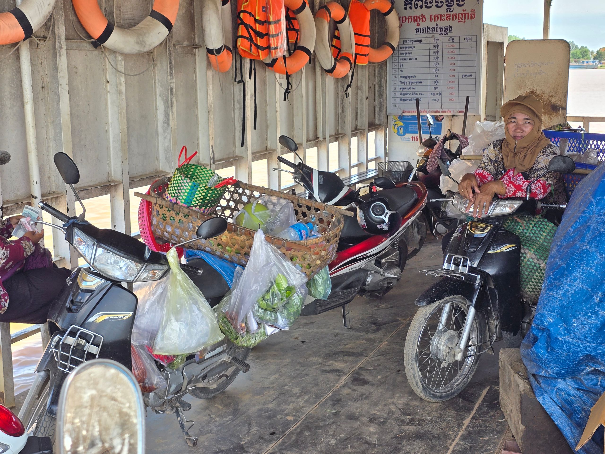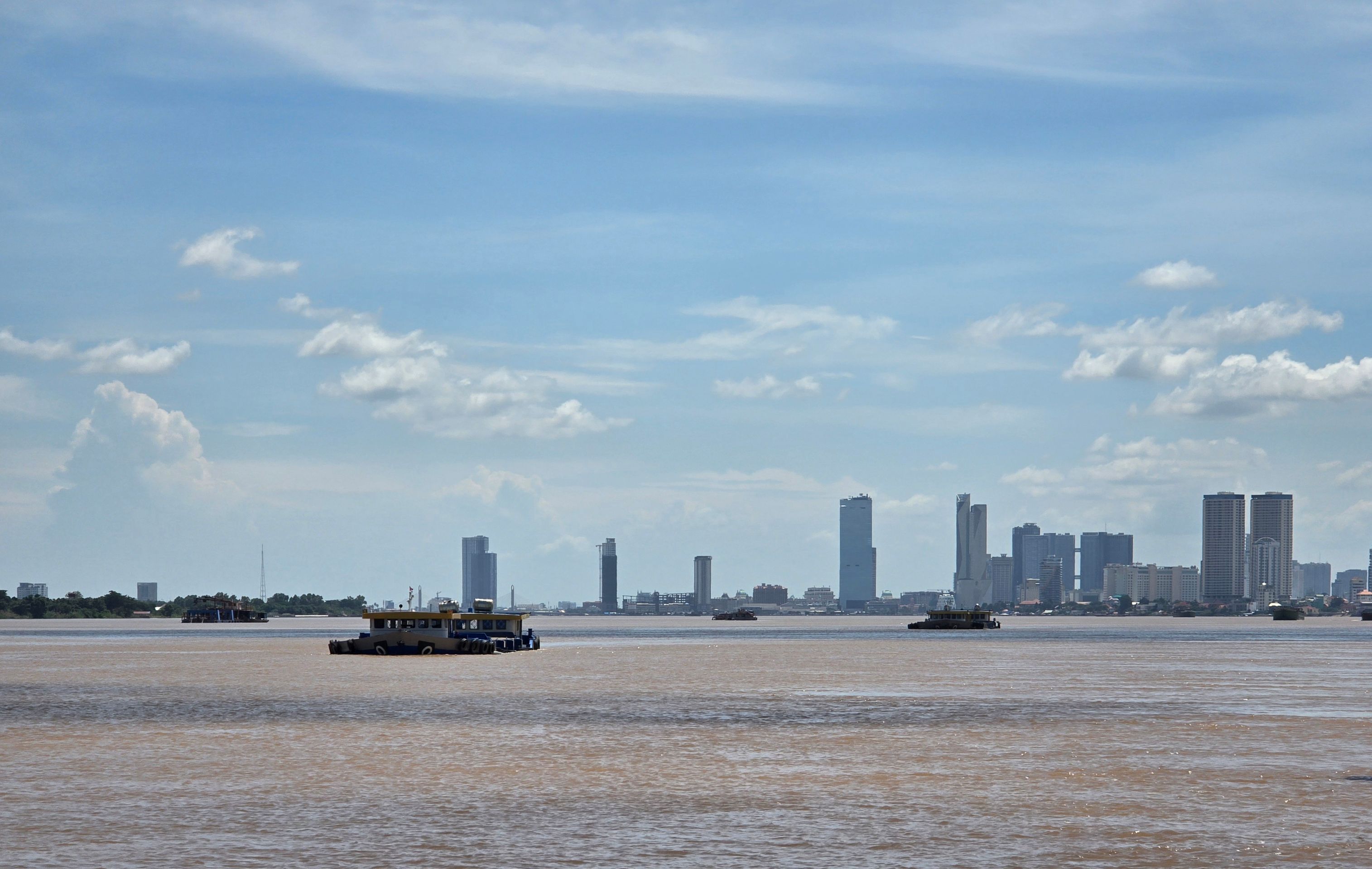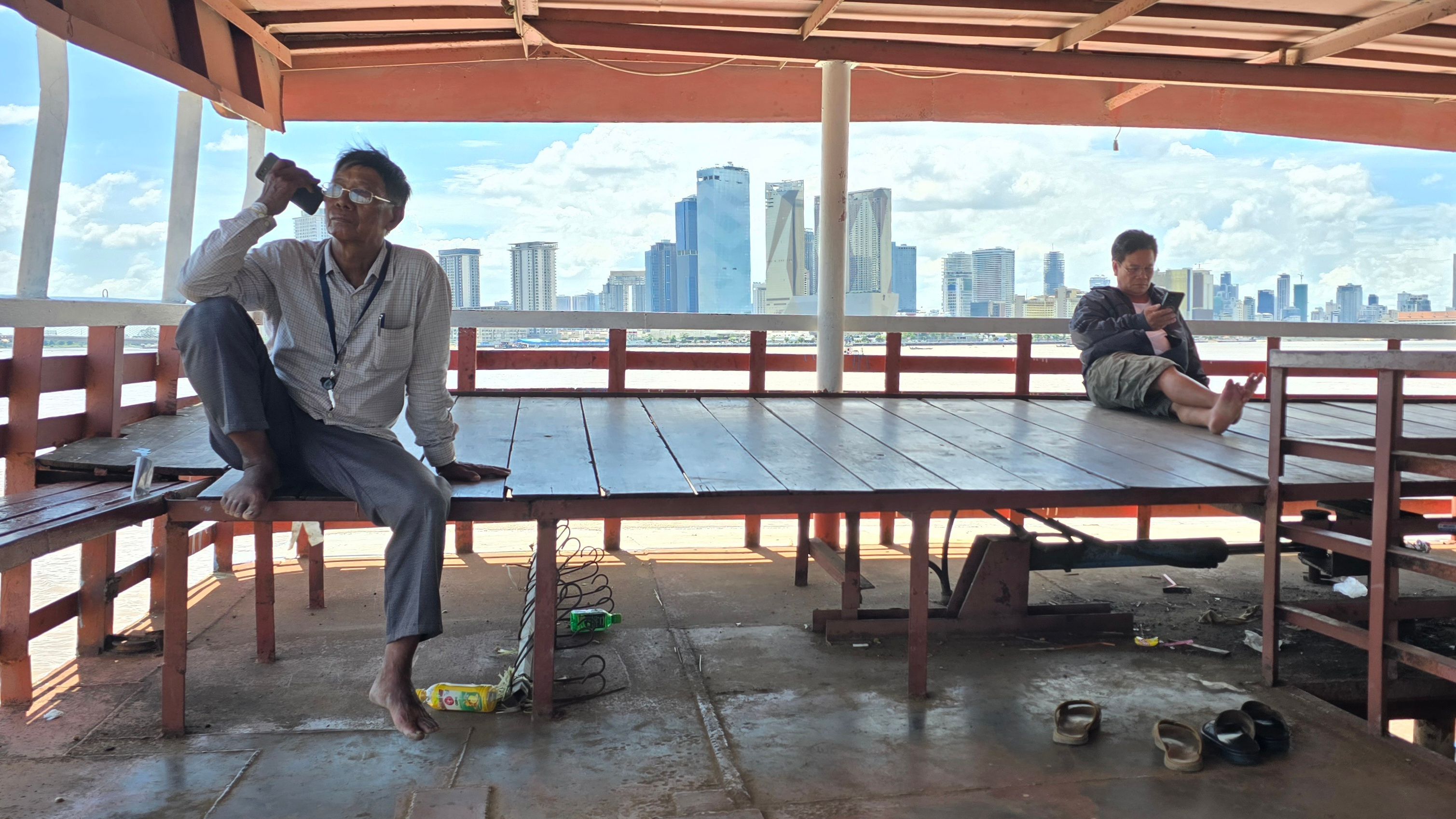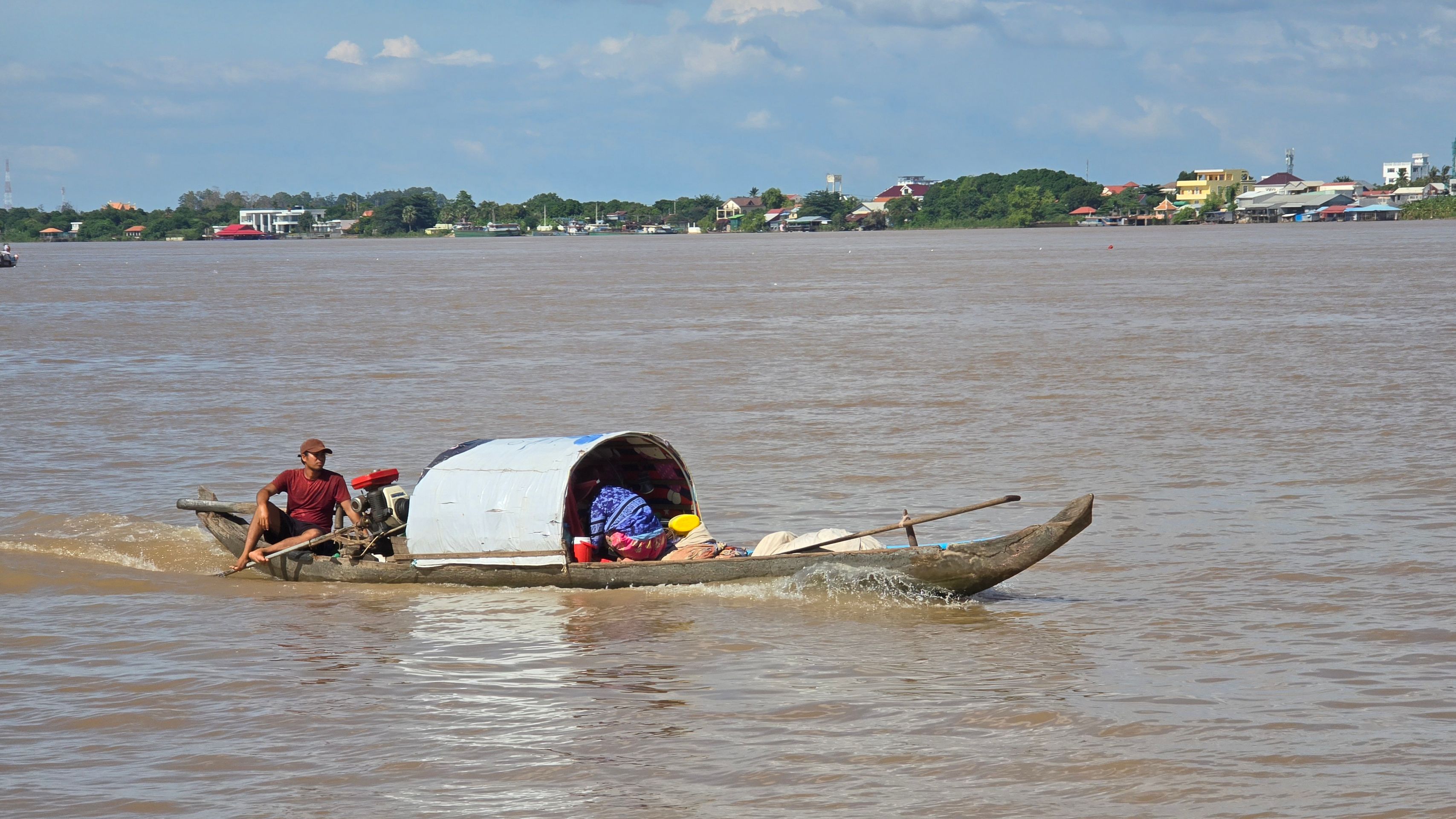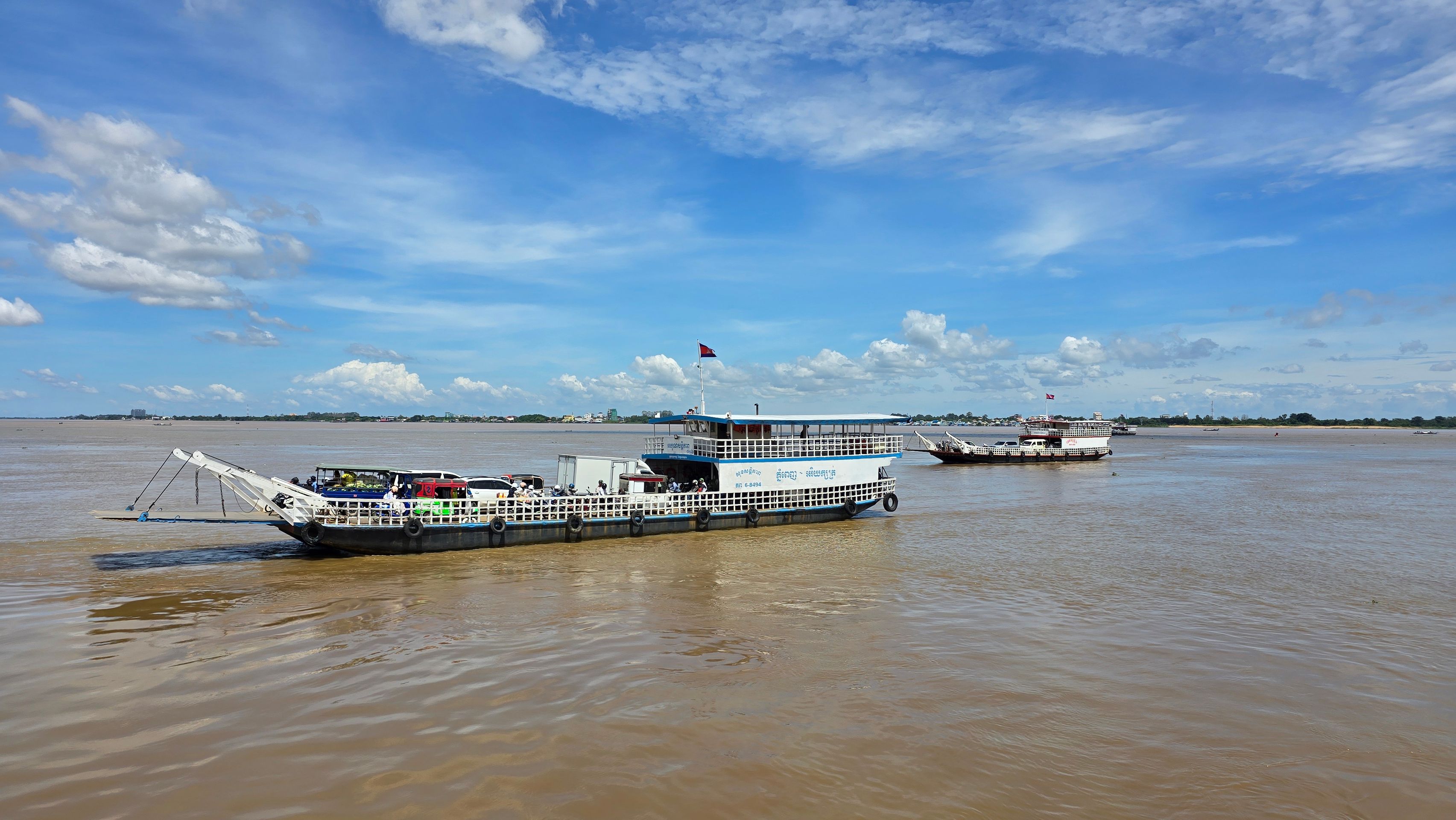 Phnom Penh wächst zur Westseite des Mekong; am der Stadt gegenüber liegenden Ostufer geht es unmittelbar ins grüne, landwirtschaftlich geprägte Umland. Das erhöht den Reiz der weithin sichbaren Skyline der City. Da wir sehr viel mit dem Moped unterwegs sind, ergeben sich vielfach Überfahrten: Begegnungen, Momente des Innehaltens, die wir sehr genießen.