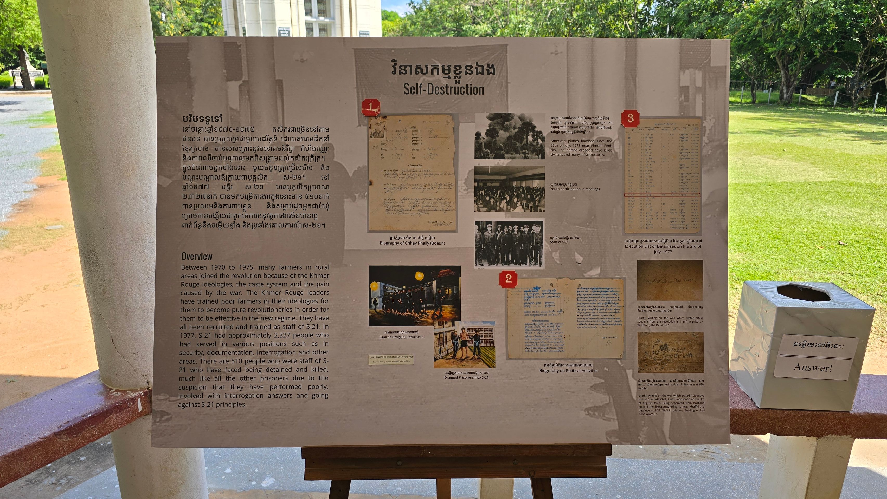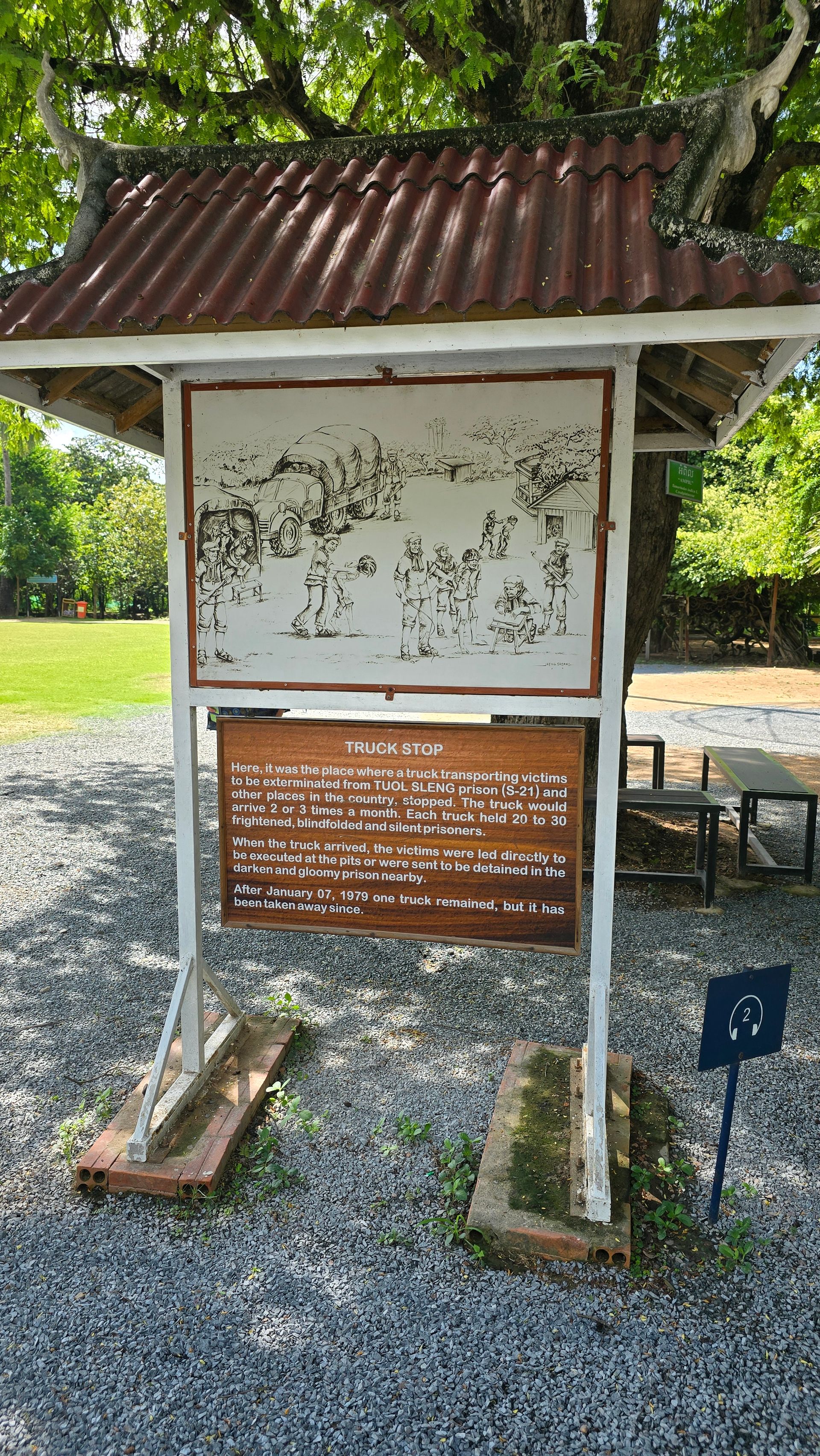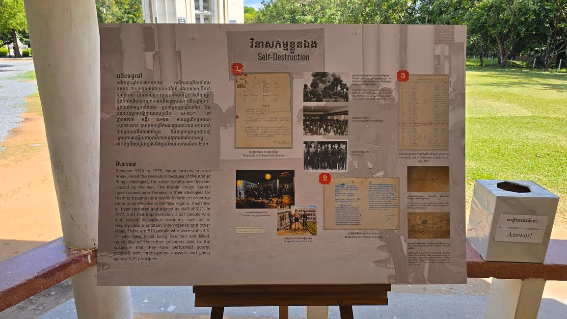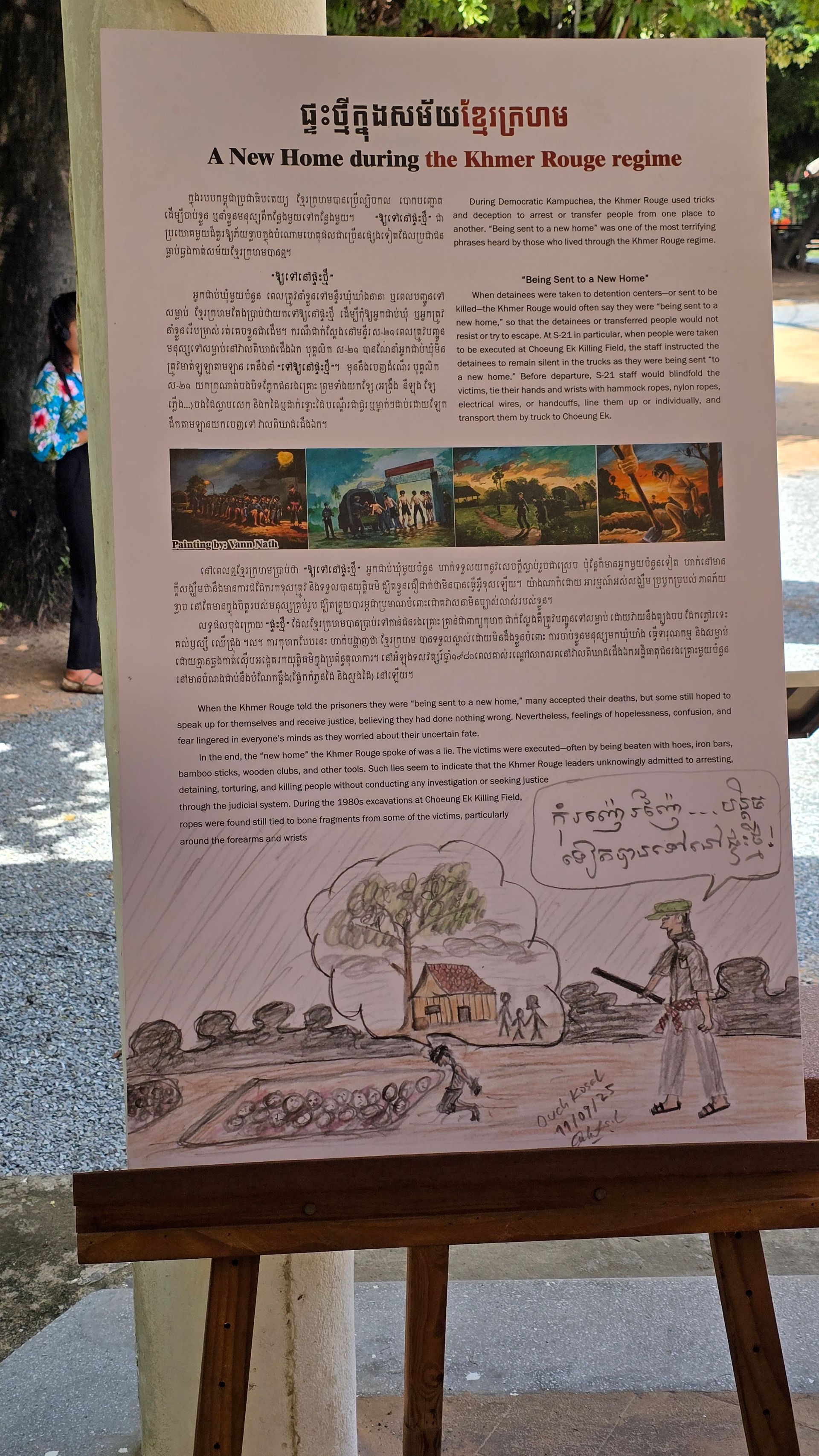Ein Muss für Kambodscha-Reisende ist ein Besuch des Choeung Ek Genocidal Center, eines der unzähligen Killing Fields. Nach Choeung Ek wurden im Besonderen die Gefangenen aus dem Verhörgefängnis Tuol Sleng verbracht, nachdem sie die ihnen zur Last gelegten Verbrechen unter Folter "gestanden" hatten. Vornehmlich wurden sie mit allen erdenklichen Waffen und Werkzeugen erschlagen, um Munition zu sparen und keinen Lärm nach außerhalb dringen zu lassen.