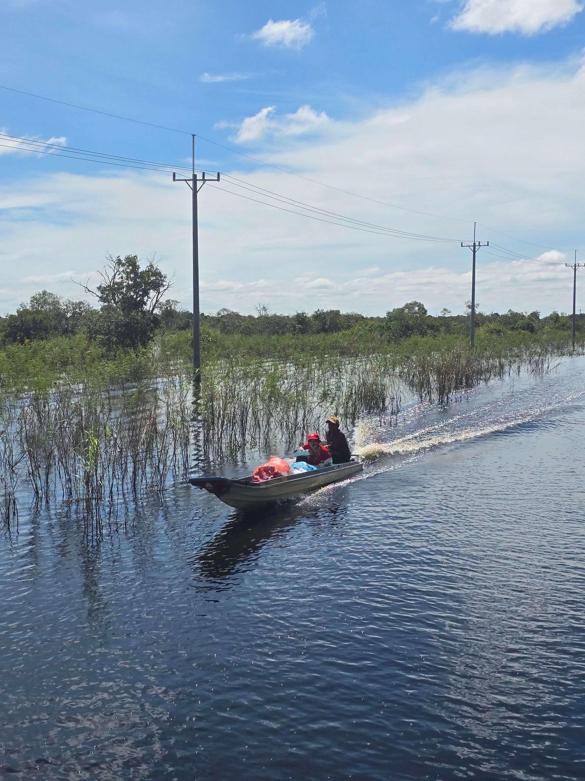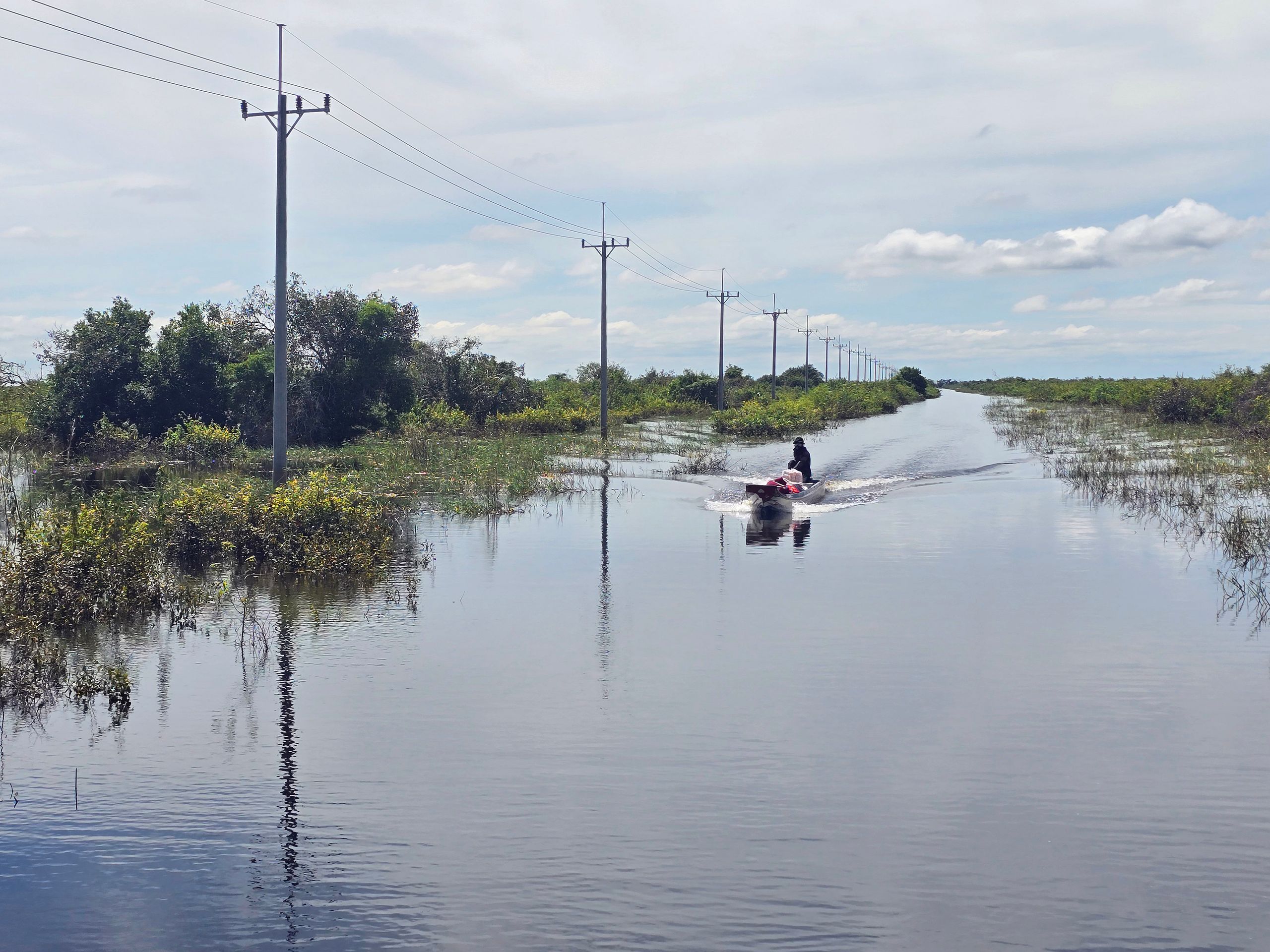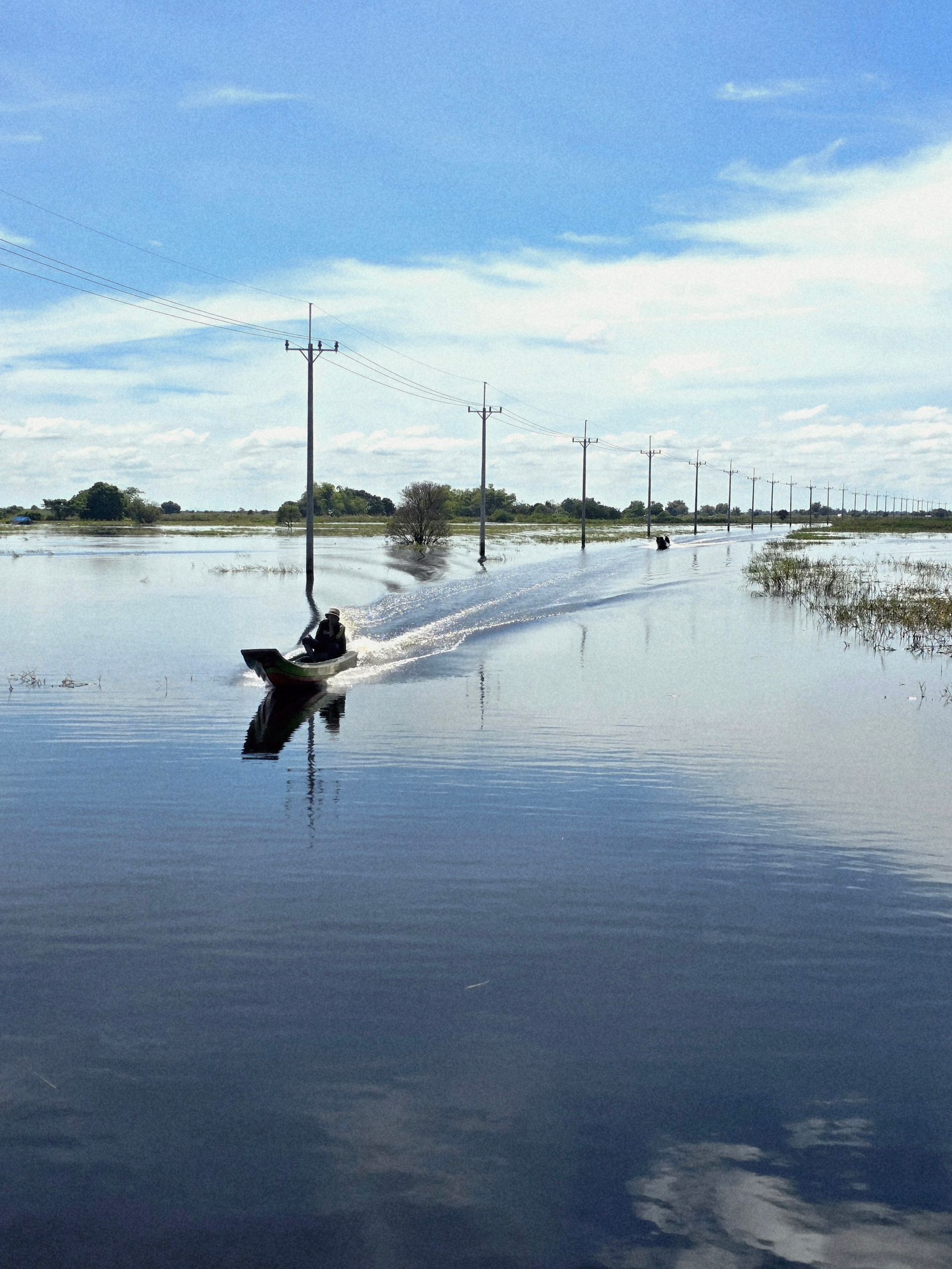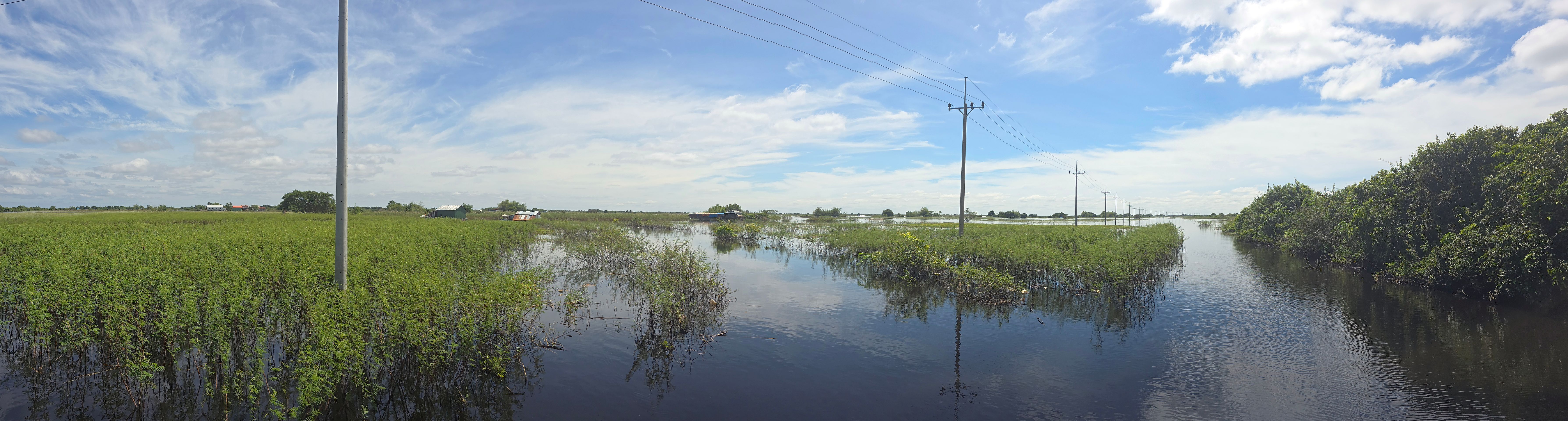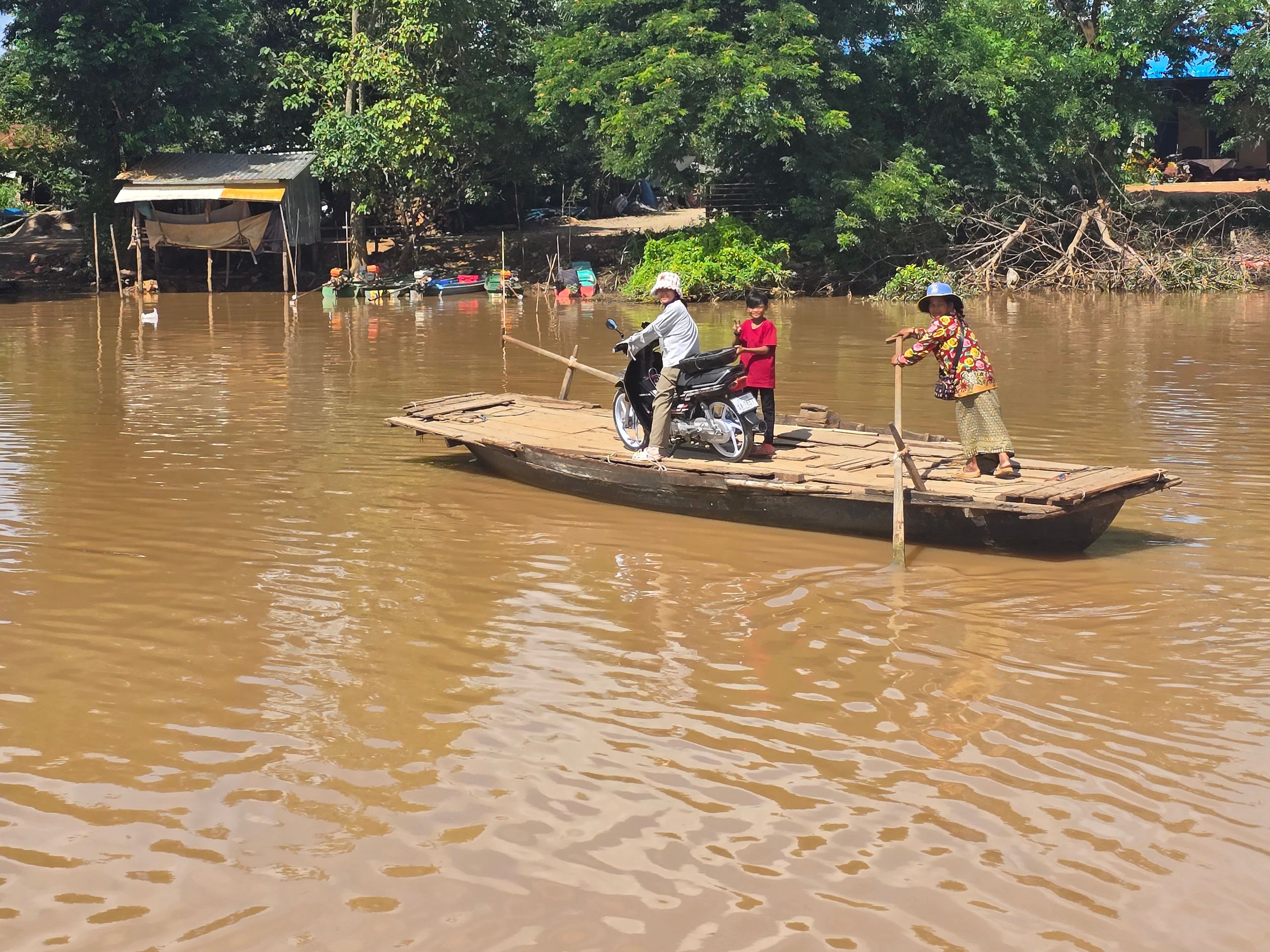 ... unter uns, entlang den Stromleitungen, verläuft eine Straße, über die wir gemächlich schippern. Der Fluss nimmt an dieser Stelle viele Windungen, wir nehmen quasi die Abkürzung! Erst kurz vor Battambang erreichen wir wieder den Flusslauf. Wir sehen erste Autos rechts und links des Flusses und auch eine von Hand betriebene Fähre. Ausschließlich für maximal Zweiräder?