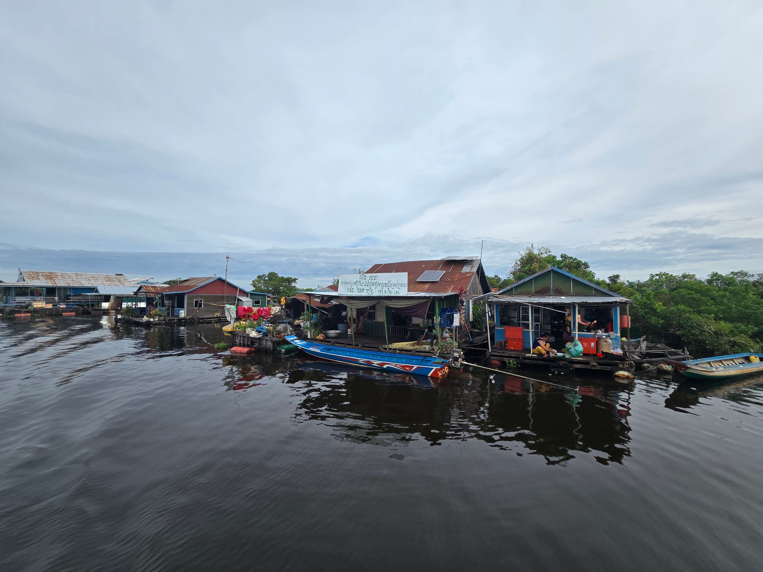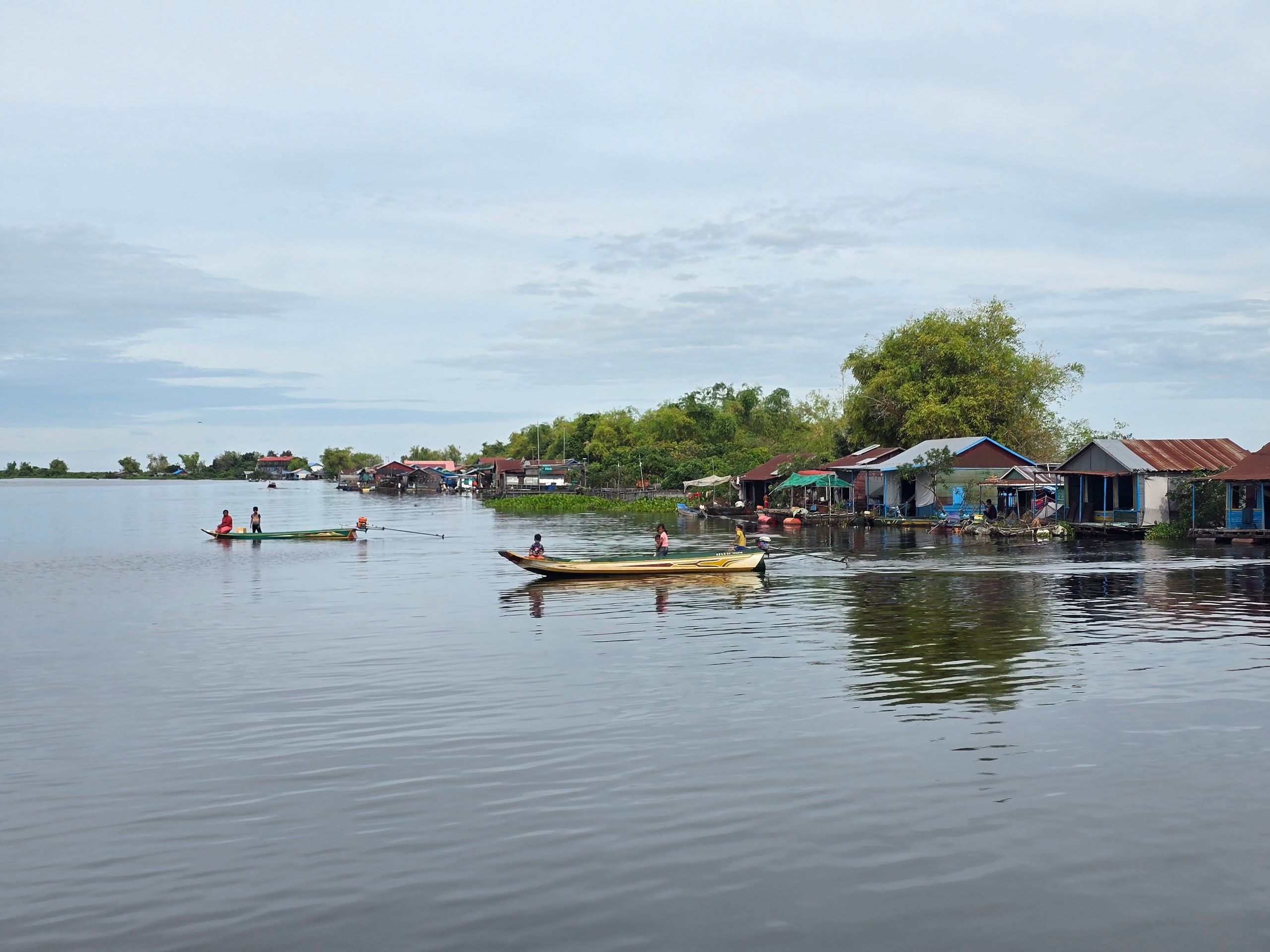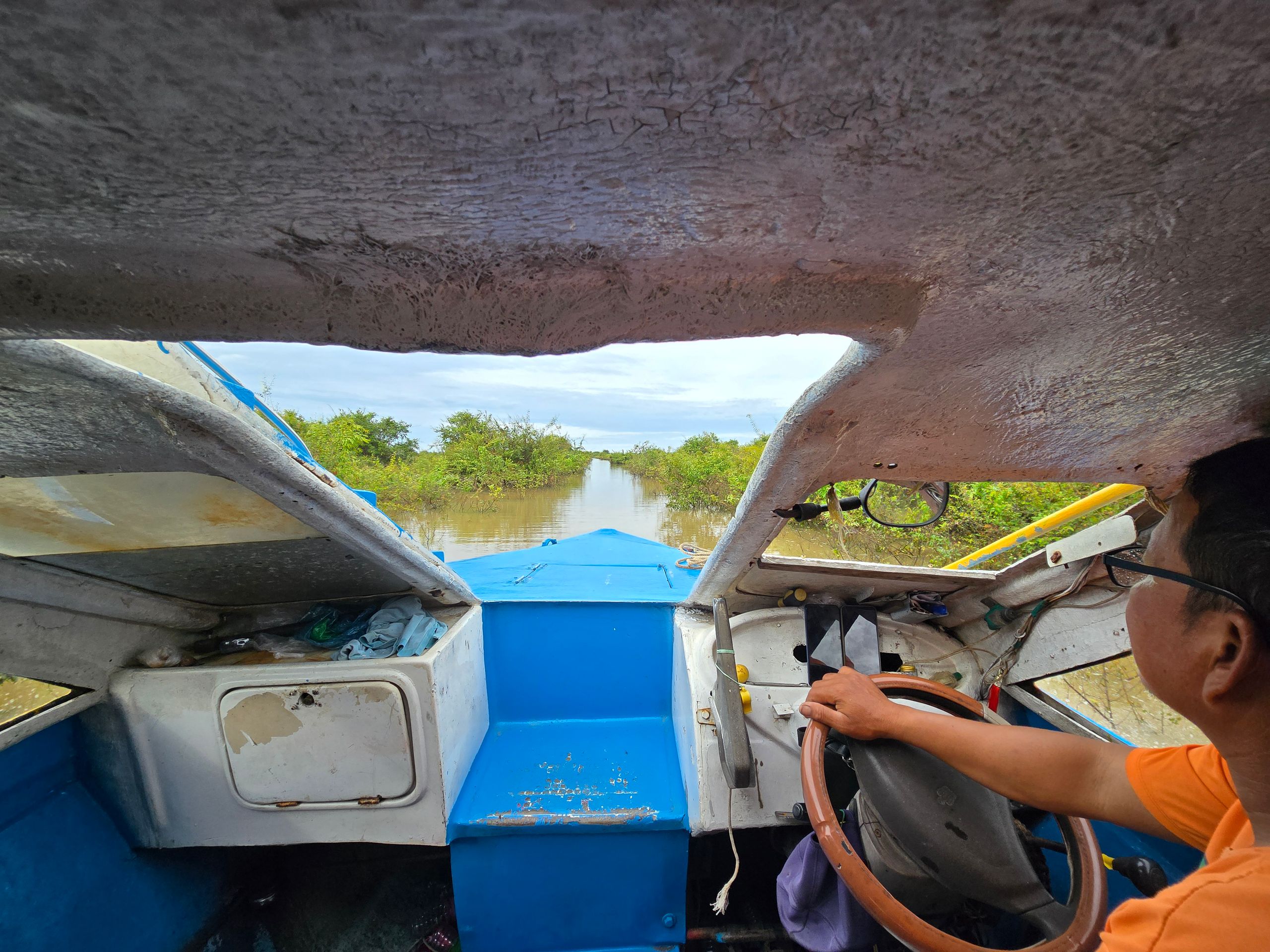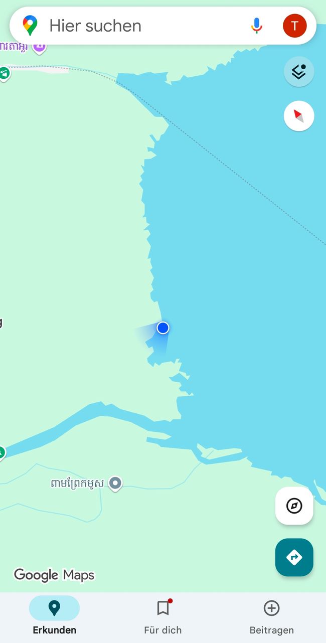 Zu Beginn der gestrigen Fahrt über den See sind nur Touristen an Bord, aber unmittelbar nach dem Ablegen macht das Boot einen ersten Stopp auf dem Wasser, um Fässer aufzuladen. Der Bootsführer macht uns bald darauf aufmerksam, dass die Fahrrinne nun sehr eng werde. Bei einem Blick auf Google Maps wird uns gewahr, dass wir den Flusslauf verlassen haben und - das besagt die Karte - über Land fahren. Die Sträucher, durch die wir uns vermeintlich hindurch bewegen, sind Baumkronen, die aus dem Wasser ragen.