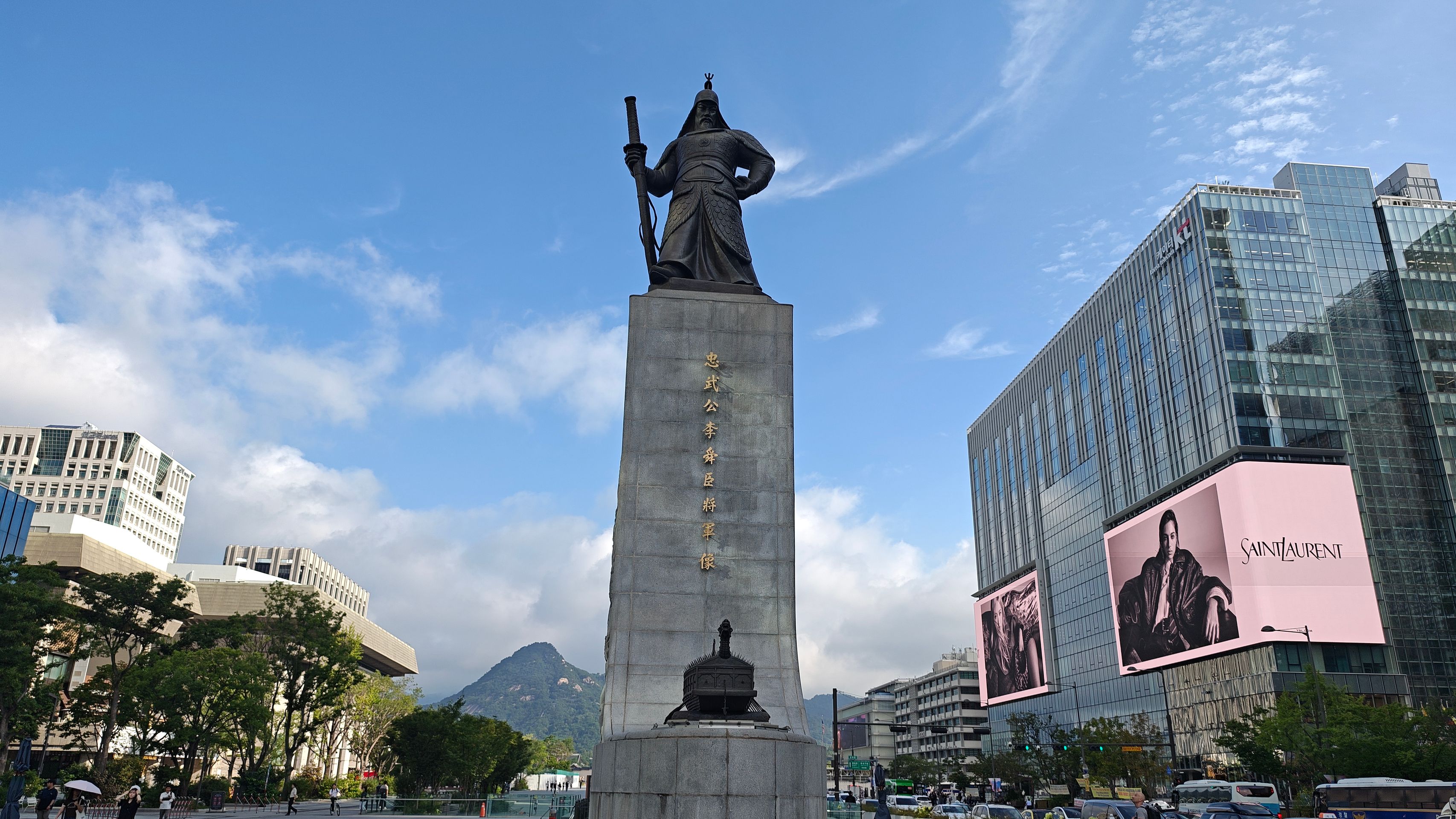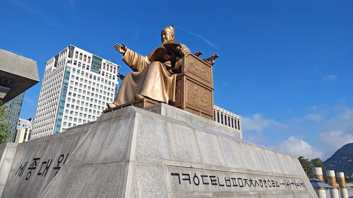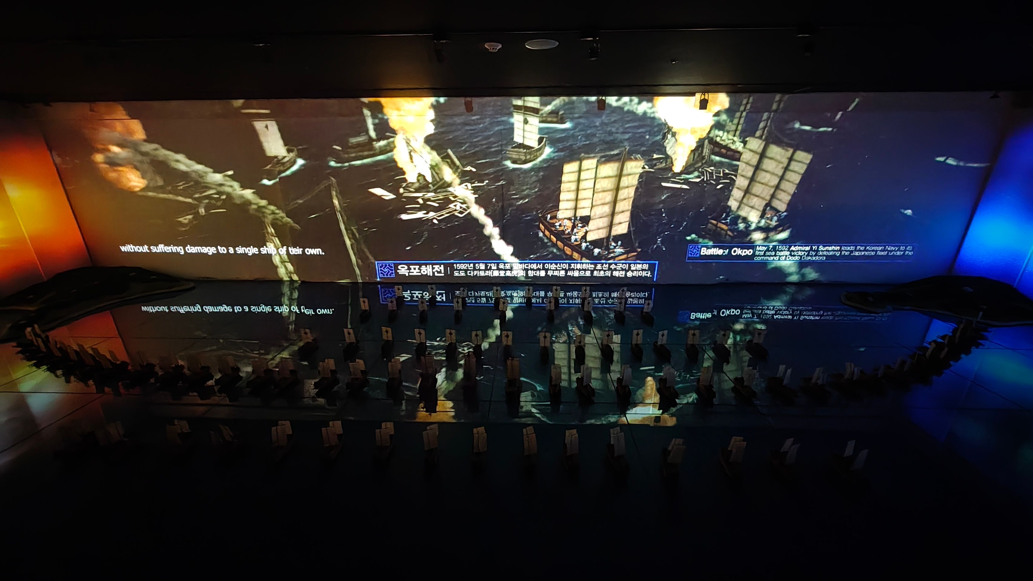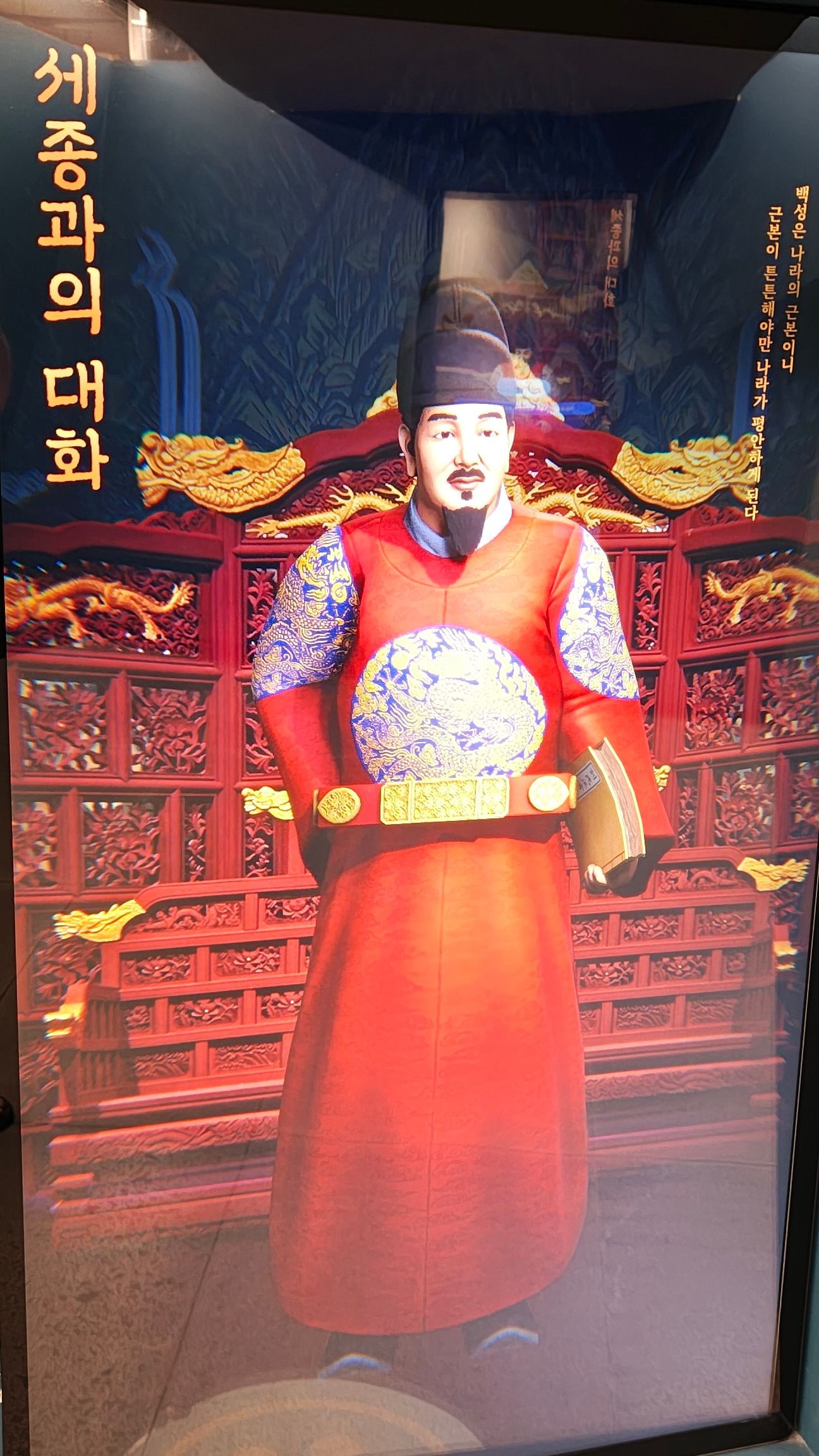 Wer sich mit der koreanischen Geschichte und Kultur beschäftigt, der trifft immer wieder auf zwei Persönlichkeiten, die in ihrer Integrität und ihrem klugen Handeln und moralischen Grundsätzen herausragende Menschen waren. Admiral Yi Sun-sin und König Sejong der Große haben deshalb im Zentrum von Seoul auf dem Gwanghwamun-Platz als große Statuen einen Platz gefunden. Zu diesem Platz fahren wir mit der Metro und tauchen nach ein paar Fotos von den beiden Statuen in die unterirdische Ausstellung über diese beiden Personen ab, welches auch über das Sejong Center nebenan erreichbar ist. Zunächst treffen wir auf die Ausstellung zum Admiral, der in allen seinen Schlachten gegen die übermächtigen japanischen Angreifer siegte und auch ein Tagebuch führte, welches seine Integrität zeigt. Neben seinen taktischen Fähigkeiten hatte er auch ein sehr gutes Gespür für den Aufbau seiner Truppen. Er konstruierte das Schildkrötenschiff, welches neben seiner manövrierfähigen Bauweise und dem Feuerstrahl am Bug auch ein Dach mit Spitzen hatte, worauf das Entern des Schiffes nicht so leicht war. Ein solches Schiff ist in der Ausstellung in einem etwas kleineren, aber begehbaren Nachbau zu sehen. Drinnen sind mit Figuren die Funktion der einzelnen Schiffsbereiche erläutert. Sehr anschaulich und beeindruckend für uns. In den Jahren 1592 bis 1598 kämpfte Yi insgesamt 23 Schlachten gegen die Japaner und gewann erstaunlicherweise alle Kämpfe. Darunter auch die Schlacht von Myeongnyang im Jahr 1597, wo er nur mit 13 Schiffen eine japanische Flotte von über 130 Schiffen besiegte und etwa 30 Schiffe der Japaner vernichtete, ohne ein einziges eigenes Schiff zu verlieren. Diese Schlacht ist militärhistorisch ein absolutes Meisterstück der Taktik und Psychologie. Einige Schlachten sind im Museum durch eine große Videoleinwand erklärt und nachgestellt. Viele interaktive Elemente für Kinder warten auf eine Nachwuchsschar, wobei bei unserem Besuch nur einige Kinder anwesend sind. Dann stoßen wir auf einen jungen Mann, der hinter einem Schreibtisch sitzt und uns freundlich einen Kinobesuch anbietet. Es ist eine 4D-Vorstellung von 12 Minuten und da wir Zeit haben und der Eintritt kostenlos ist, melden wir uns an. Wir schauen noch ein paar Ausstellungsteile an und kehren pünktlich zum Beginn der Show wieder zurück. Ein anderes Pärchen hat sich noch dazugesellt und wir gehen in den kleinen Vorführraum. Ich habe eigentlich 3D-Brillen erwartet, aber die Vorführung beginnt ohne diese Brillen. An einer 180 Grad Wand läuft nun die Filmprojektion und unsere Kinosessel, wo wir uns angeschnallt haben, wackeln mit der Kameraführung hin und her. Nach einem kurzen Testlauf mit einem virtuellen Flug durch Seoul fragt uns der junge Mann, ob allen noch wohl ist. War es natürlich, denn wenn man den Blick von der Leinwand wegwendet, kann man die Illusion stoppen und nur wackelnde Kinosessel sehen. Dann geht es schon in die Schlacht und wir sausen als Feuerpfeile und Schildkrötenschiffe durch das tobende Meer auf die gegnerische japanische Flotte zu. Was soll ich sagen: Wir siegen glorreich. Es ist jetzt nicht das große virtuelle Erlebnis aber ein amüsanter Spaß als Ergänzung zum Ausstellungsbesuch. Siegestrunken spazieren wir hinüber zur Exposition über König Sejong. Sein Grab haben wir ja schon gestern in Yeoju besucht, siehe Blogbeitrag „Der Landesvater der koreanischen Nation und Kultur“. Neben vielen Aspekten seiner Regierungszeit von 1418 bis 1450, wie der schon mehrfach erwähnten wissenschaftlichen Leistungen, steht die Erfindung der koreanischen Sprache Hangeul im Mittelpunkt. Dazu muss man sagen, dass der König selbst diese Sprache entwickelt hat und nicht nur einer seiner geförderten Akademiker. Er wollte die damals verwendeten schwierigen chinesischen Schriftzeichen ersetzen und vereinfachen, damit die einfache Bevölkerung Lesen und Schreiben lernen kann. Schließlich führte König Sejong 1446 das koreanische Alphabet Hangeul ein, was neben der einfachen Schreibweise auch die Formung des Mundes bei der Aussprache in der Darstellung berücksichtigt. Dabei werden einzelne Konsonanten- und Vokalbuchstaben zu Silbenblöcken zusammengefasst. Es ist für mich eine herausragende Leistung, vor allem, wenn man den Grund der Erstellung kennt. Die konfuzianischen Gelehrten waren aber darüber gar nicht glücklich und blockierten die Schrift wo sie nur konnten. Schließlich sahen sie ihre Sonderstellung, die auf ihrer Fähigkeit zu lesen und zu schreiben beruhte, in Gefahr, wenn nun auch das einfache Volk diese Fertigkeiten erlernen konnte. In der Ausstellung sind entscheidende erste Werke ausgestellt, so auch das Hunminjeongeum, was man mit „Die richtigen Aussprache zur Unterweisung des Volkes“ übersetzten kann. Mehrere menschengroße Bildschirme zeigen König Sejong und über Mikrophone kann ich ihm in verschiedenen Sprachen Fragen stellen und er beantwortet nach einem bestimmten Schema diese Fragen. Eine Unterhaltung mit dem König ist eine witzige Idee. Die Ausstellungen der beiden Ikonen beeindruckt durch Technik, Design und Ideen. Voller Eindrücke steigen wir wieder empor zum Gwanghwamun-Platz und schreiten nun direkt auf das Tor des Gyeongbokgung Palastes zu.