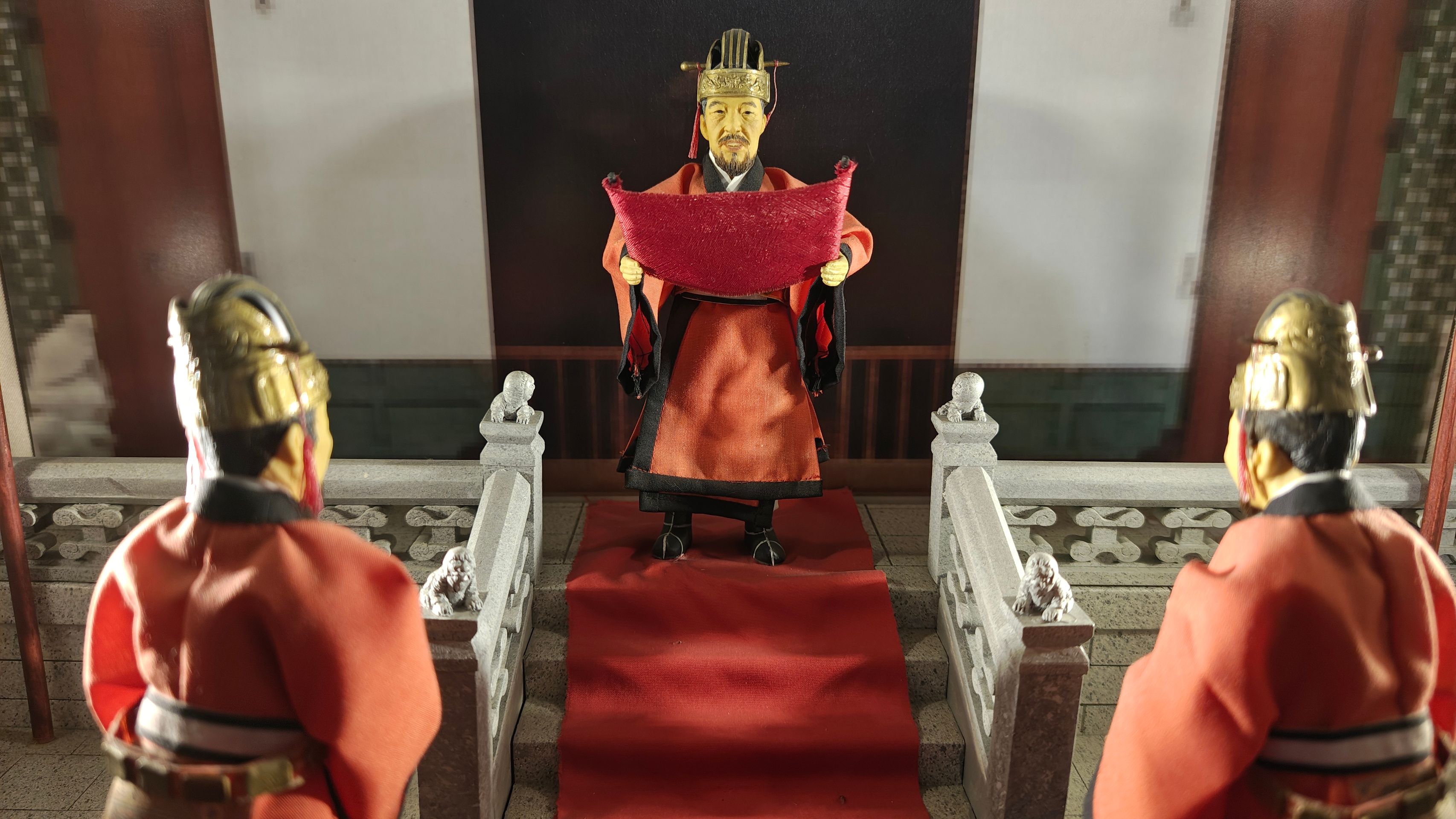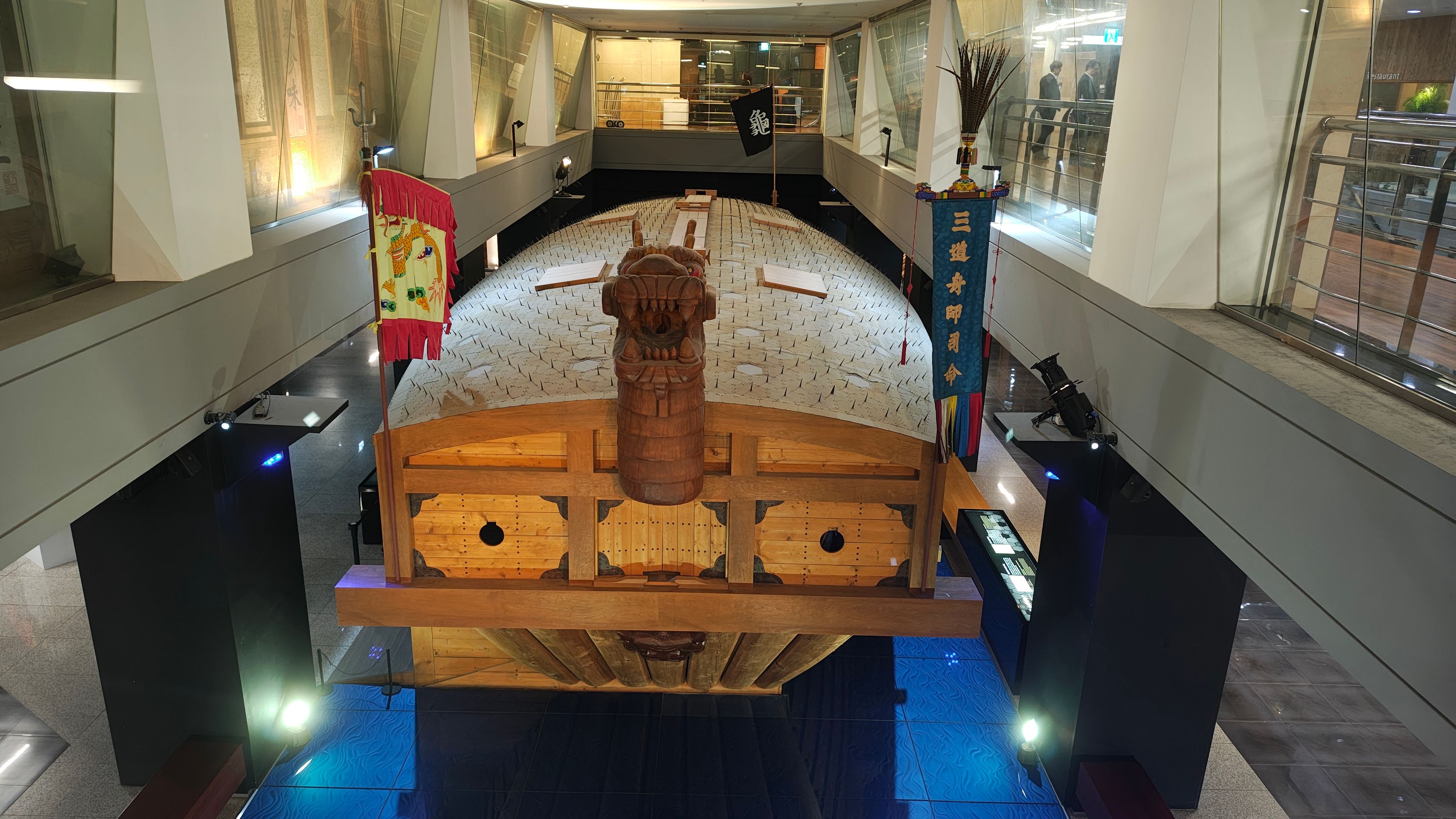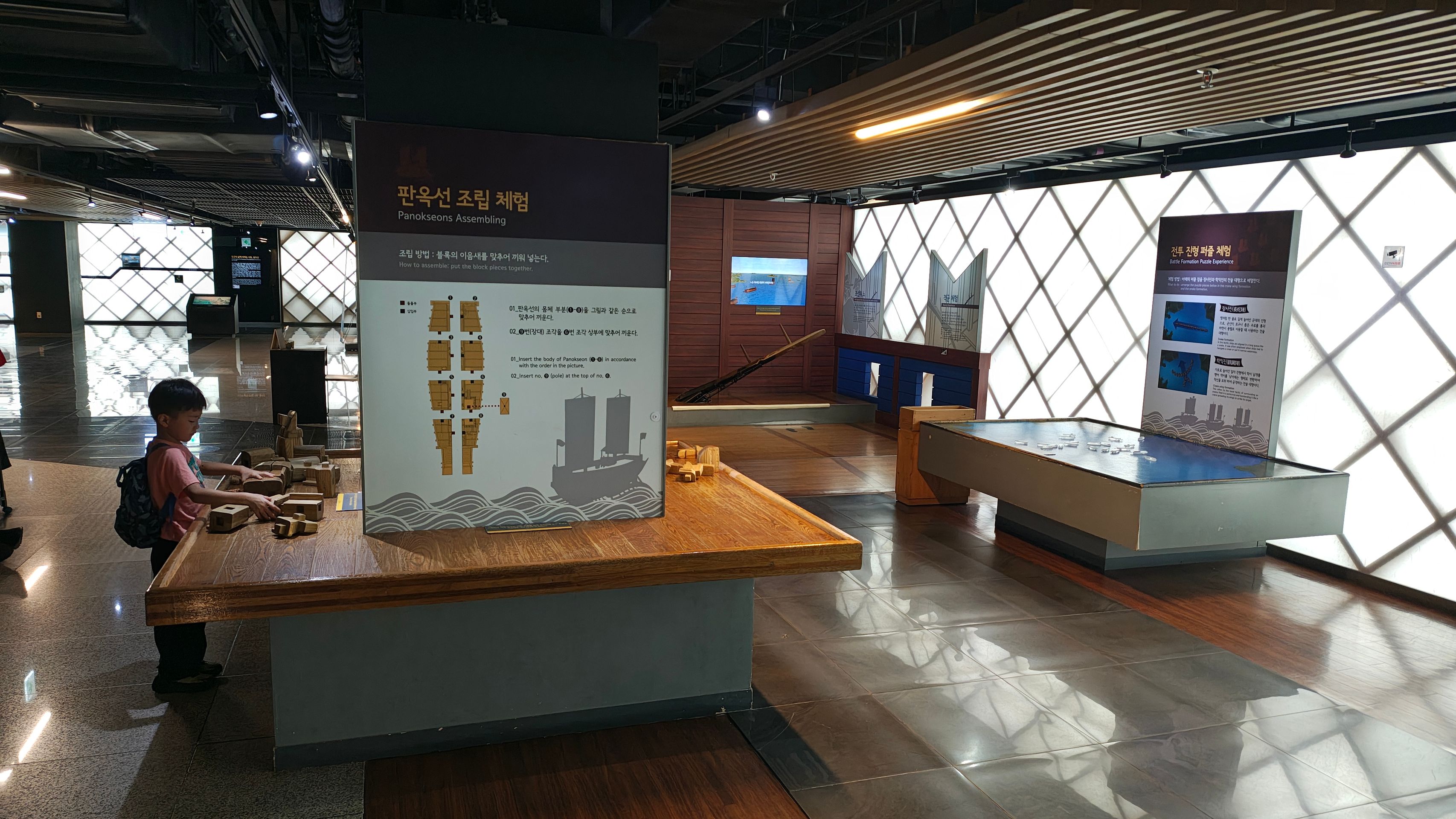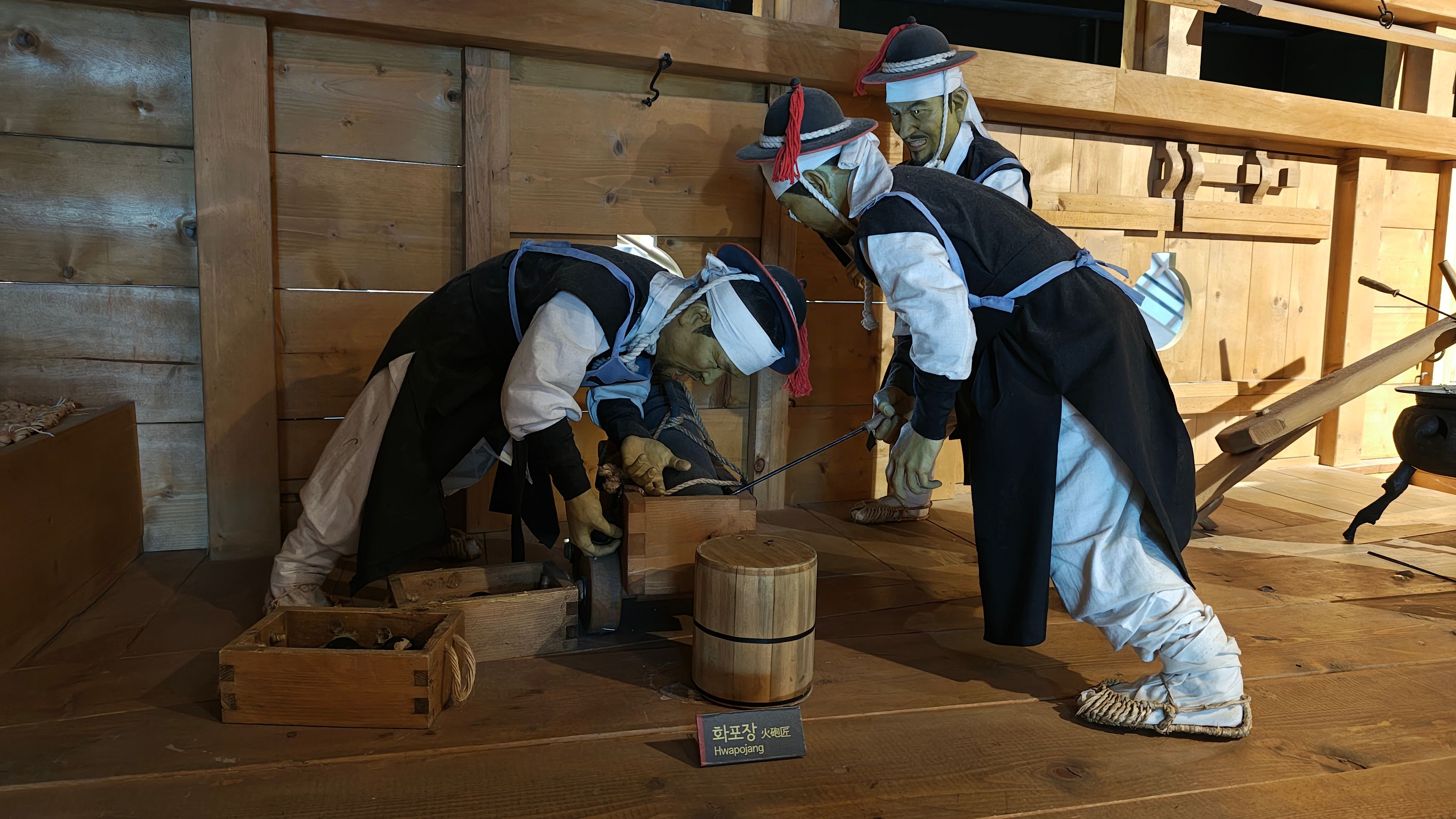 Wer sich mit der koreanischen Geschichte und Kultur beschäftigt, der trifft immer wieder auf zwei Persönlichkeiten, die in ihrer Integrität und ihrem klugen Handeln und moralischen Grundsätzen herausragende Menschen waren. Admiral Yi Sun-sin und König Sejong der Große haben deshalb im Zentrum von Seoul auf dem Gwanghwamun-Platz als große Statuen einen Platz gefunden. Zu diesem Platz fahren wir mit der Metro und tauchen nach ein paar Fotos von den beiden Statuen in die unterirdische Ausstellung über diese beiden Personen ab, welches auch über das Sejong Center nebenan erreichbar ist. Zunächst treffen wir auf die Ausstellung zum Admiral, der in allen seinen Schlachten gegen die übermächtigen japanischen Angreifer siegte und auch ein Tagebuch führte, welches seine Integrität zeigt. Neben seinen taktischen Fähigkeiten hatte er auch ein sehr gutes Gespür für den Aufbau seiner Truppen. Er konstruierte das Schildkrötenschiff, welches neben seiner manövrierfähigen Bauweise und dem Feuerstrahl am Bug auch ein Dach mit Spitzen hatte, worauf das Entern des Schiffes nicht so leicht war. Ein solches Schiff ist in der Ausstellung in einem etwas kleineren, aber begehbaren Nachbau zu sehen. Drinnen sind mit Figuren die Funktion der einzelnen Schiffsbereiche erläutert. Sehr anschaulich und beeindruckend für uns. In den Jahren 1592 bis 1598 kämpfte Yi insgesamt 23 Schlachten gegen die Japaner und gewann erstaunlicherweise alle Kämpfe. Darunter auch die Schlacht von Myeongnyang im Jahr 1597, wo er nur mit 13 Schiffen eine japanische Flotte von über 130 Schiffen besiegte und etwa 30 Schiffe der Japaner vernichtete, ohne ein einziges eigenes Schiff zu verlieren. Diese Schlacht ist militärhistorisch ein absolutes Meisterstück der Taktik und Psychologie. Einige Schlachten sind im Museum durch eine große Videoleinwand erklärt und nachgestellt. Viele interaktive Elemente für Kinder warten auf eine Nachwuchsschar, wobei bei unserem Besuch nur einige Kinder anwesend sind. Dann stoßen wir auf einen jungen Mann, der hinter einem Schreibtisch sitzt und uns freundlich einen Kinobesuch anbietet. Es ist eine 4D-Vorstellung von 12 Minuten und da wir Zeit haben und der Eintritt kostenlos ist, melden wir uns an. Wir schauen noch ein paar Ausstellungsteile an und kehren pünktlich zum Beginn der Show wieder zurück. Ein anderes Pärchen hat sich noch dazugesellt und wir gehen in den kleinen Vorführraum. Ich habe eigentlich 3D-Brillen erwartet, aber die Vorführung beginnt ohne diese Brillen. An einer 180 Grad Wand läuft nun die Filmprojektion und unsere Kinosessel, wo wir uns angeschnallt haben, wackeln mit der Kameraführung hin und her. Nach einem kurzen Testlauf mit einem virtuellen Flug durch Seoul fragt uns der junge Mann, ob allen noch wohl ist. War es natürlich, denn wenn man den Blick von der Leinwand wegwendet, kann man die Illusion stoppen und nur wackelnde Kinosessel sehen. Dann geht es schon in die Schlacht und wir sausen als Feuerpfeile und Schildkrötenschiffe durch das tobende Meer auf die gegnerische japanische Flotte zu. Was soll ich sagen: Wir siegen glorreich. Es ist jetzt nicht das große virtuelle Erlebnis aber ein amüsanter Spaß als Ergänzung zum Ausstellungsbesuch. Siegestrunken spazieren wir hinüber zur Exposition über König Sejong. Sein Grab haben wir ja schon gestern in Yeoju besucht, siehe Blogbeitrag „Der Landesvater der koreanischen Nation und Kultur“. Neben vielen Aspekten seiner Regierungszeit von 1418 bis 1450, wie der schon mehrfach erwähnten wissenschaftlichen Leistungen, steht die Erfindung der koreanischen Sprache Hangeul im Mittelpunkt. Dazu muss man sagen, dass der König selbst diese Sprache entwickelt hat und nicht nur einer seiner geförderten Akademiker. Er wollte die damals verwendeten schwierigen chinesischen Schriftzeichen ersetzen und vereinfachen, damit die einfache Bevölkerung Lesen und Schreiben lernen kann. Schließlich führte König Sejong 1446 das koreanische Alphabet Hangeul ein, was neben der einfachen Schreibweise auch die Formung des Mundes bei der Aussprache in der Darstellung berücksichtigt. Dabei werden einzelne Konsonanten- und Vokalbuchstaben zu Silbenblöcken zusammengefasst. Es ist für mich eine herausragende Leistung, vor allem, wenn man den Grund der Erstellung kennt. Die konfuzianischen Gelehrten waren aber darüber gar nicht glücklich und blockierten die Schrift wo sie nur konnten. Schließlich sahen sie ihre Sonderstellung, die auf ihrer Fähigkeit zu lesen und zu schreiben beruhte, in Gefahr, wenn nun auch das einfache Volk diese Fertigkeiten erlernen konnte. In der Ausstellung sind entscheidende erste Werke ausgestellt, so auch das Hunminjeongeum, was man mit „Die richtigen Aussprache zur Unterweisung des Volkes“ übersetzten kann. Mehrere menschengroße Bildschirme zeigen König Sejong und über Mikrophone kann ich ihm in verschiedenen Sprachen Fragen stellen und er beantwortet nach einem bestimmten Schema diese Fragen. Eine Unterhaltung mit dem König ist eine witzige Idee. Die Ausstellungen der beiden Ikonen beeindruckt durch Technik, Design und Ideen. Voller Eindrücke steigen wir wieder empor zum Gwanghwamun-Platz und schreiten nun direkt auf das Tor des Gyeongbokgung Palastes zu.