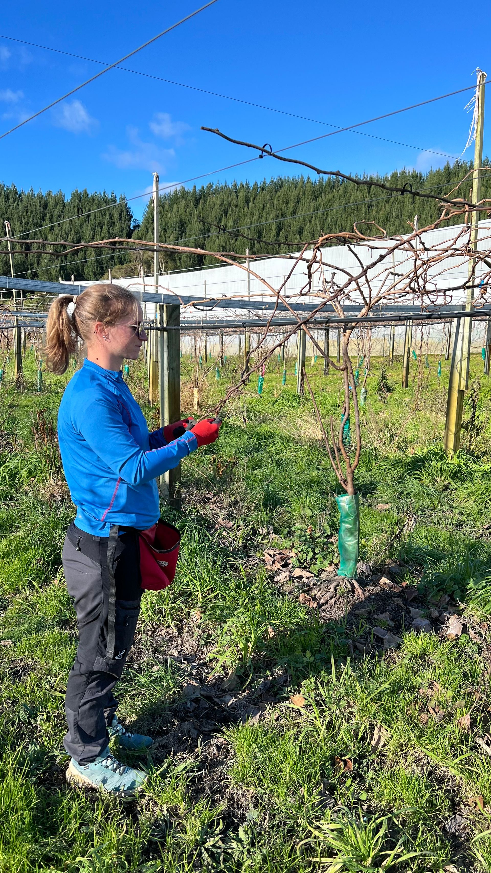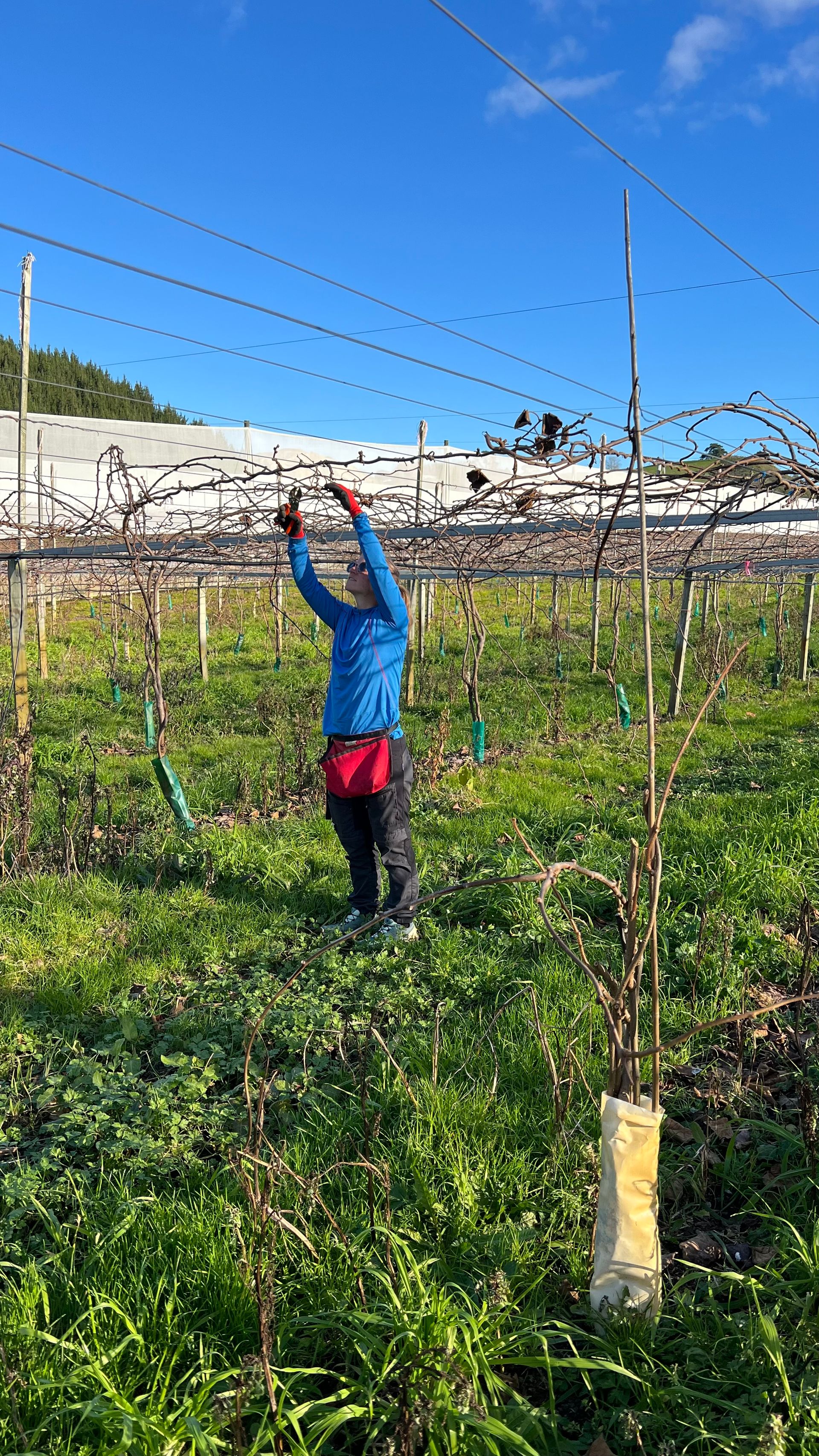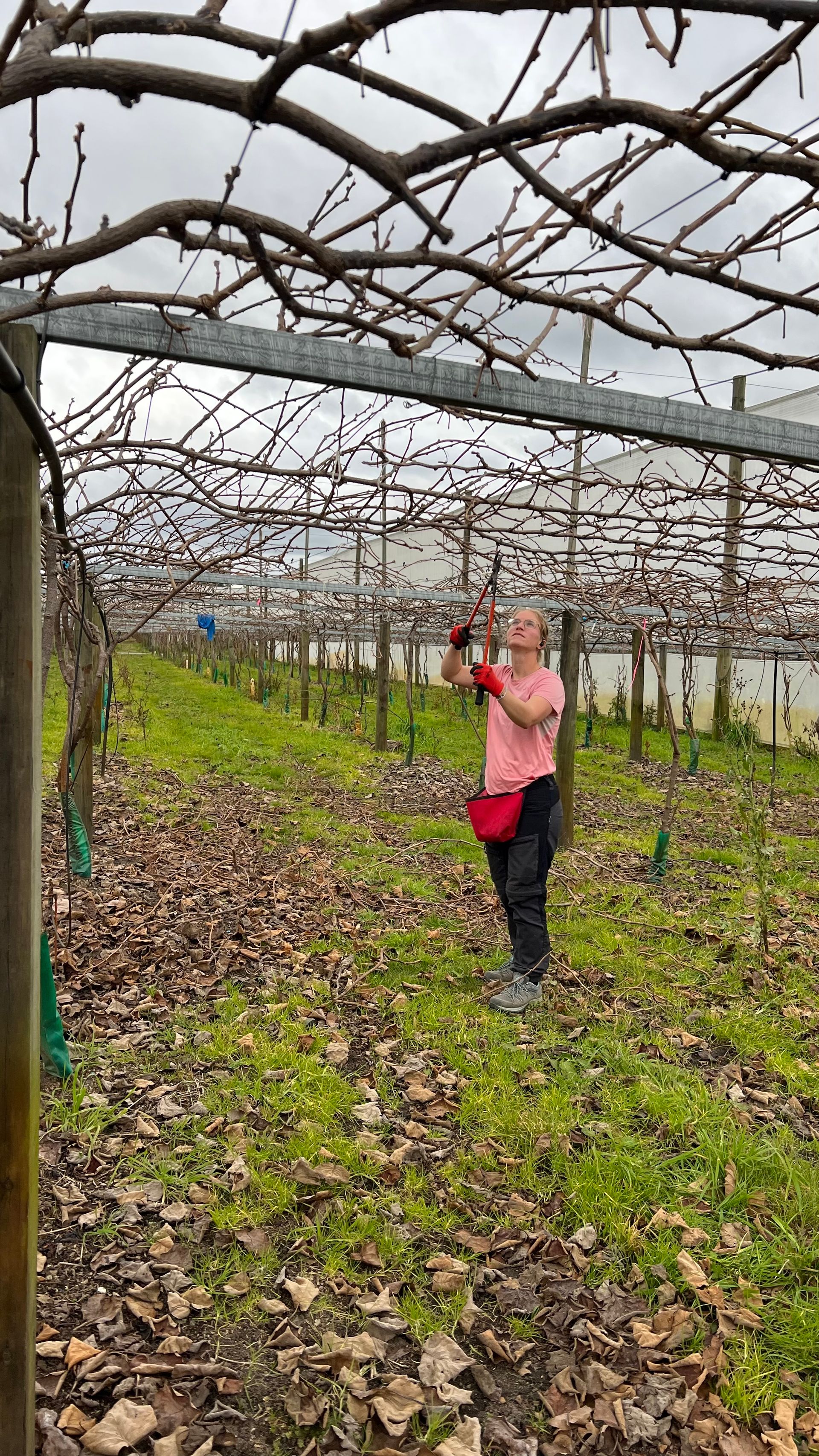 Unsere Hauptaufgabe besteht darin die Kiwi-Pflanzen zurück zu schneiden. Dabei kommt es darauf an zu erkennen welche Äste abgeschnitten werden müssen und welche für sie nächste Erntesaison erhalten bleiben müssen. Es dürfen nicht zu wenige Äste werden, aber auch nicht zu viele Äste stehen bleiben. Im nächsten Schritt müssen die Äste nämlich an den vorhandenen Drähten festgebunden werden. Das Festbinden der Äste erfolgt später und wird von einem anderen Team übernommen.