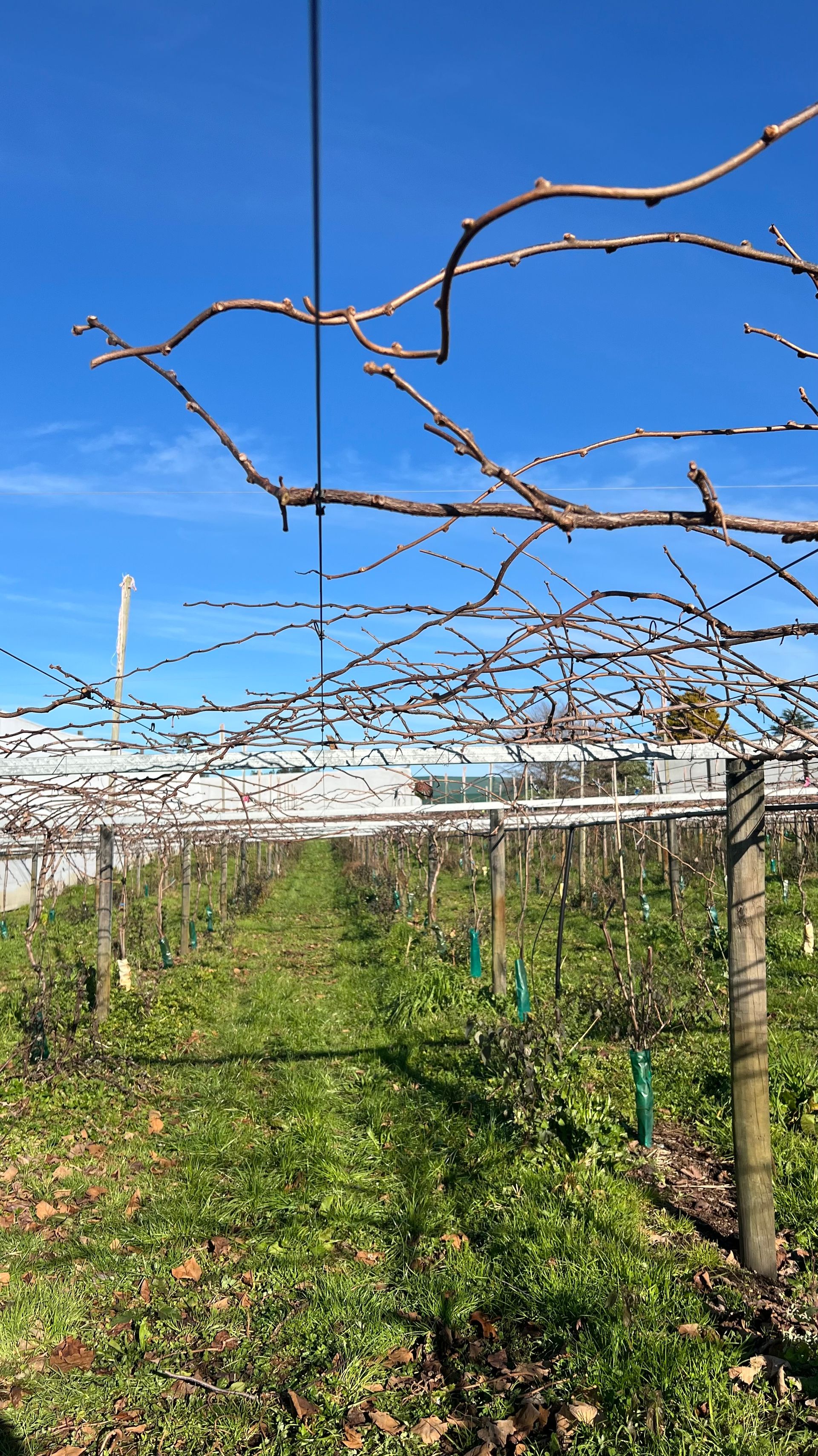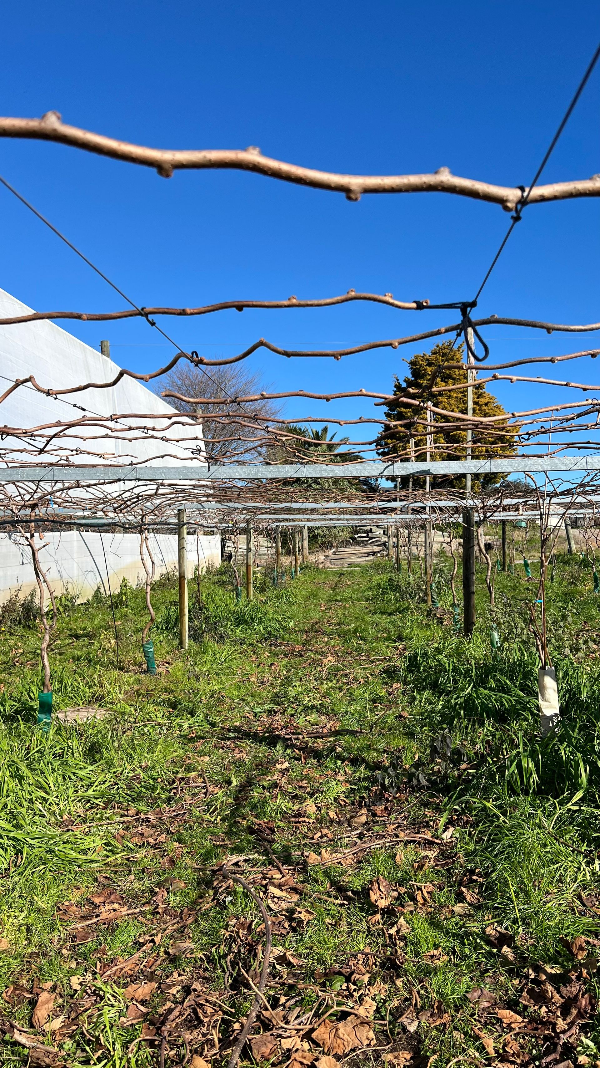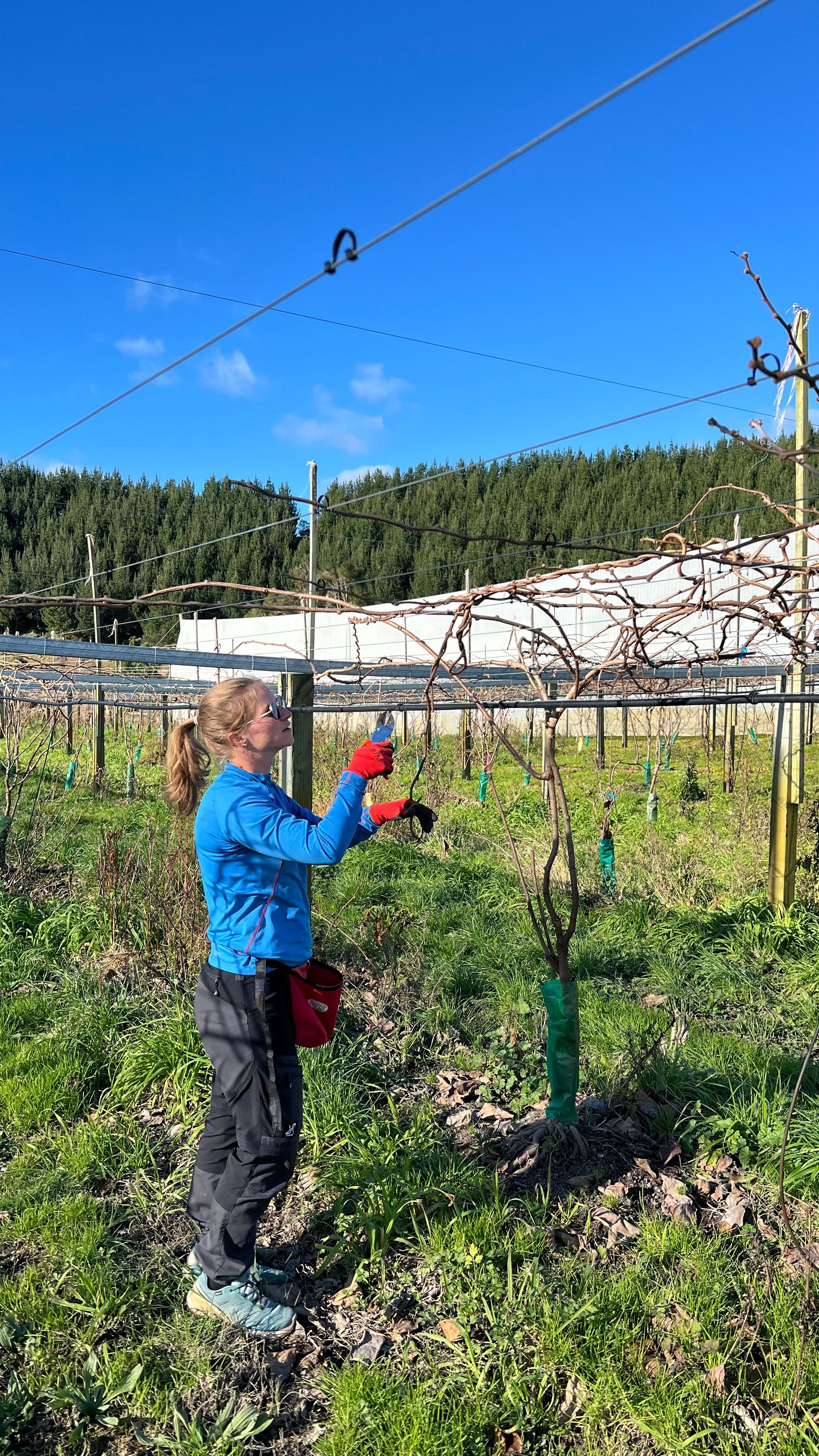 Unsere Hauptaufgabe besteht darin die Kiwi-Pflanzen zurück zu schneiden. Dabei kommt es darauf an zu erkennen welche Äste abgeschnitten werden müssen und welche für sie nächste Erntesaison erhalten bleiben müssen. Es dürfen nicht zu wenige Äste werden, aber auch nicht zu viele Äste stehen bleiben. Im nächsten Schritt müssen die Äste nämlich an den vorhandenen Drähten festgebunden werden. Das Festbinden der Äste erfolgt später und wird von einem anderen Team übernommen.