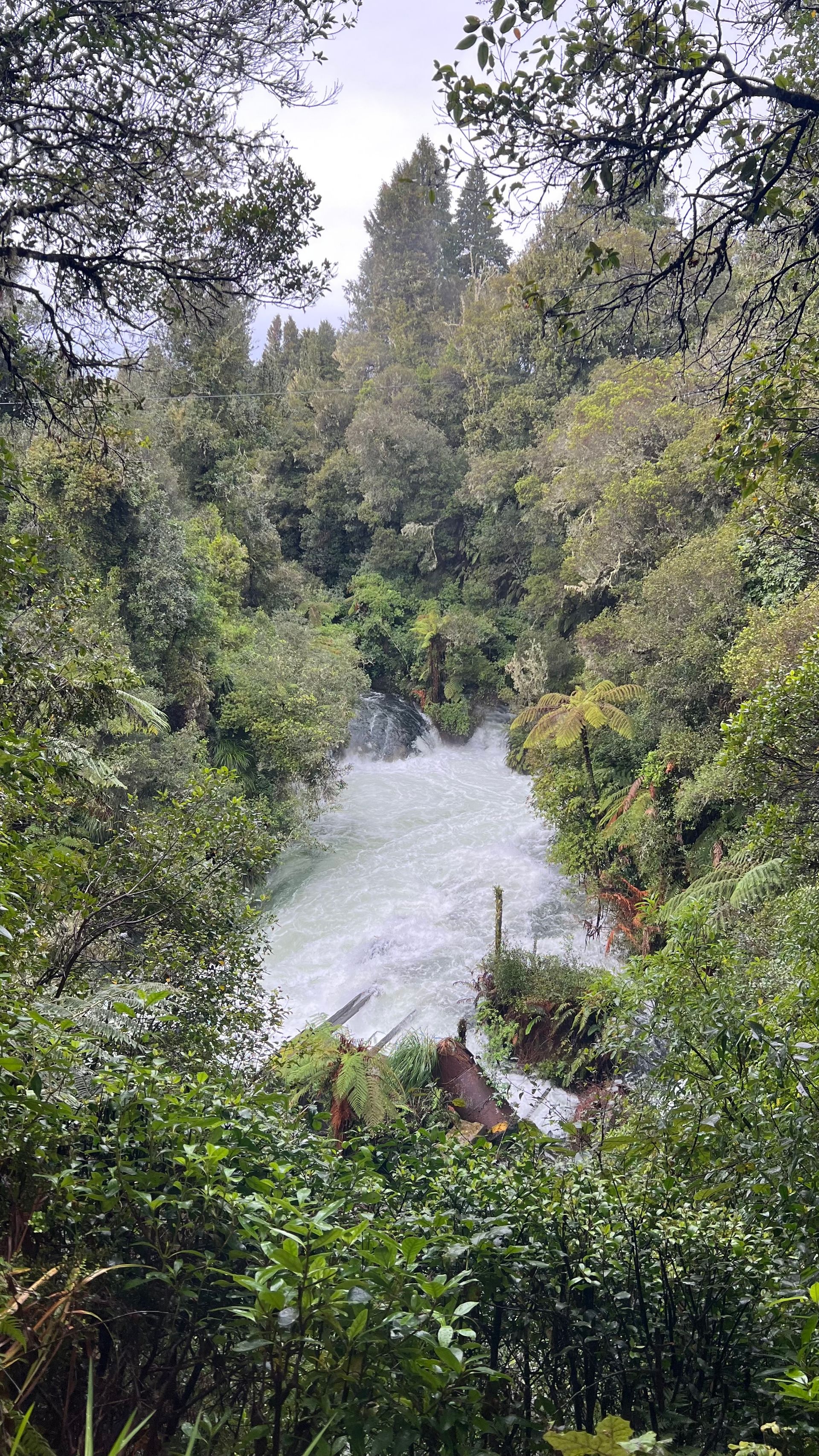 In der Nacht auf Dienstag fing es schließlich an zu regnen und es wollte auch einfach nicht mehr aufhören. Da wir nur bei trockenem Wetter arbeiten können wurde die Arbeit am Dienstag entsprechend abgesagt. Bei starkem Dauerregen verbrachten wir den ganzen Tag in unserem Van. Auch am Mittwoch wollte es immer noch nicht so richtig aufhören mit regnen und so fiel die Arbeit erneut aus. Eine kleine Regenpause nutzten wir für einen kurzen Spaziergang an den Okere Falls, wo wir die letzten beiden Nächte übernachtet hatten. Auf Grund des starken Dauerregens war der Fluss mit extrem viel Wasser gefüllt und der Wasserfall war auch entsprechend stark.