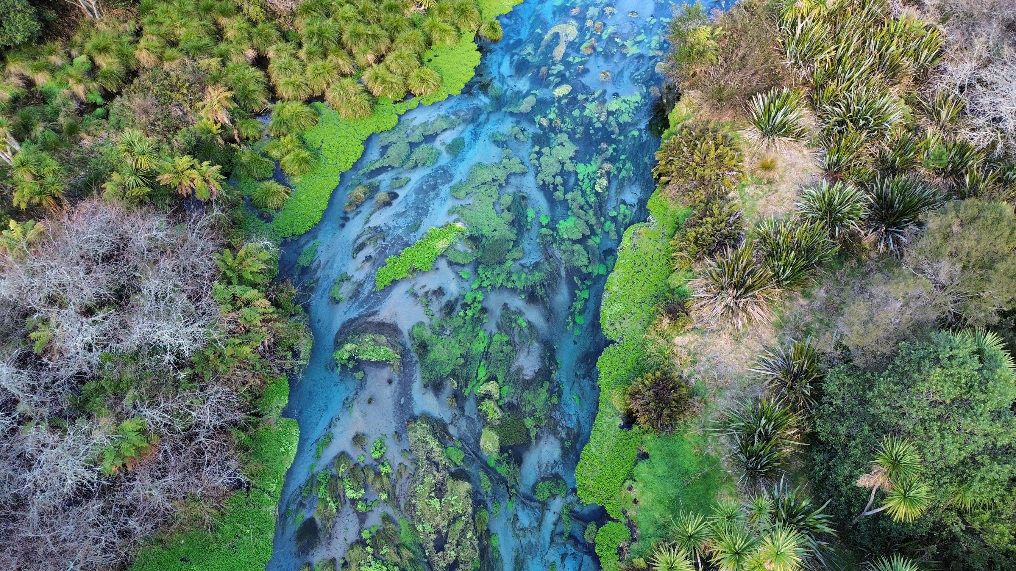 Entlang eines schönes Holzstegs kann man so den Fluss, seine blaue Farbe und die grünen Wasserpflanzen bewundern. Etwas außerhalb des eigentlichen Parks konnten wir die Szenerie auch mit der Drohne aufnehmen.