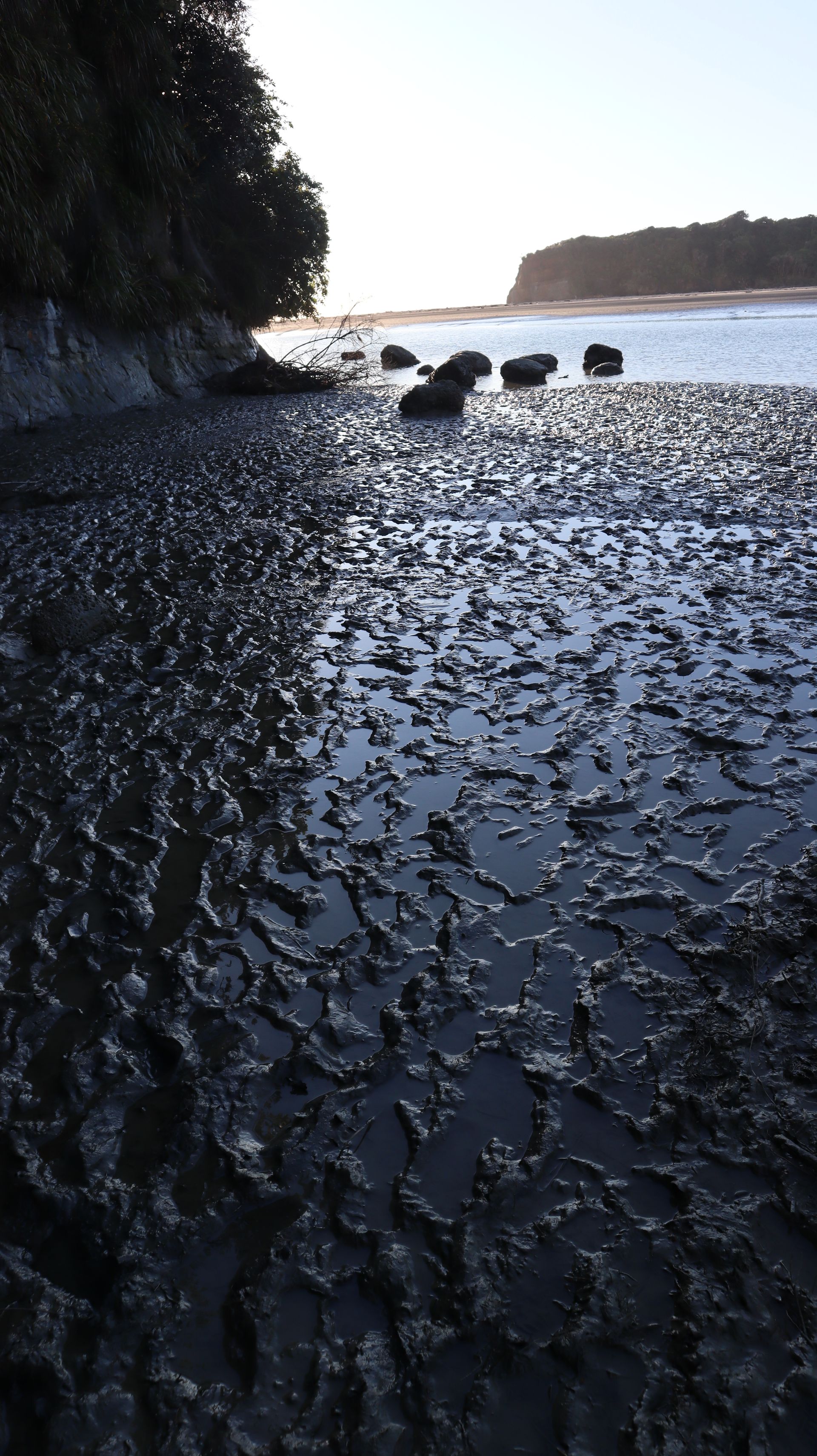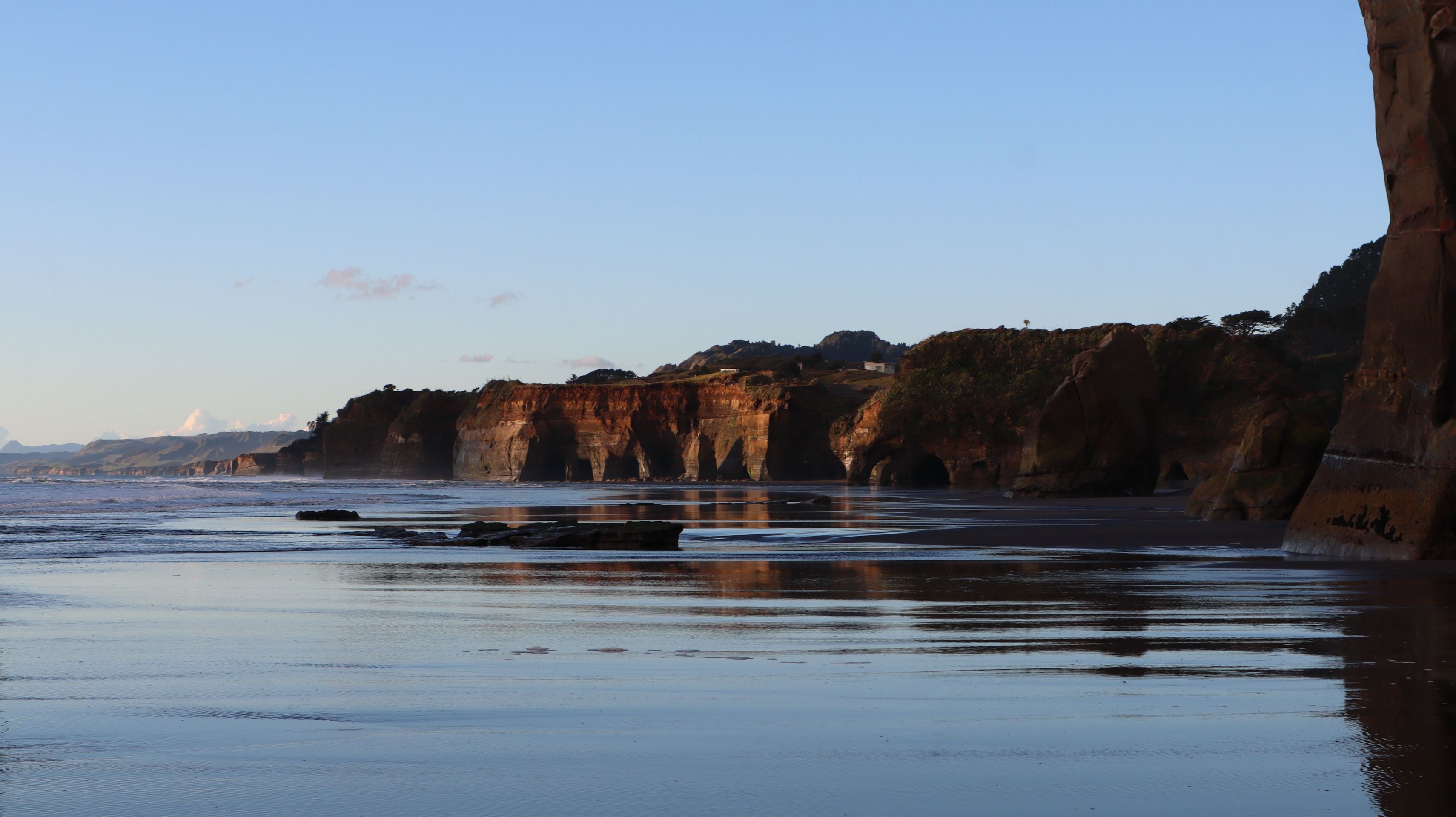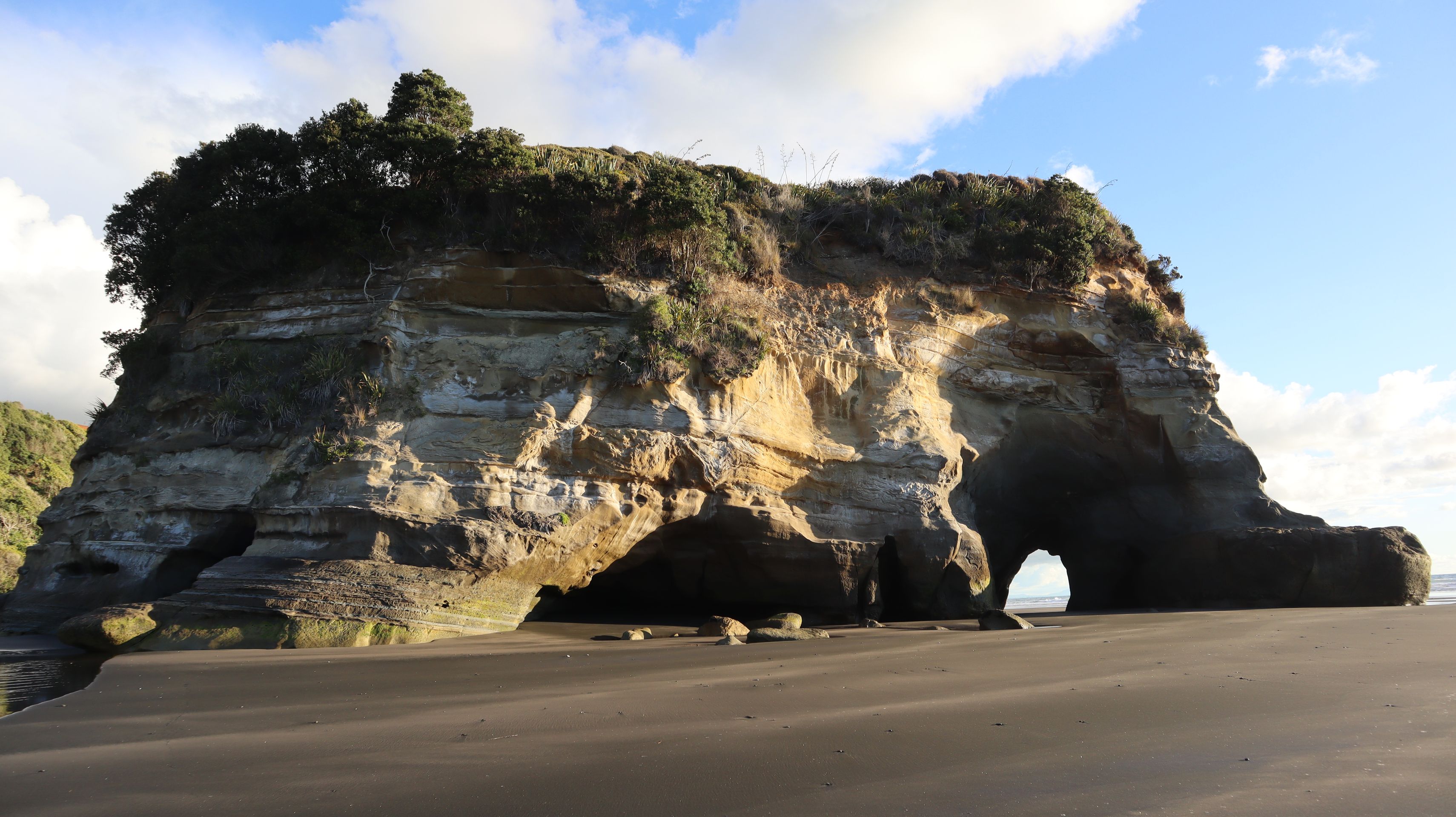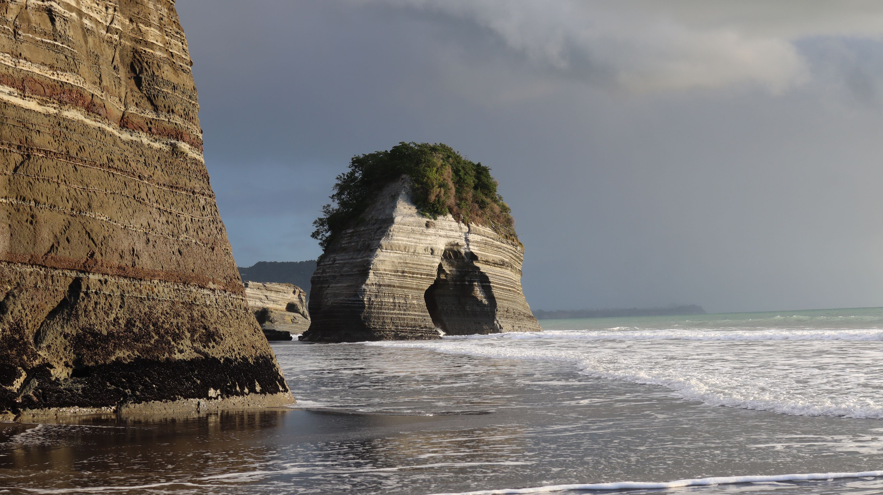 Am nächsten Tag machten wir einen Spaziergang auf dem Waitomo Walkway und dem Ruakuri Bushwalk. Anschließend zog es uns weiter bis zur Westküste der Nordinsel. Wir fuhren ein gutes Stück bis nach Tongapurutu, um dort die Three Sisters und den Elephant Rock zu bestaunen. Diese Felsen liegen am Strand vor der Küste und man kann nur bei Ebbe zu ihnen gelangen. Das wussten wir so genau gar nicht, bis wir dort angekommen sind. Das Glück war allerdings auf unserer Seite und so hatten wir noch eine Stunde, bis die Ebbe ihren niedrigsten Stand erreichte und wir somit genug Zeit. Der Weg dorthin war sehr schlammig und wir mussten uns durch knöcheltiefen Schlamm kämpfen. Belohnt wurden wir mit den tollen Felsen und schöner Abendstimmung durch die untergehende Sonne. Auf dem Rückweg fing es dann an zu Regnen und so konnten wir einen wunderschönen Regenbogen bestaunen, der direkt vor uns aus dem Wasser zu kommen schien. Eine wirklich einmalige Atmosphäre mit Sonnenuntergang auf der einen und Regenbogen auf der anderen Seite.