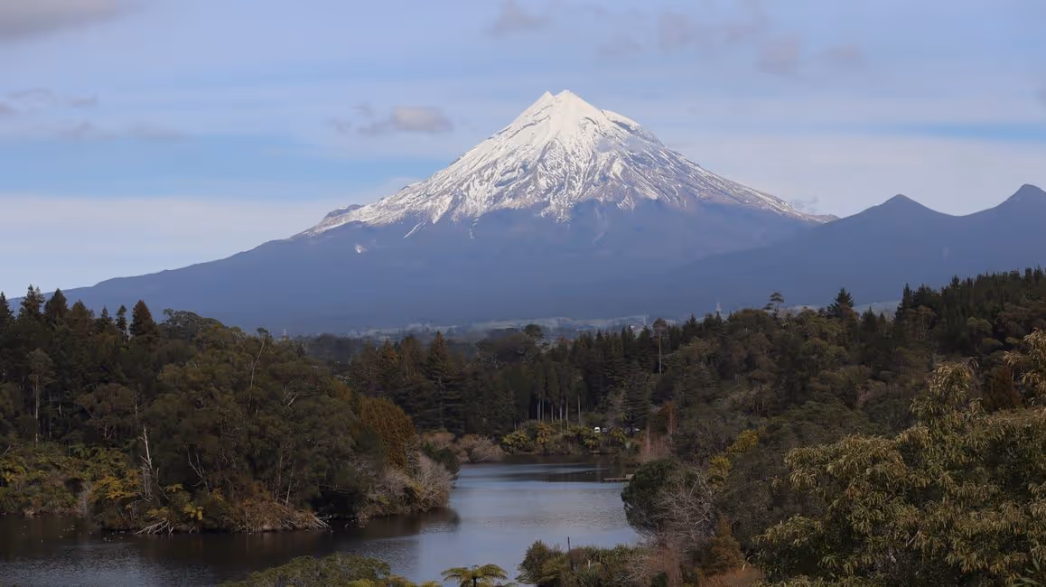 Den schönen Tag nutzen wir, um noch einen Abstecher zum Lake Mangamahoe zu machen. Hier gibt es einen Aussichtspunkt mit Blick auf den Mount Taranaki.