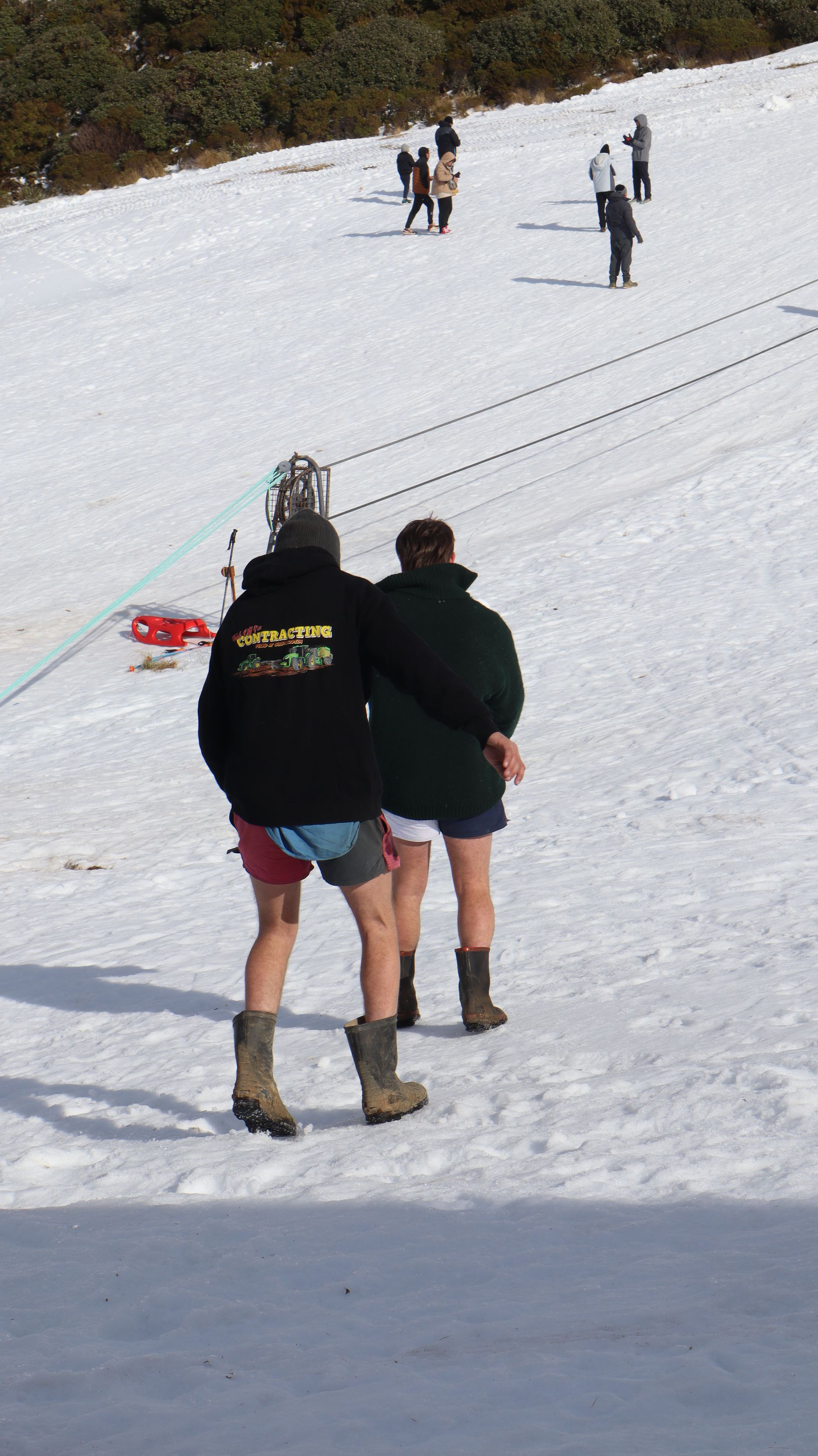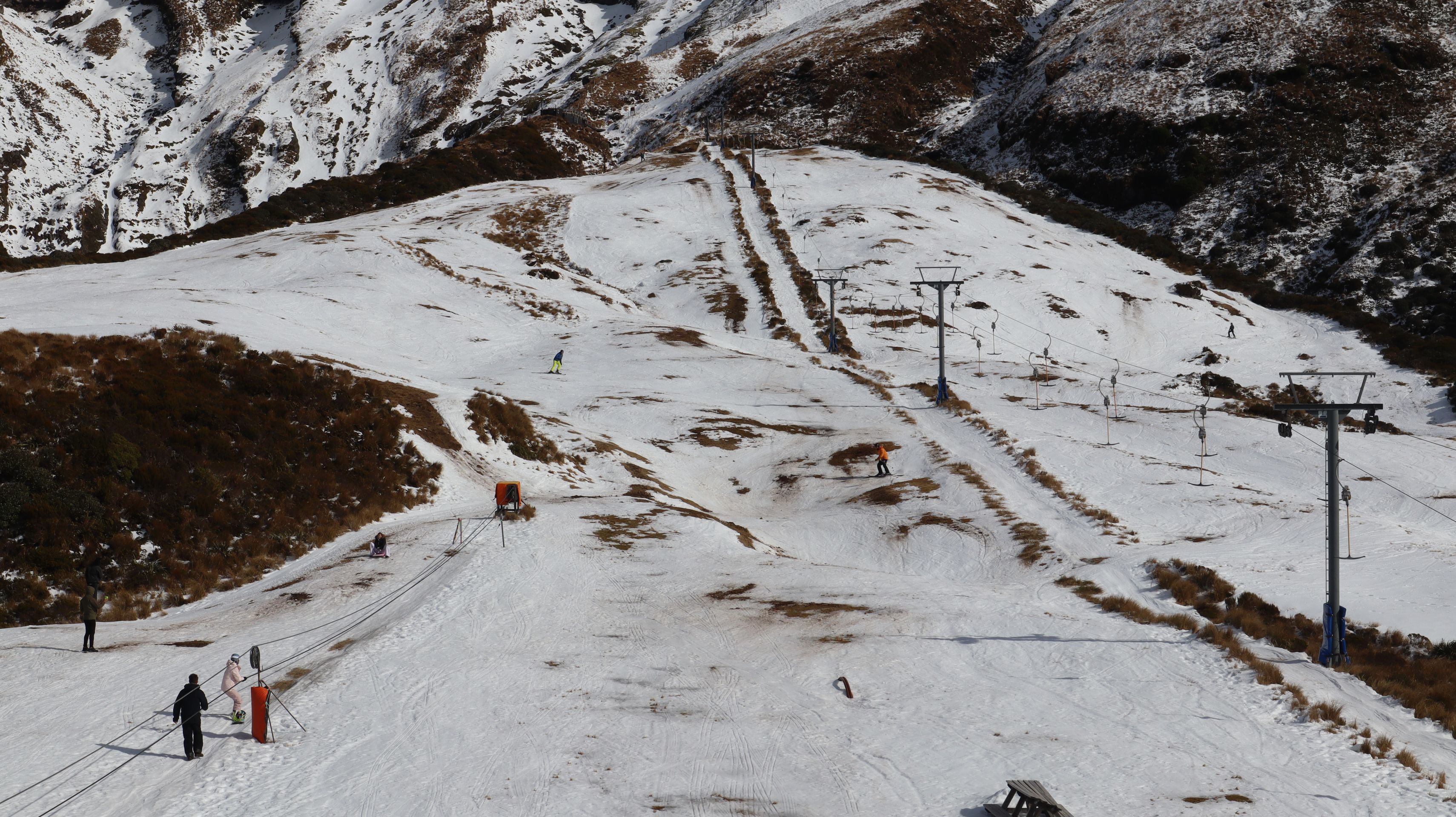 Auch am nächsten Tag wollten wir nochmal zum Taranaki fahren. Genauer zu einem kleinen Ski-Gebiet auf der Ostseite des Gipfels. Bei fast wolkenlosem Himmel war auch hier wieder eine schöne Anfahrt zum auf 1172m gelegenen Parkplatz. Bei bestem Sonnenschein zeigte sich der Gipfel hier in strahlendem Weiß. Die große Hängebrücke über eine Schlucht auf dem Weg vom Parkplatz zum Skigebiet diente als tolles Fotomotiv. Da Samstag war herrscht reger Betrieb und viele Familien waren mit Skiern, Snowboards und Bobs unterwegs.