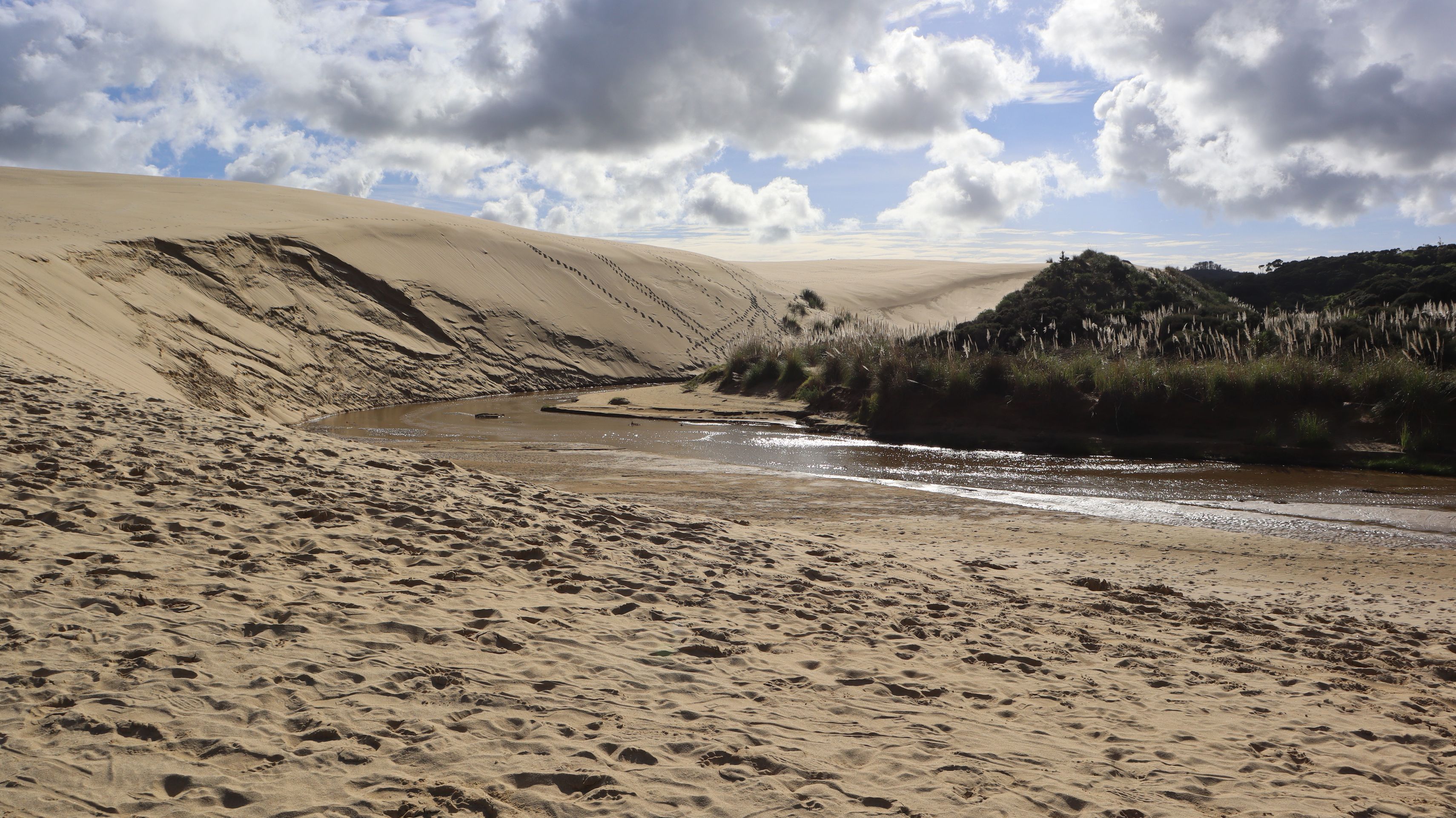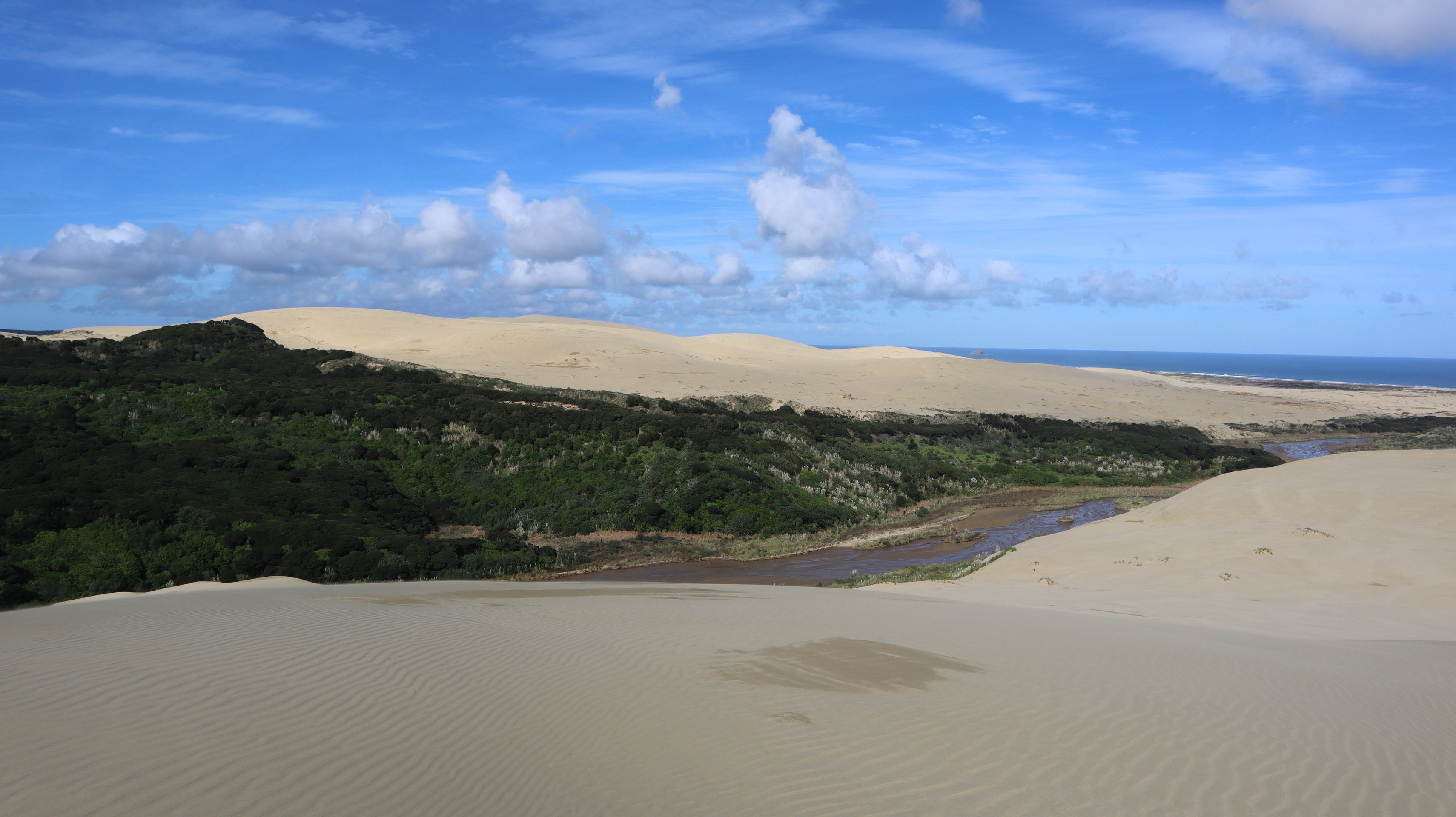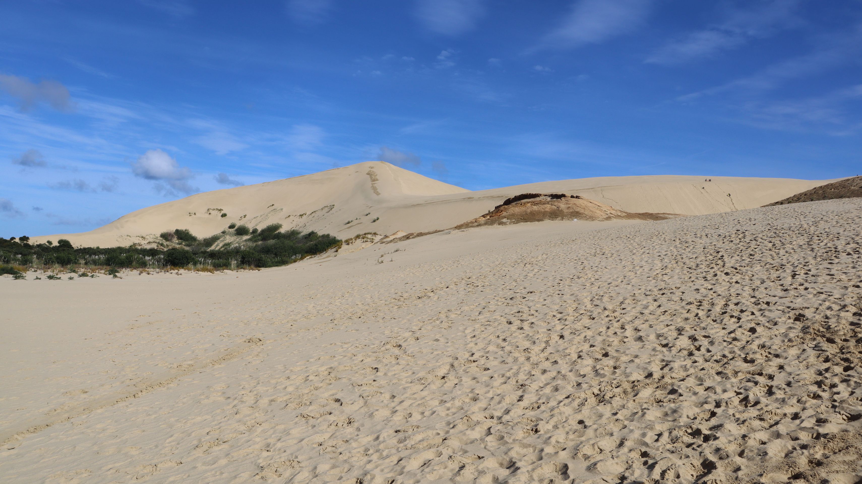 Der nächste Tag hatte ein volles Programm zu bieten. Zum einen war die Fahrstrecke die längste, die wir bisher an einem Tag in Neuseeland gefahren sind. Zum anderen wollten wir nochmal den letzten großen Supermarkt für die nächsten Tage nutzen, um uns mit ausreichend Lebensmittel einzudecken. Nachdem wir das erledigt hatten, ging es für uns fast bis zur nördlichsten Spitze Neuseelands zu den Te Paki Giant Sanddunes. Diese wirklich großen Dünen konnte man schon bei der Anfahrt erkennen. Vom Parkplatz mussten wir zuerst durch ein kleines Flussbett gehen, bevor wir uns an die Besteigung der Dünen machen konnten. Nachdem wir die erste sehr steile Sanddüne erklommen hatten, zeigte sich erst wie groß die Dünenlandschaft wirklich ist. So weit wir blicken konnten war um uns herum Sand. Man kam sich fast wie in einer Wüstenlandschaft vor. Wir liefen über die Dünen, staunten immer wieder über die Größe und genossen die Sonne. Die 90 Minuten auf der Sanddüne fühlten sich in den Beinen wie viele Stunden Wanderung an.