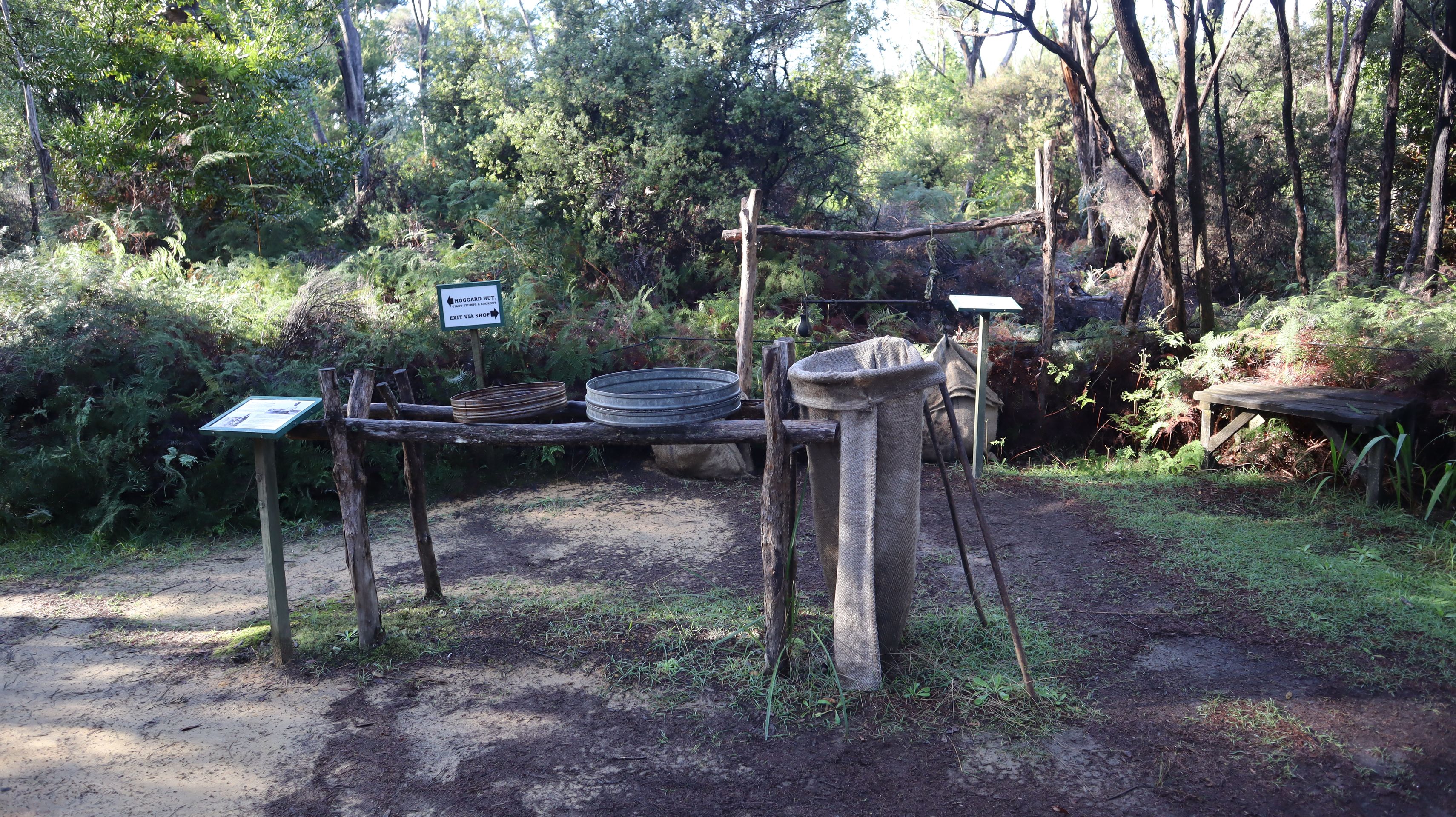 Vom Ninety Miles Beach zog es uns weiter Richtung Süden. Zuerst machten wir einen kleinen Stop im Gumdiggers Park. In diesem Park geht es um die Geschichte der Gumdigger, die an diesem Ort nach Bernstein bzw. dem Harz von Kauri-Bäumen gesucht haben. Der ganze Norden der Nordinsel war früher ein Kauriwald mit Bäumen, die tausende Jahre alt waren. Ein riesiger Tsunami in 1450 zerstörte diesen Wald fast vollständig. Heute gibt es nur noch kleinere Kauri-Wälder. Die Bäume sind oft über die Jahrhunderte im Erdreich versunken. Im 19. Jahrhundert wurde das Harz als Schutzlack für Möbel entdeckt und der Hype begann. Die sumpfigen Waldböden wurden mit Löchern aufgegraben und ähnlich wie beim Gold wurde die Erde gewaschen und gesiebt, um die Harz Brocken zu finden. Noch heute ist dieser Wald von Löchern und Höhlen übersäht. Der Gumdiggers Park befindet sich seit dem 19. Jahrhundert in Familienbesitz. Daher sind in der Ausstellung viele alte Fotos ausgestellt, sowie die Gerätschaften der Gumdigger.