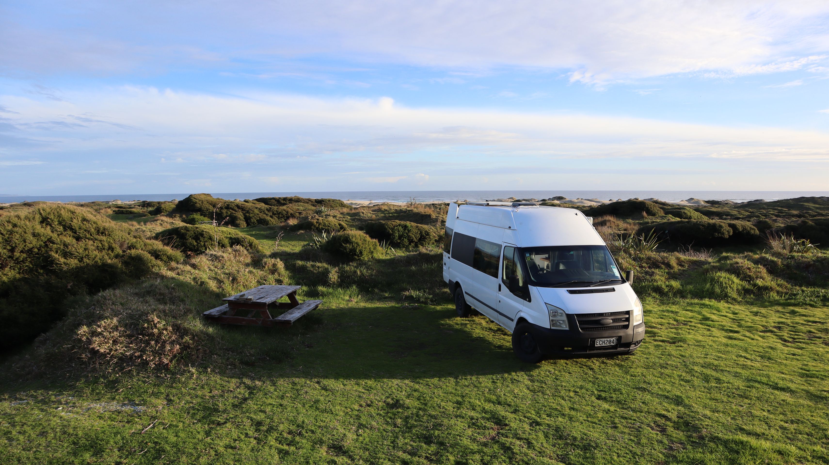 Kleiner Einblick in unsere Übernachtungsplätze: Wir versuchen so viel wie möglich kostenlos zu übernachten. Wildcampen ist zwar verboten, aber auf vielen Parkplätzen ist übernachten erlaubt. Die sind meistens sehr unglamourös: Schotterparkplatz mit öffentlichen (Plumps-)Toiletten, manchmal noch eine kalte (Außen-)Dusche. Wir haben zwar ein Klo im Van, das ist aber mehr so ein Notfallklo. Bedeutet, dass wir zu 99 % auf öffentliche Toiletten gehen. Die sind nicht immer so sauber und hübsch, erfüllen aber ihren Zweck. Teilweise liegen die Parkplätze richtig schön an einer Bucht oder im Naturreservat.